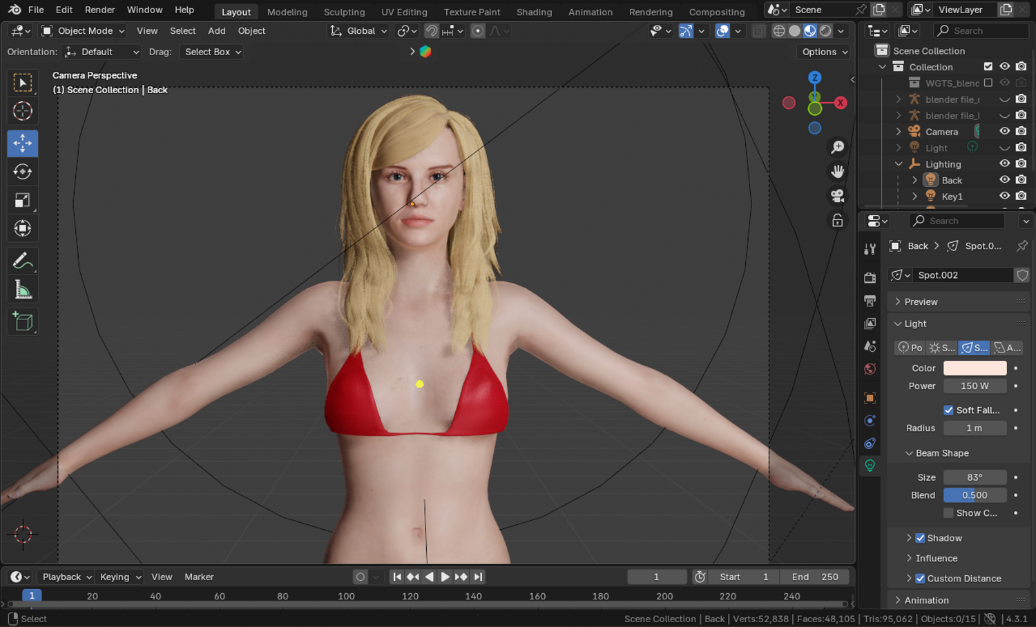 Detailed Design: Realistic skin materials, blonde hair, and a red bikini outfit.