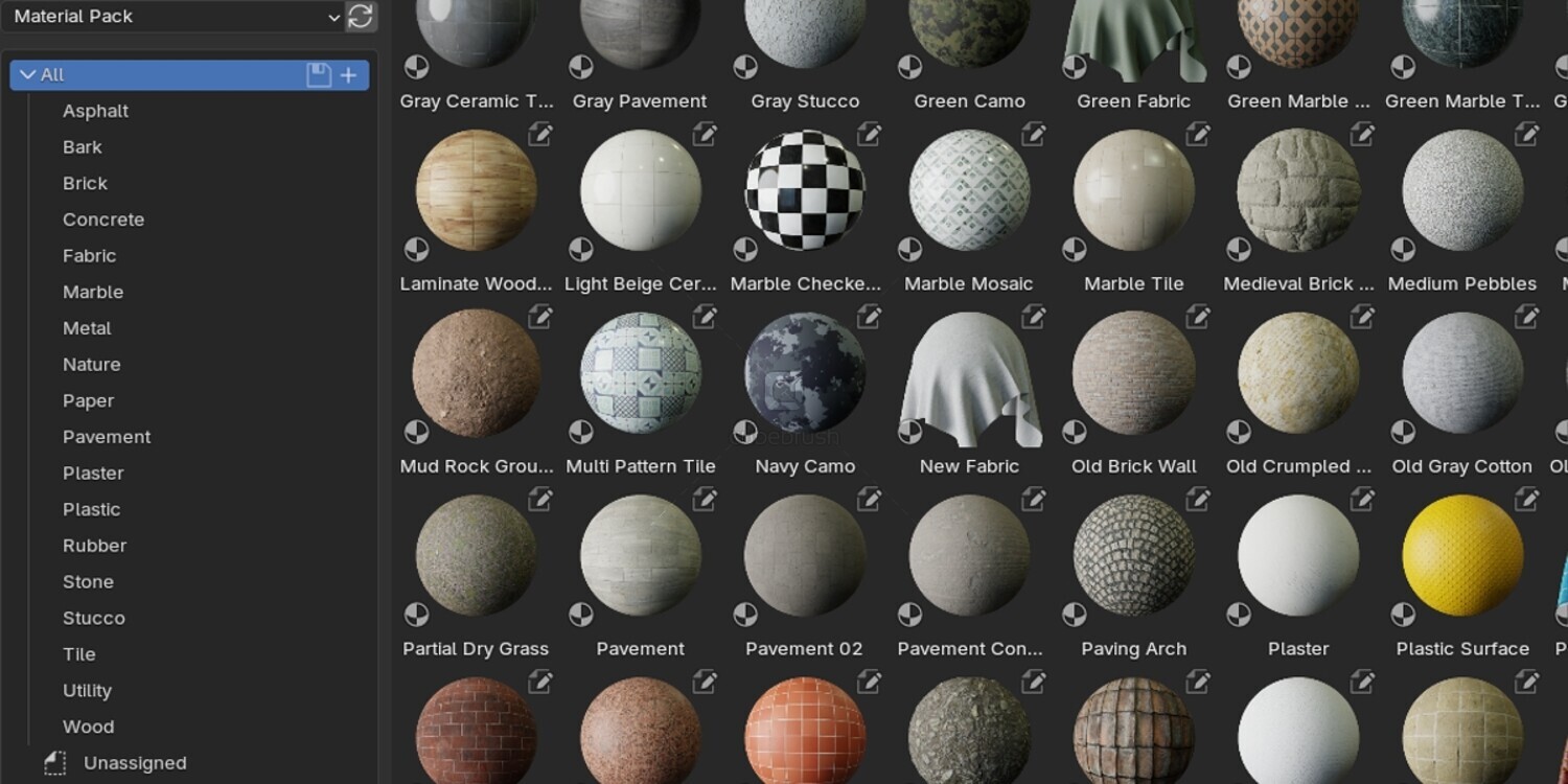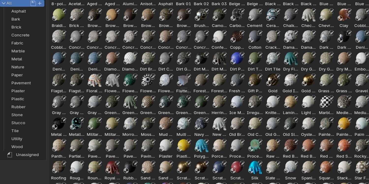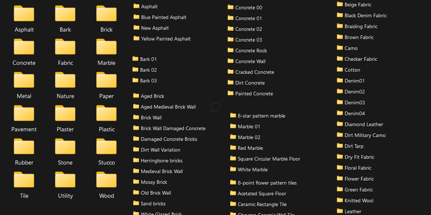 Material Name Resolution Size (original) Size (compressed) Asphalt 4k 162.1 MB 15.6 MB Yellow Tinted Asphalt 4k 47.4 MB 11.1 MB Blue Tinted Asphalt 4k 44.1 MB 10.1 MB Fresh Asphalt 4k 72.1 MB 21.4 MB Bark 4k 74.1 MB 25.3 MB Bark 02 2k 18.9 MB 5.31 MB Bark 03 4k 151 MB 30.7 MB Aged Medieval Brick Wall 2k 22.2 MB 7.17 MB Brick Wall 2k 63.7 MB 5.68 MB Brick Wall Damaged Concrete 2k 55.9 MB 7.25 MB Herringbone Brick 2k 20.7 MB 4.80 MB Mossy Bricks 2k 23.8 MB 6.91 MB Medieval Brick Wall 4k 77.8 MB 17.6 MB Brick Wall Variation 2k 21.7 MB 6.63 MB Sand Bricks 2k 62.8 MB 6.75 MB Aged Brick 4k 224 MB 22.5 MB Yellow Brick 4k 59 MB 15.8 MB Red Brick Zero Joint 2k 58.5 MB 7.80 MB Damaged Concrete Brick 2k 60.2 MB 4.92 MB Old Brick Wall 4k 116 MB 17.8 MB White Glazed Brick 2k 7.18 MB 1.08 MB ZigZag Brick 2k 61.7 MB 5.70 MB Concrete 00 2k 12.1 MB 2.54 MB Dirt Concrete 2k 17.1 MB 4.32 MB Concrete 01 4k 62.5 MB 16.01 MB Concrete 02 4k 56.3 MB 14.05 MB Concrete 03 4k 62.9 MB 17.2 MB Concrete Wall 4k 188 MB 18.3 MB Concrete Rock 2k 18.4 MB 6.10 MB Cracked Concrete 2k 16.3 MB 4.08 MB Painted Concrete 2k 20.4 MB 5.51 MB Painted Rust Metal 2k 12.1 MB 3.34 MB Gold procedural - - Metallic Paint procedural - - Anisotropic Metal procedural - - Aluminum 2k 1.91 MB 1.78 MB Dirt Metal 2k 6.26 MB 3.45 MB Black Iron procedural - - Copper Grid 2k 14.2 MB 2.76 MB Gold Tiles procedural 1.13 MB 0.60 MB Metal Bracelet 2k 9.14 MB 1.86 MB Militar Metal 2k 9.01 MB 3.37 MB Scratched Bronze 2k 17.9 MB 5.32 MB Scratched Copper 4k 115 MB 5.93 MB Scratched Metal 2k 55.5 MB 7.03 MB Dirt Gravel 2k 20.8 MB 5.23 MB Dry Grass 4k 59.1 MB 15.0 MB Dry Ground 2k 19.8 MB 5.33 MB Dry Mud Ground 2k 16.9 MB 4.23 MB Forest Ground 4k 220 MB 31.3 MB Forest Ground Roots 2k 35.6 MB 6.45 MB Grass Rock Ground 2k 36.6 MB 7.69 MB Gravel 2k 18.6 MB 6.03 MB Medium Pebbles 2k 14.4 MB 3.70 MB Grass Pebble 2k 23.4 MB 6.02 MB Mud Rock Ground 2k 33.4 MB 6.81 MB Partial Dry Grass 4k 78.5 MB 24.3 MB Snow procedural - - Wild Grass 2k 24.4 MB 7. 22 MB Wild Grass Rock Ground 2k 35.7 MB 7.25 MB Rocky Ground 4k 223 MB 28.8 MB Dirt PVC procedural - - Plastic Surface 1k 6.54 MB 0,72 MB Bumpy Plastic procedural - - Green Acrylic procedural - - Flutted Plastic procedural - - Rubber Bubble 2k 9.63 MB 2.79 MB Scratched Rubber 2k 5.88 MB 1.73 MB Gift Paper 4k 129 MB 6.97 MB Old Crumpled Paper 4k 37.7 MB 8.94 MB Wallpaper01 2k 1.79 MB 0.95 MB Wallpaper02 2k 18.6 MB 0.88 MB Beige Fabric 2k 32.2 MB 5.38 MB Black Denim Fabric 4k 82.8 MB 28.6 MB Black Leather 1k 8.19 MB 2.79 MB Brown Leather 1k 8.19 MB 2.79 MB Blue Tarp 2k 18.2 MB 3.50 MB Green Tarp 2k 18.2 MB 3.50 MB Brown Tarp 2k 18.2 MB 3.50 MB Camo Tarp 2k 18.5 MB 3.80 MB Braiding Fabric 2k 13.7 MB 3.55 MB Carbon Fiber procedural - - Checker Fabric 2k 21.6 MB 7.33 MB Green Camo 2k 0.40 MB 0.40 MB Brown Camo 2k 0.40 MB 0.40 MB White Camo 2k 0.40 MB 0.40 MB Blue Camo 2k 0.40 MB 0.40 MB Brown Fabric 4k 239 MB 24.7 MB Dirt Military Camo 2k 36.9 MB 3.91 MB Green Denim Fabric 2k 9.88 MB 3.10 MB Militar Fabric 4k 50.1 MB 11.1 MB Denim01 4k 74.0 MB 21.6 MB Denim02 4k 75.2 MB 21.8 MB Denim03 4k 72.4 MB 20.4 MB Denim04 4k 76.6 MB 22.9 MB Cotton 2k 19.5 MB 5.69 MB Diamond Leather 4k 30.7 MB 5.14 MB Dirt Tarp 2k 17.3 MB 4.48 MB DryFit Fabric 2k 11.8 MB 6.10 MB Floral Fabric 2k 33.4 MB 3.29 MB Flower Fabric 4k 121 MB 30.4 MB Knitted Fabric 4k 50.6 MB 18.8 MB New Fabric 2k 17.3 MB 6.65 MB Old Gray Cotton 2k 16.2 MB 4.70 MB Polygon Pattern Fabric 2k 4.26 MB 4.26 MB Royal Fabric 2k 0.50 MB 0.50 MB Silk 1k 1.36 MB 1.36 MB Triangle Pattern Fabric 4k 120 MB 21.6 MB Dark Gray Marble 2k 7.52 MB 2.33 MB Dark Marble 2k 12.1 MB 3.77 MB Ice Marble 2k 10.1 MB 3.20 MB Flower Marble 4k 25.9 MB 8.06 MB Star Pattern Marble 2k 9.38 MB 2.47 MB White Marble 2k 3.86 MB 1.19 MB Beige Marble 2k 12.1 MB 3.77 MB Red Marble 2k 15.7 MB 6.26 MB Raw Wood 2k 14.3 MB 3.91 MB Wood Plain 2k 11.1 MB 3.60 MB Square Pattern Wood 2k 8.77 MB 3.47 MB Tinted Wood 2k 17.1 MB 5.03 MB Varnished Oak procedural - - White Oak procedural - - White Wood 2k 4.43 MB 1.11 MB Wicker Woven Basket 2k 11.1 MB 3.06 MB Wood Chips 2k 19.6 MB 5.62 MB Wood Tiles 2k 34.8 MB 2.98 MB Wooden Floor 01 2k 7.96 MB 2.43 MB Wooden Floor 02 2k 13.1 MB 3.12 MB Wooden Floor 03 2k 8.76 MB 2.70 MB Wooden Floor 04 2k 8.72 MB 2.69 MB Wooden Floor 05 2k 8.70 MB 2.45 MB Wooden Floor 06 2k 11.9 MB 2.78 MB Wooden Floor 07 2k 15.5 MB 3. 75 MB Wooden Floor 08 2k 11.3 MB 7.36 MB Laminate Wood Floor 4k 32.8 MB 9.65 MB Brown Stone Wall 2k 14.3 MB 3.65 MB Clay procedural - - Damaged Stone Wall 2k 16.2 MB 4.58 MB Flagstone 2k 30.7 MB 5.21 MB FlagstoneDryLeaves 2k 36.9 MB 6.49 MB Irregular Stones 4k 230 MB 27.2 MB White Irregular Stone 2k 56.2 MB 5.75 MB Old Slate Roofing 2k 12.9 MB 3.8 MB Spanish Stone Wall 2k 20.6 MB 5.77 MB Stone Wall 2k 15.8 MB 4.62 MB Brown Roofing 2k 32.0 MB 4.0 MB White Stone 2k 16.6 MB 5.39 MB UV Checker procedural - - Brown Paving Arch 4k 202 MB 22.2 MB Paving Arch 2k 14.4 MB 4.0 MB Cobblestone 2k 18.1 MB 5.87 MB Cobblestone Sand 2k 21.1 MB 5.74 MB Concrete Pavement Grass 2k 20.6 MB 5.10 MB Concrete Pavement Mud 2k 20.8 MB 5.13 MB Gray Pavement 2k 18.9 MB 5.12 MB Green Marble Ground 2k 43.3 MB 3.96 MB Pavement 2k 20.3 MB 5.37 MB Round Square Ground Tiles 2k 57.2 MB 4.16 MB Pavement Concrete 2k 21.1 MB 4.98 MB Wet Square Mossy Ground 2k 56.0 MB 6.02 MB Cement 4k 59.5 MB 16.3 MB Pavement 02 4k 133 MB 26.1 MB Chalkboard 4k 60.5 MB 20.1 MB Pantheon Ceiling 2k 60.2 MB 5.40 MB Plaster 2k 10.3 MB 1.81 MB Rough Plaster 2k 12.7 MB 3.90 MB Sand Wall 2k 60.2 MB 5.26 MB Gray Stucco 2k 13.7 MB 3.43 MB White Stucco 01 4k 46.9 MB 14.7 MB White Stucco 02 2k 8.71 MB 1.70 MB 8-point Flower Tile 2k 8.76 MB 1.04 MB Acetated Square Floor 2k 15.0 MB 3.95 MB Blue Porcelain Brick Tile 2k 39.7 MB 3.03 MB Green Porcelain Brick Tile 2k 39.7 MB 3.03 MB Ceramic Rectangle Tile 2k 13.5 MB 3.67 MB Confetti Porcelain Floor 2k 25.2 MB 3.45 MB Chevron Ceramic Wall Tile 4k 36.3 MB 8.95 MB Diamond Marble Tile 2k 29.8 MB 2.48 MB Dirt 