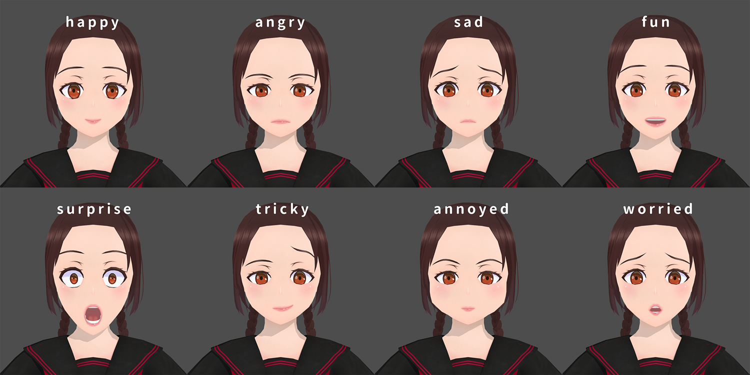 -Facial expression made with Blend Shape. (Blend Shape data are worked properly in vrm file.)