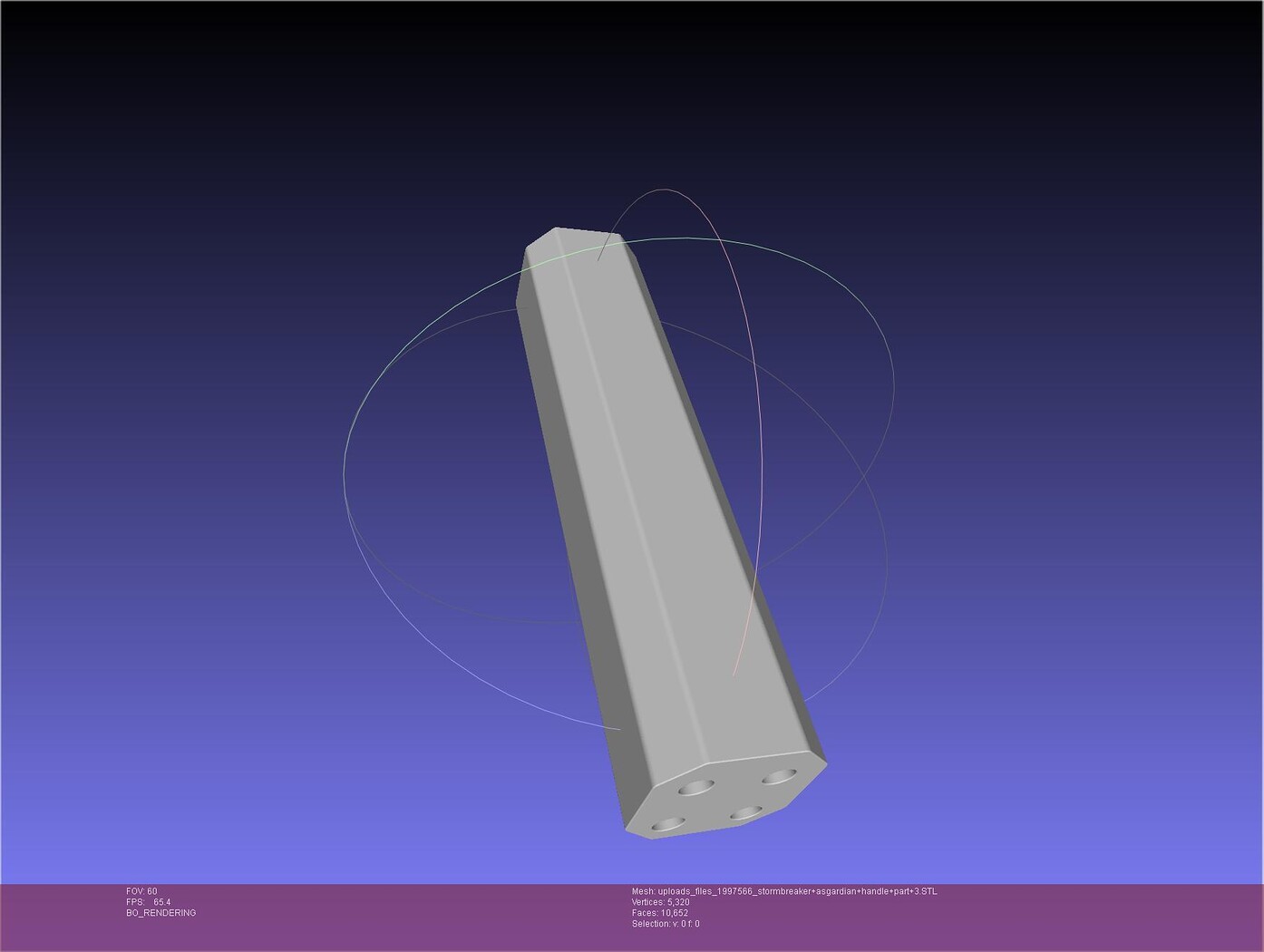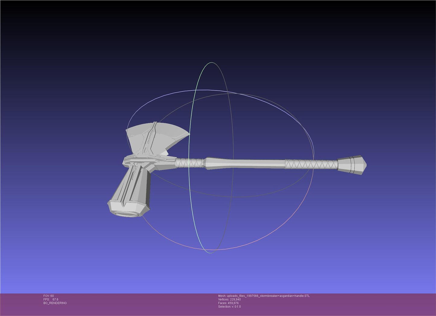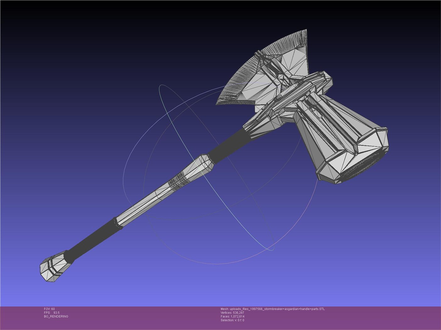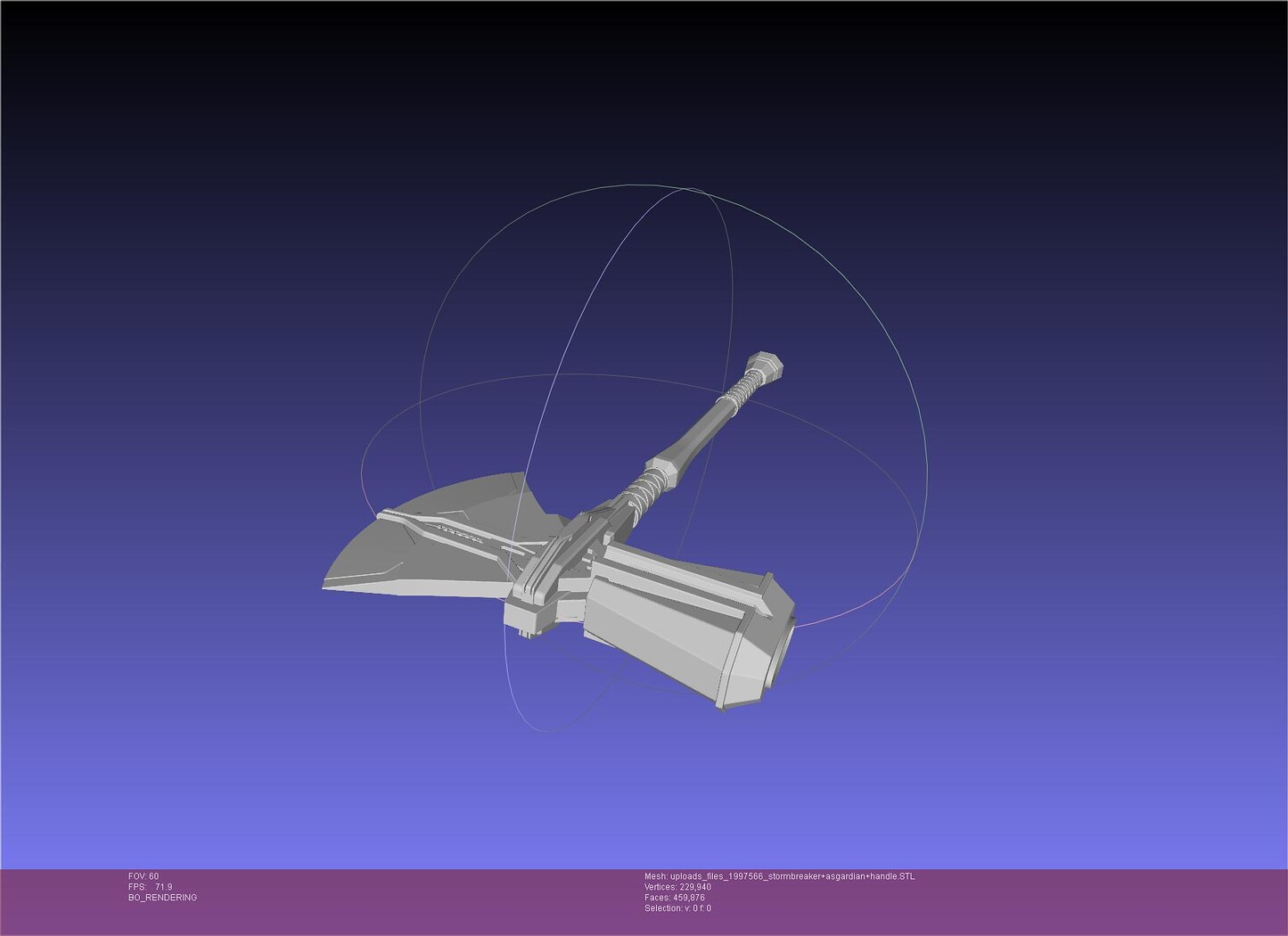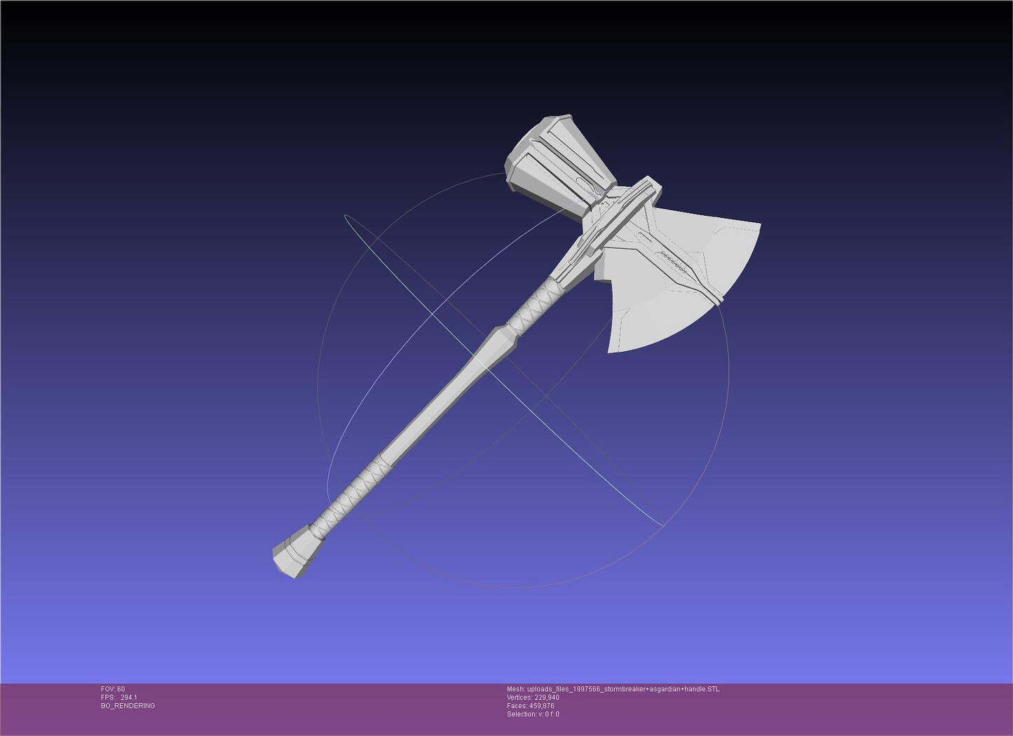 A 3D-model of the Stormbreaker axe / hammer from the Marvel universe in the concept version with an Asgardian handle it includes both a full model as well as a version split up into 10 parts that easily fit into regular 3d printers and can be assembled using 4 1050mm long and 2 440mm long 6mm rods