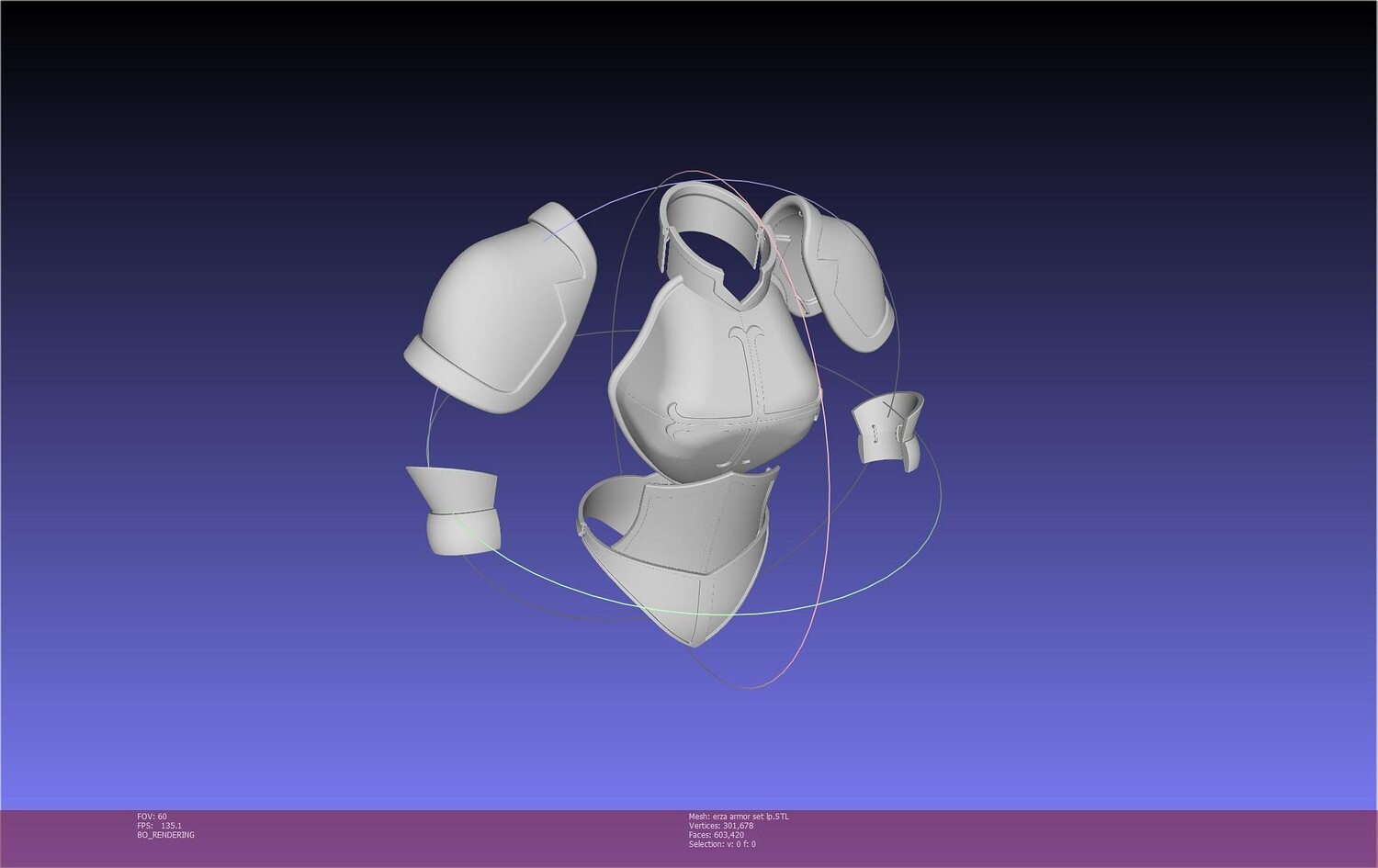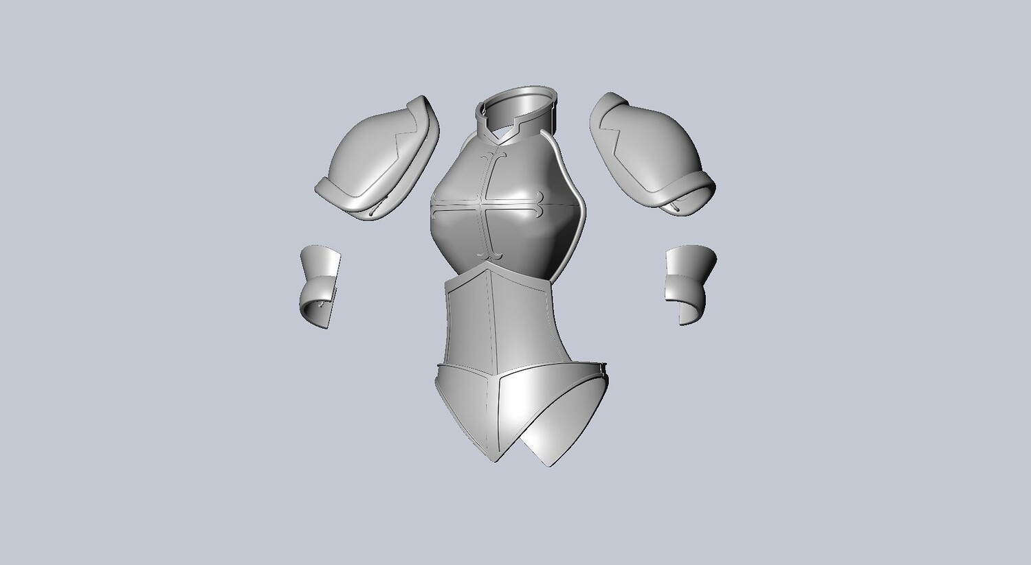A set of 3d-printable armor based on one version of the Heart Kreuz armor used by Erza Scarlet from the anime Fairy Tail, made by comission it includes models for the hip, stomach, chest, neck, shoulder, elbow and wrist armor - hip aromor is identical back and front and arm pieces are symmetrical all pieces are designed to be easily printable even when scaled and stretched - it might require some scaling to fit any wearer the pieces can be worn with straps as seen in the reference and plastic foam cushioning