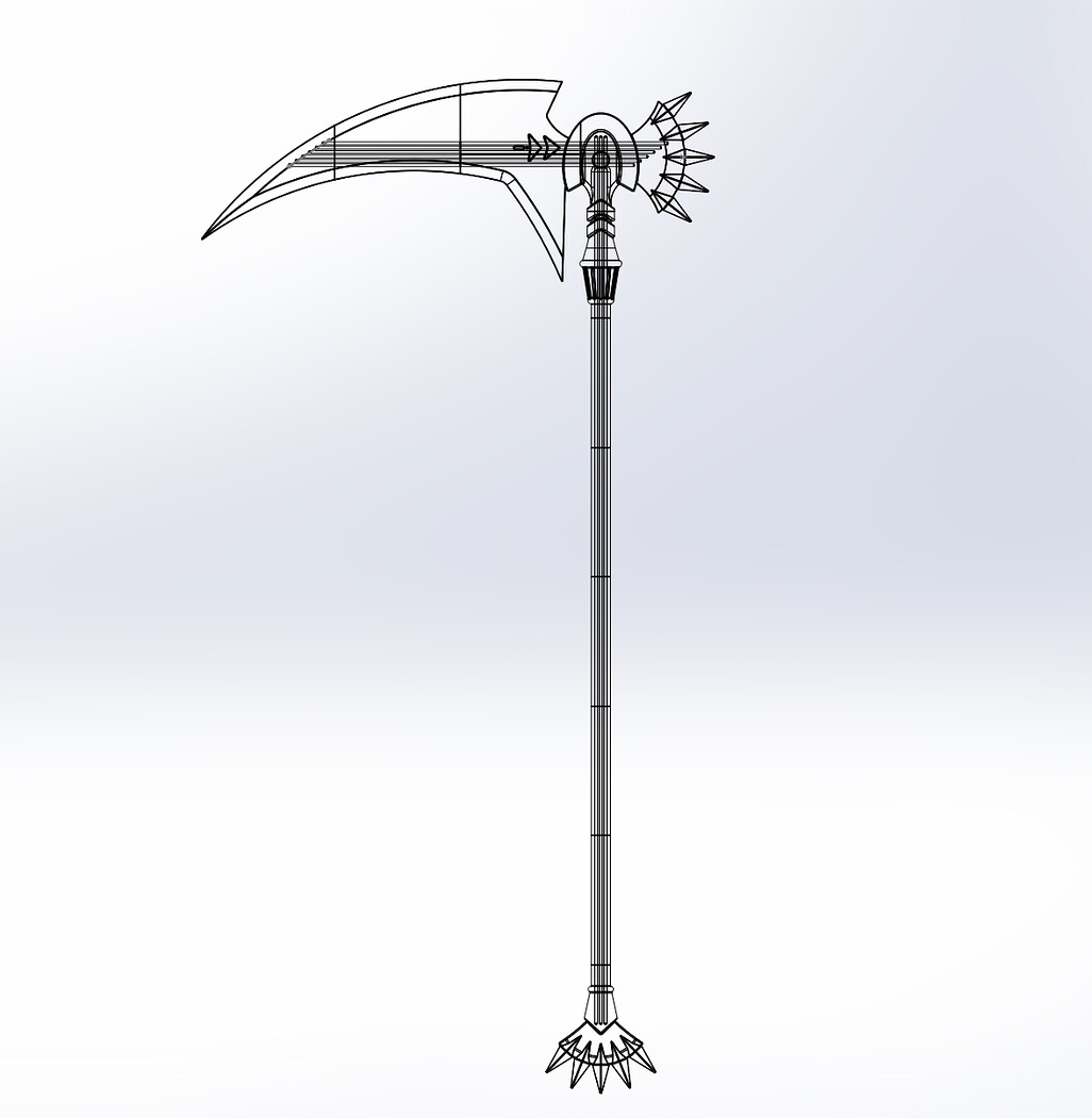 A 3d-printable model of the Vassal Scythe used by the character L'Arc Berg from the anime "the rising of the shield hero" The scythe is about 152cm tall and the blade is about 54cm long The model is designed for 3d-printing and includes botha full model and a version split up for easy printing and assembly in 8 different parts while part 7 should be used 5 identical times since it just makes up the main staff - the assembly can be put together with 6 510mm and 6 1320mm long 4mm diameter support rods the model can be scaled and stretched easily and remain well printable although the support rods have to be sized accordingly, also the height of the scythe can be varied independently of the blade length by stretching the part 7 or using more or fewer of them