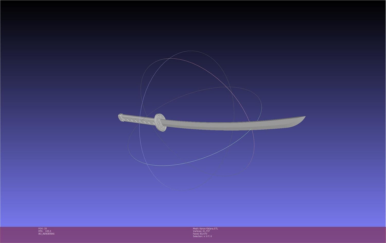 A 3d-printable model of the katana used by Kanao from the anime Demon Slayer made by commission this includes both a full version and one split into 7 parts for assembly with 2 bent 1 meter long 4mm support rods as well as various filetypes