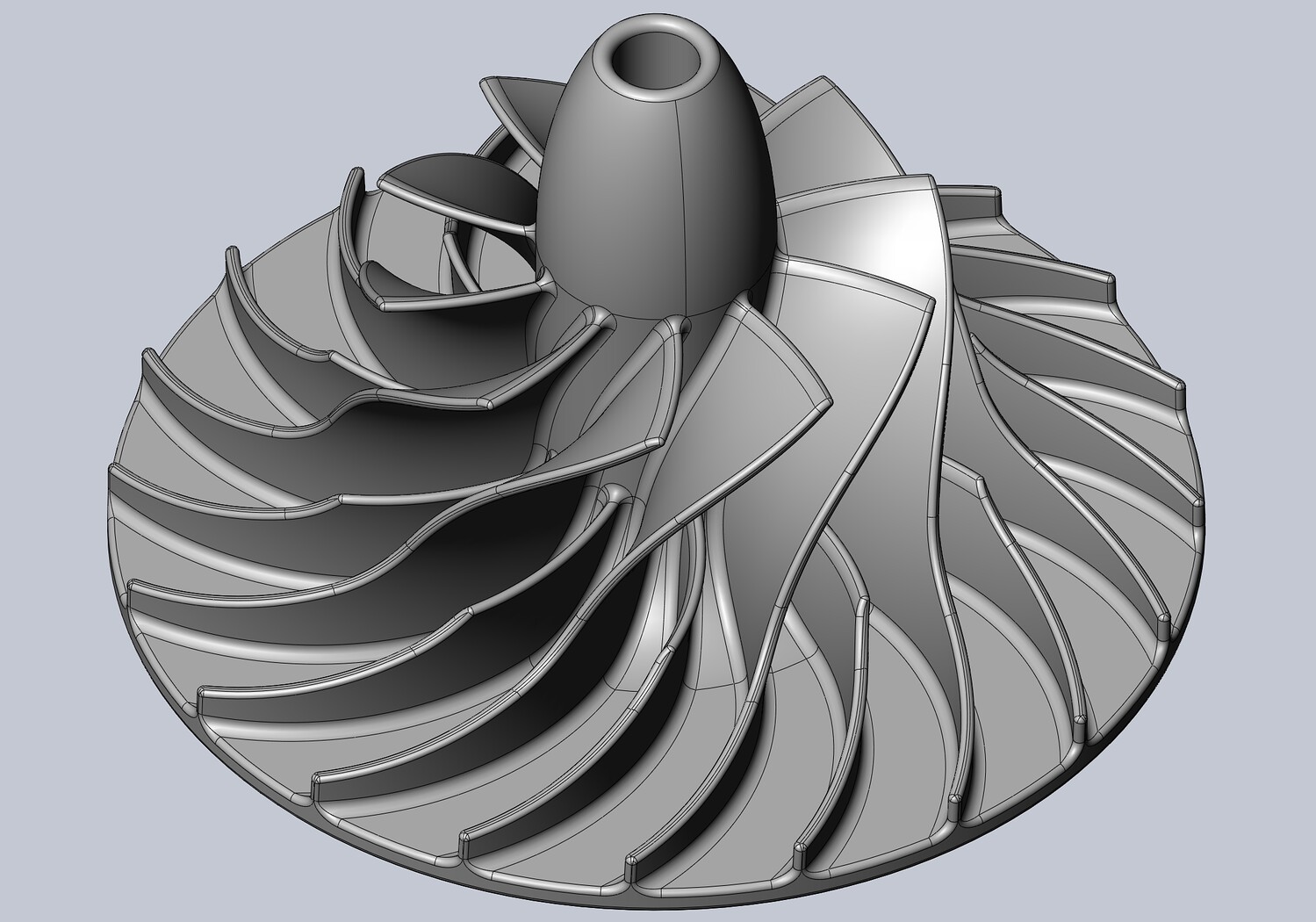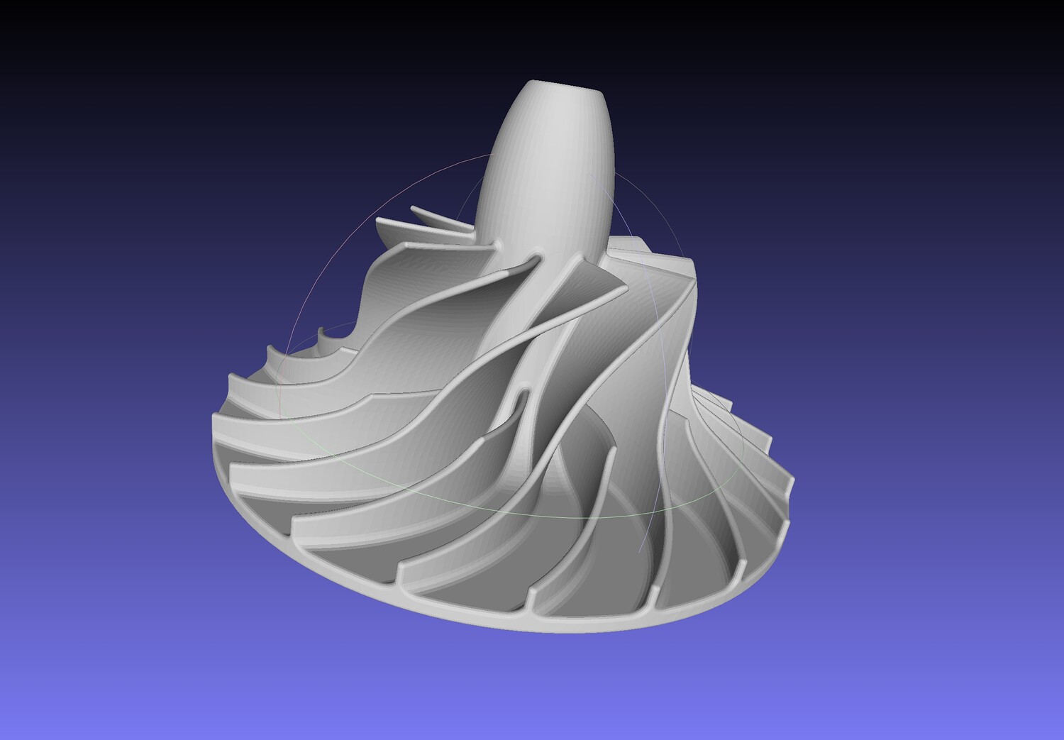 A model of a radial compressor impeller similar to those used in rocket engine turbopumps the model has a diameter of 200mm but can be scaled down and stays well printable down to below 50mm this includes solid files like Parasolid as well as high poly STL and low poly mesh files which can leave visible polygon borders but are easier to handle for slicers