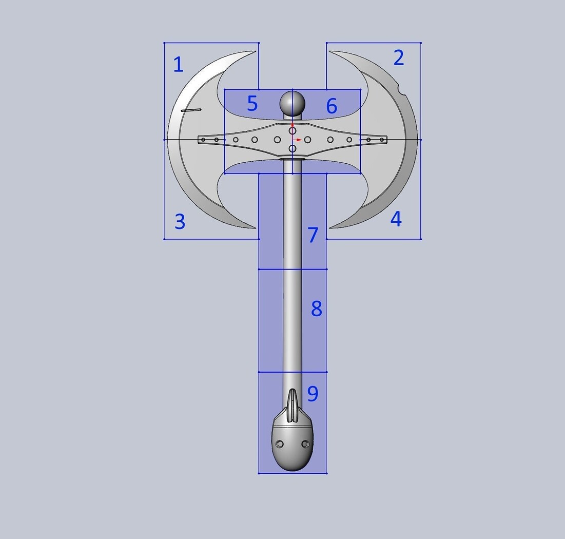 A 3d-printable model of the battle axe used by Astrid from the "how to train your dragon" animated movies the model includes a full version as well as a version with spaces for two 560 and two 930 by 4mm support rods and one precut into 9 parts for easy printing with almost no supports and practical assembly the model can be scaled for any user but if support rods are being used htey have to be sized roughly accordingly the axe is 1080mm long in total
