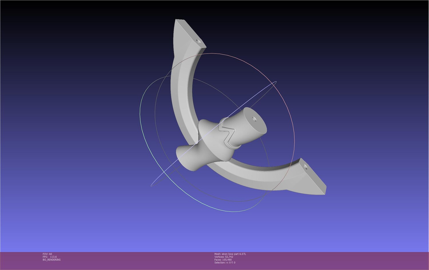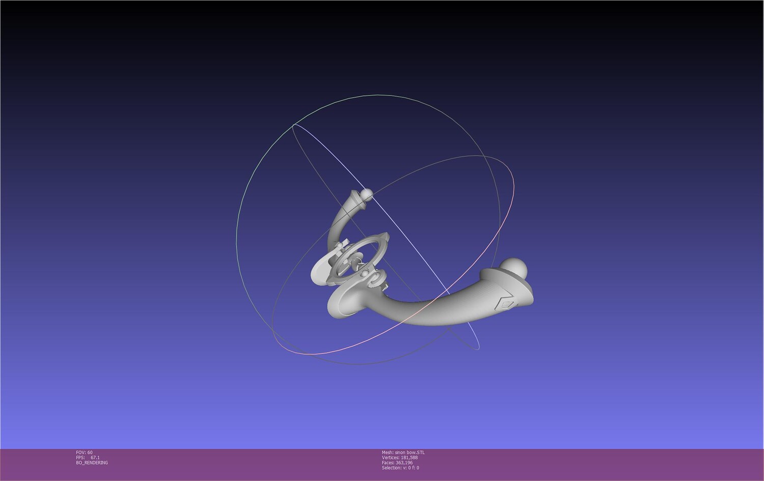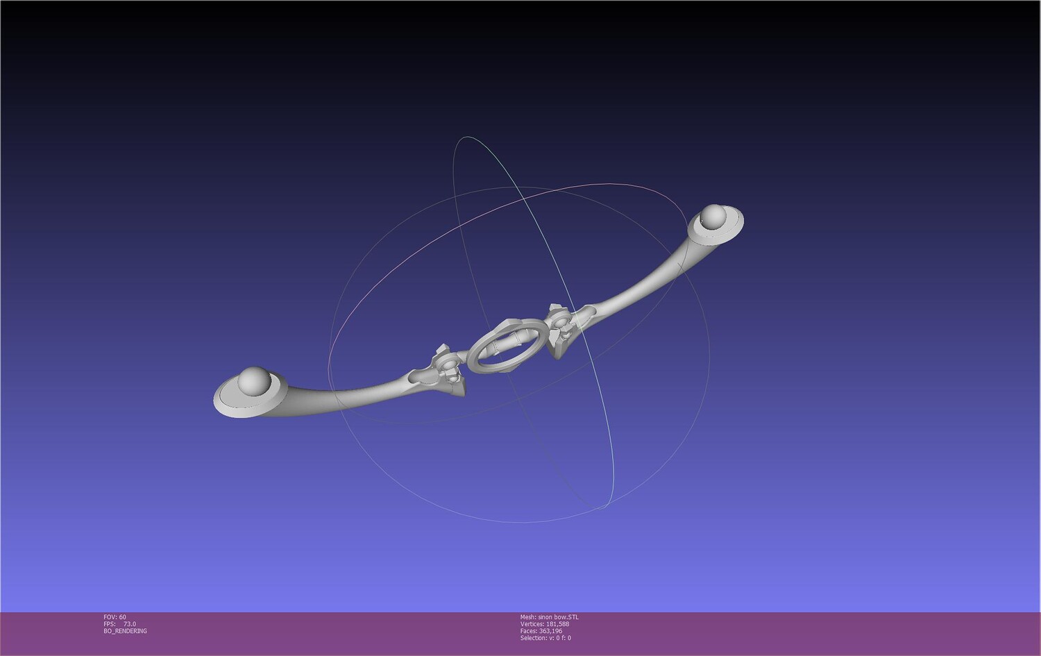 A 3d-printable model of the bow used by Sinon in the underworld part of Sword Art Online this includes both a full model and a version split up into 10 parts for easier printing and assembly using 4-5mm pegs all parts are designed for easy printability and can be scaled and remain well printable at 100% scale the full bow is about 150cm wide