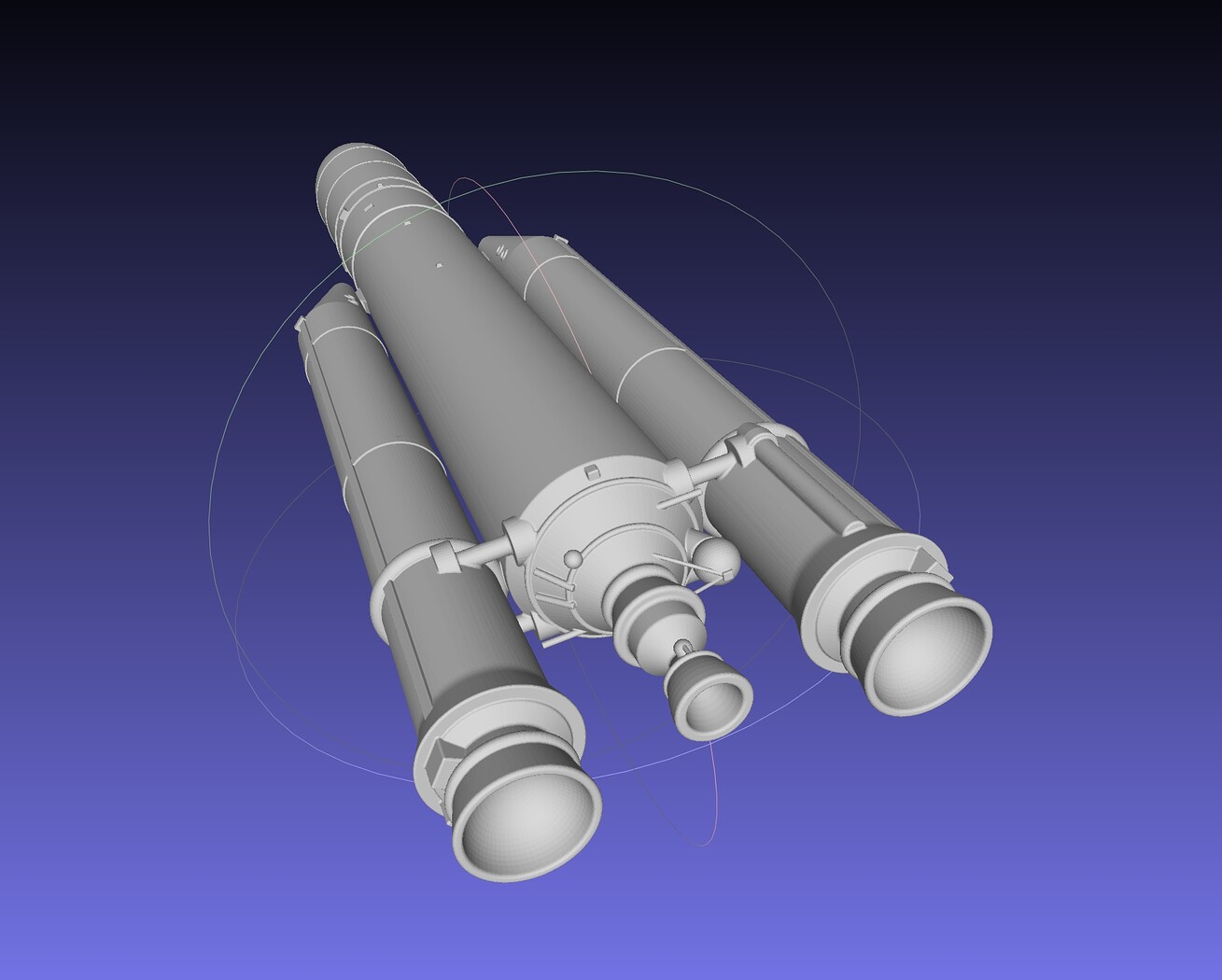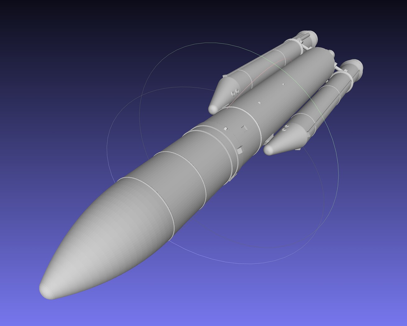 A 3d printable model of the Ariane 5 rocket currently used as the heavy lifter orbital booster by Arianespace launching large geostationary satellites powered by 2 SRB boosters and a hydrogen/oxygen core and upperstage the model is full scale but designed to be scaled down to 1/100 or smaller and printed