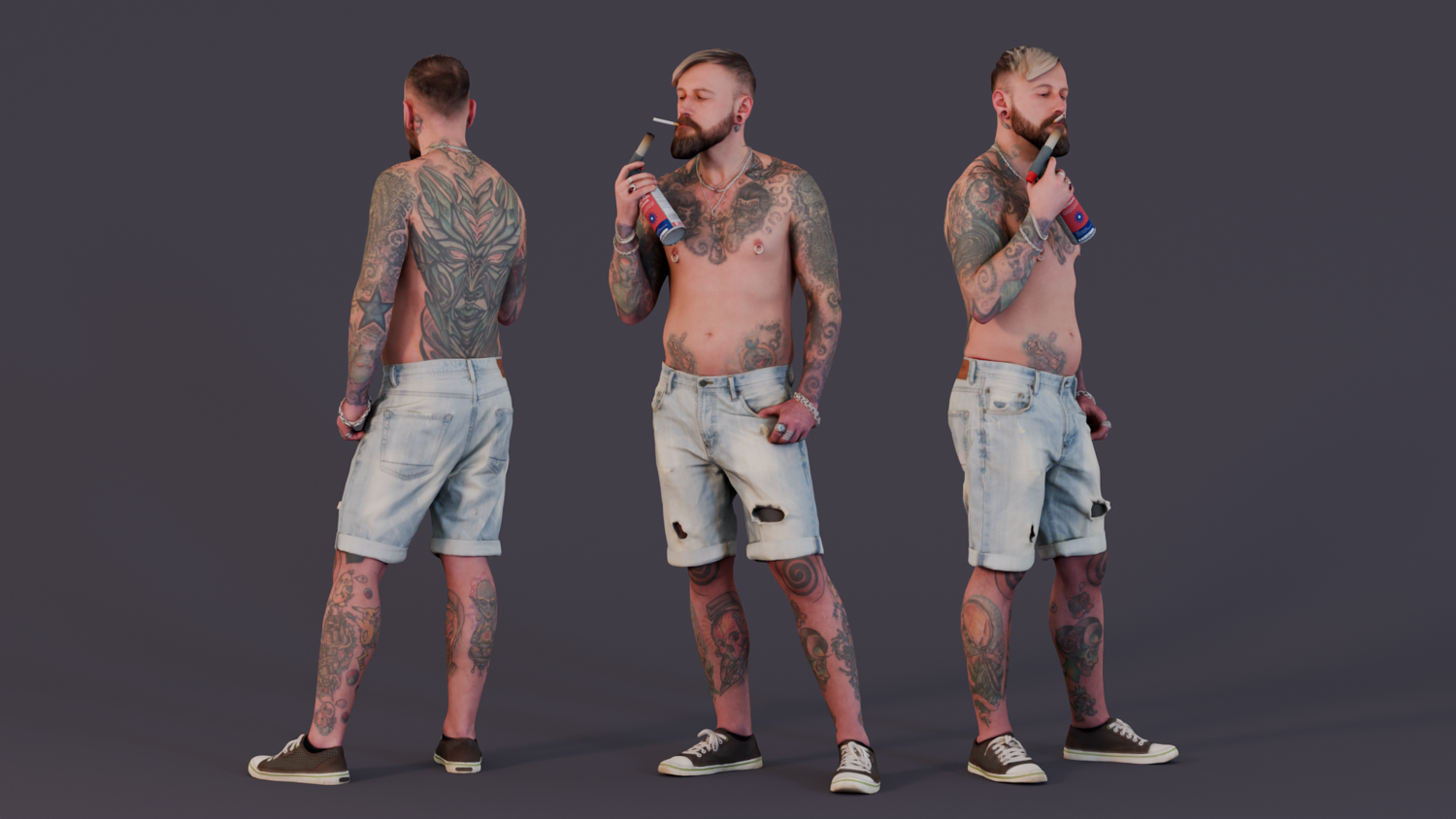 A striking 3D model of a daring rebel lighting a cigarette with a gas torch. This risky and dangerous act exudes a true spirit of defiance. The character wears ripped denim shorts that enhance his bold style, while his body is adorned with vibrant tattoos, including a large intricate design on his back. This figure radiates freedom, rebellion, and the courage to be unapologetically unique.