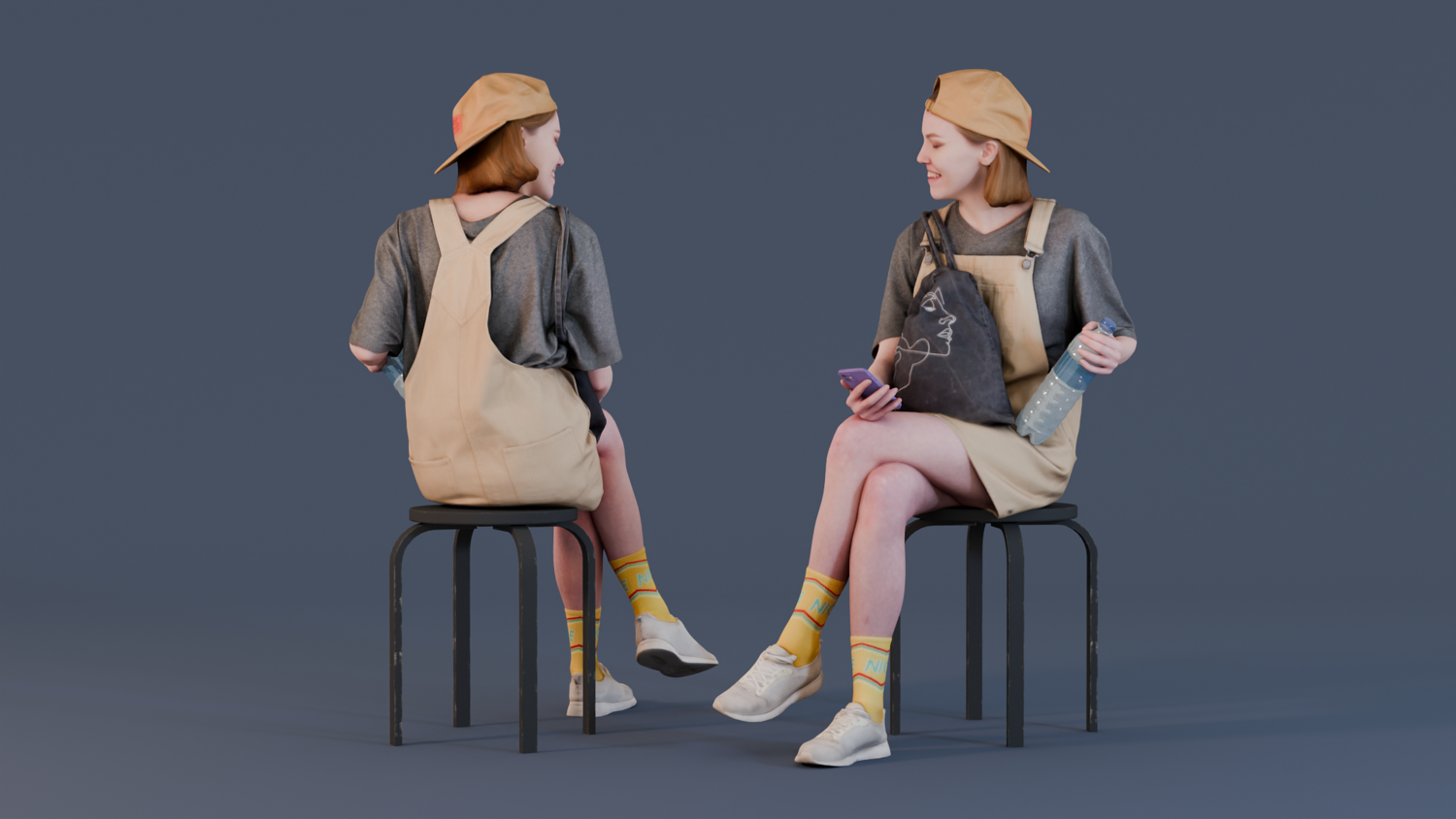 This photorealistic 3D model depicts a cheerful teen girl sitting on a stool, dressed in a casual oversized grey t-shirt and a beige dungaree dress. She wears a backwards cap, yellow socks with sneakers, and carries a stylish tote bag on her shoulder. With one hand holding a water bottle and the other browsing her phone, her relaxed and friendly posture makes her ideal for casual, contemporary settings. Her bright smile adds life to any scene requiring an upbeat, youthful character.