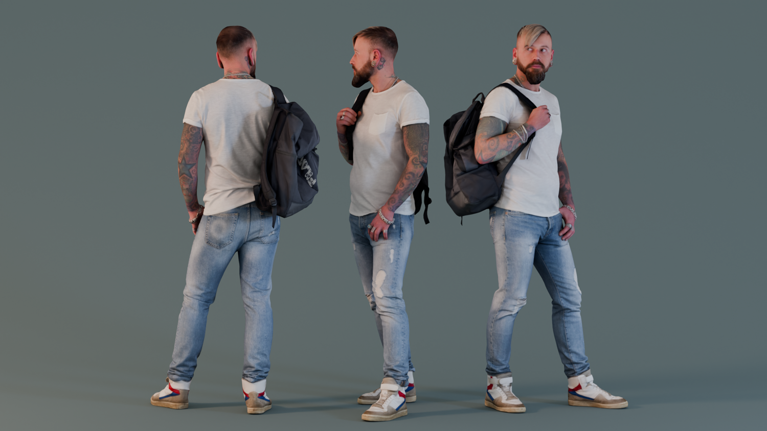 This photorealistic 3D model depicts a tattooed man with a beard, dressed in a casual white t-shirt and ripped jeans, carrying a backpack over his shoulder. The model’s contemporary style, complete with sneakers and visible tattoos, gives him a modern, street-savvy appearance. The confident stance and realistic textures make this figure ideal for urban scenes, fashion visualizations, or digital environments focused on street culture and casual lifestyle settings.