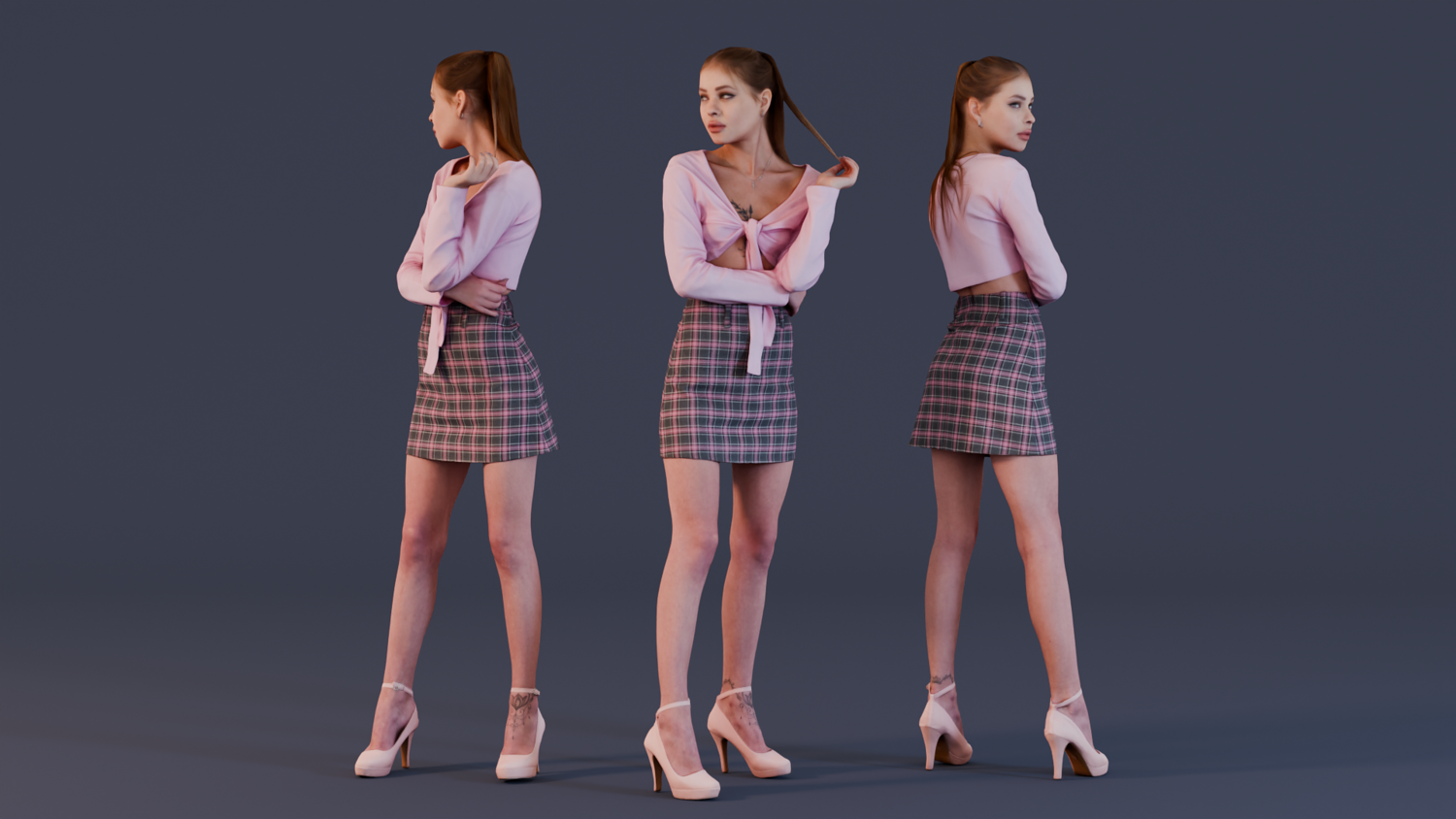 This realistic 3D model features a young woman dressed in a trendy pink tie-top and a chic plaid mini skirt, paired with high-heeled shoes. Her confident pose and fashionable look make her an excellent fit for any scene that focuses on modern, youthful style. The subtle playfulness of her pose, with her hand gently playing with her hair, adds a layer of natural charm and elegance. The combination of the pink tones and plaid pattern makes this model perfect for showcasing fashion, lifestyle, or casual urban scenes.