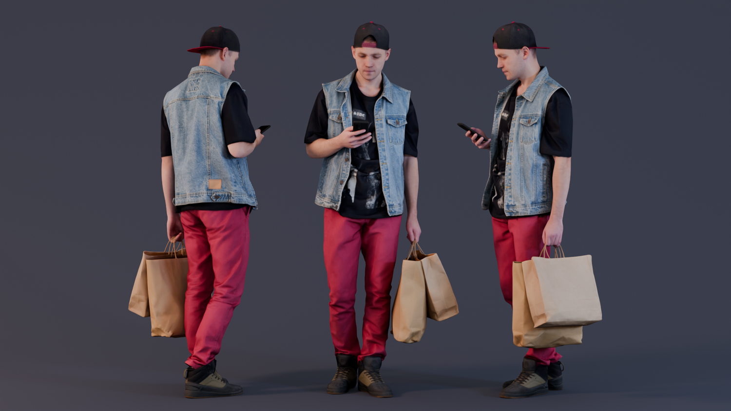 This photorealistic 3D model features a young man in a casual streetwear outfit, holding shopping bags while browsing on his phone. He is dressed in a denim vest over a graphic tee, paired with striking red pants and a backwards cap, completing his laid-back style. The model’s posture, with his attention focused on the phone, creates a relatable and modern scene, perfect for a mall, urban, or retail setting.