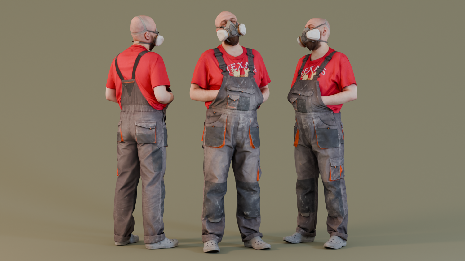This 3D model presents a bald man dressed in work-ready attire, featuring a red T-shirt under dusty gray overalls with orange accents. The model's hands rest casually on the overalls, and he wears a respirator mask, adding an element of safety and authenticity. His rugged, worn look makes him perfect for industrial scenes, construction sites, or realistic urban environments. The character's casual stance and practical outfit reflect a hardworking individual, suitable for enriching background settings in construction, warehouse, or other manual labor simulations.