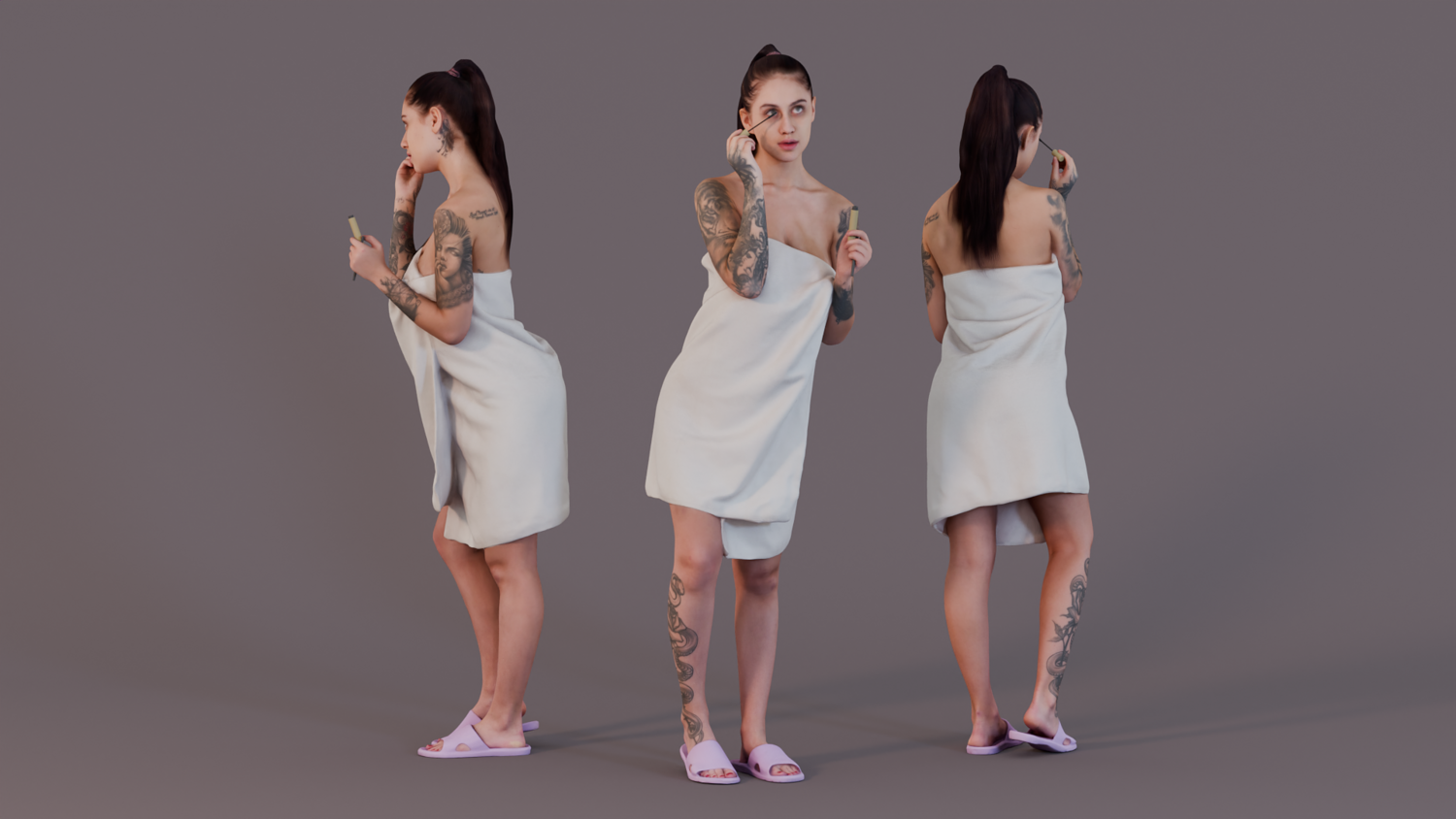 This realistic 3D model features a woman wrapped in a towel, focusing intently on applying mascara to her lashes. Her tattooed arms add a modern and edgy contrast to her serene pose, while her relaxed, casual stance captures the essence of a calm beauty routine. She wears comfortable slides, with her hair pulled back into a high ponytail, completing the at-home look. The fine details in her tattoos, towel, and posture make her perfect for personal care, beauty advertisements, or lifestyle settings.