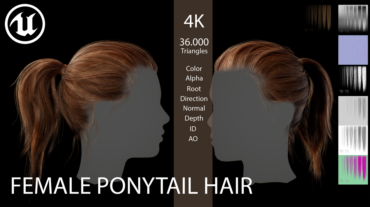 PBR cards: Hair albedo blond AO Normal ID Depth Directional Roots Alpha