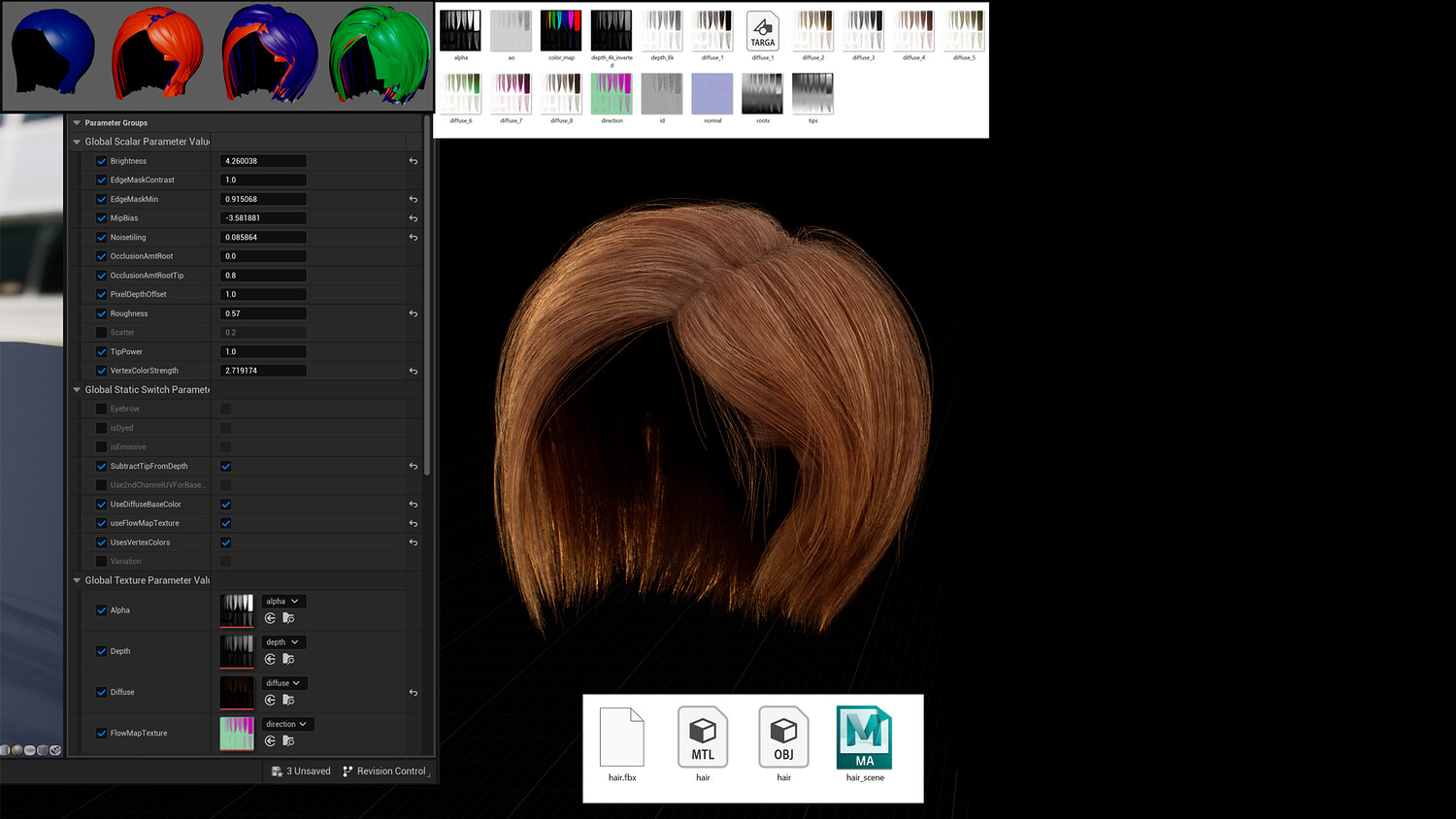 PBR cards: Hair albedo (8 Different PNG + TGA file) AO Normal ID Depth Directional Roots Tips Alpha Color map (if you want to make your own hairstyle)