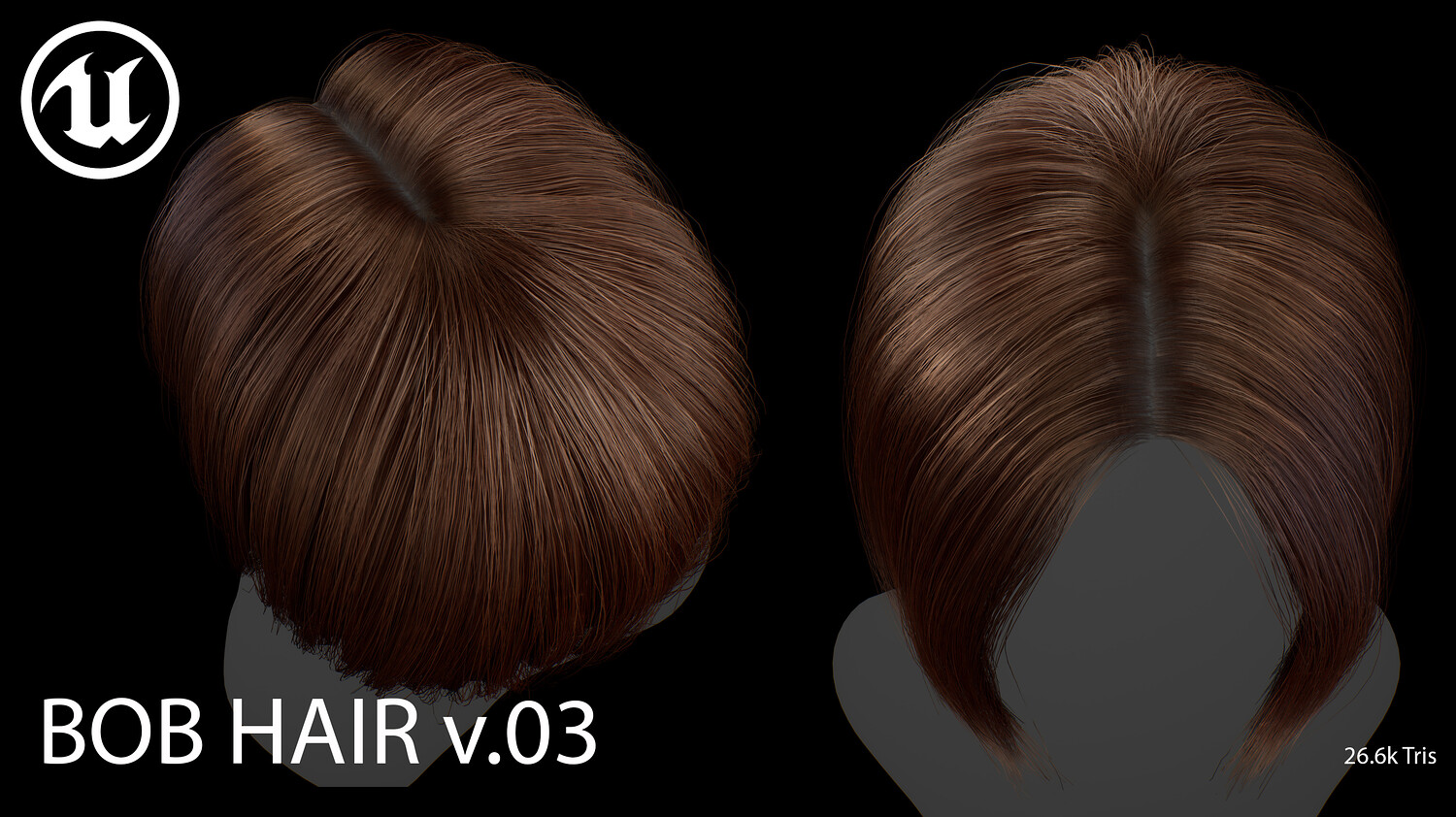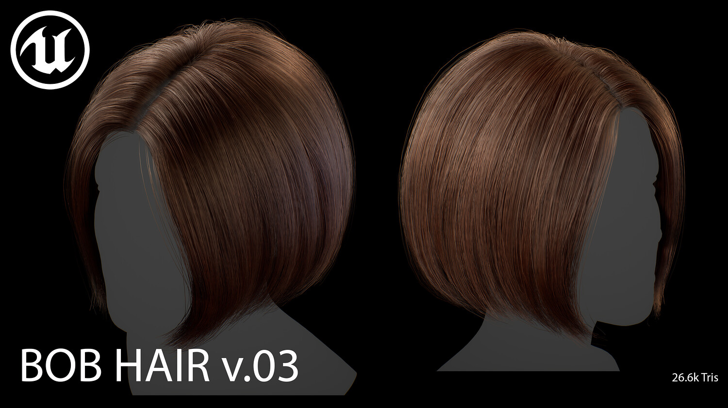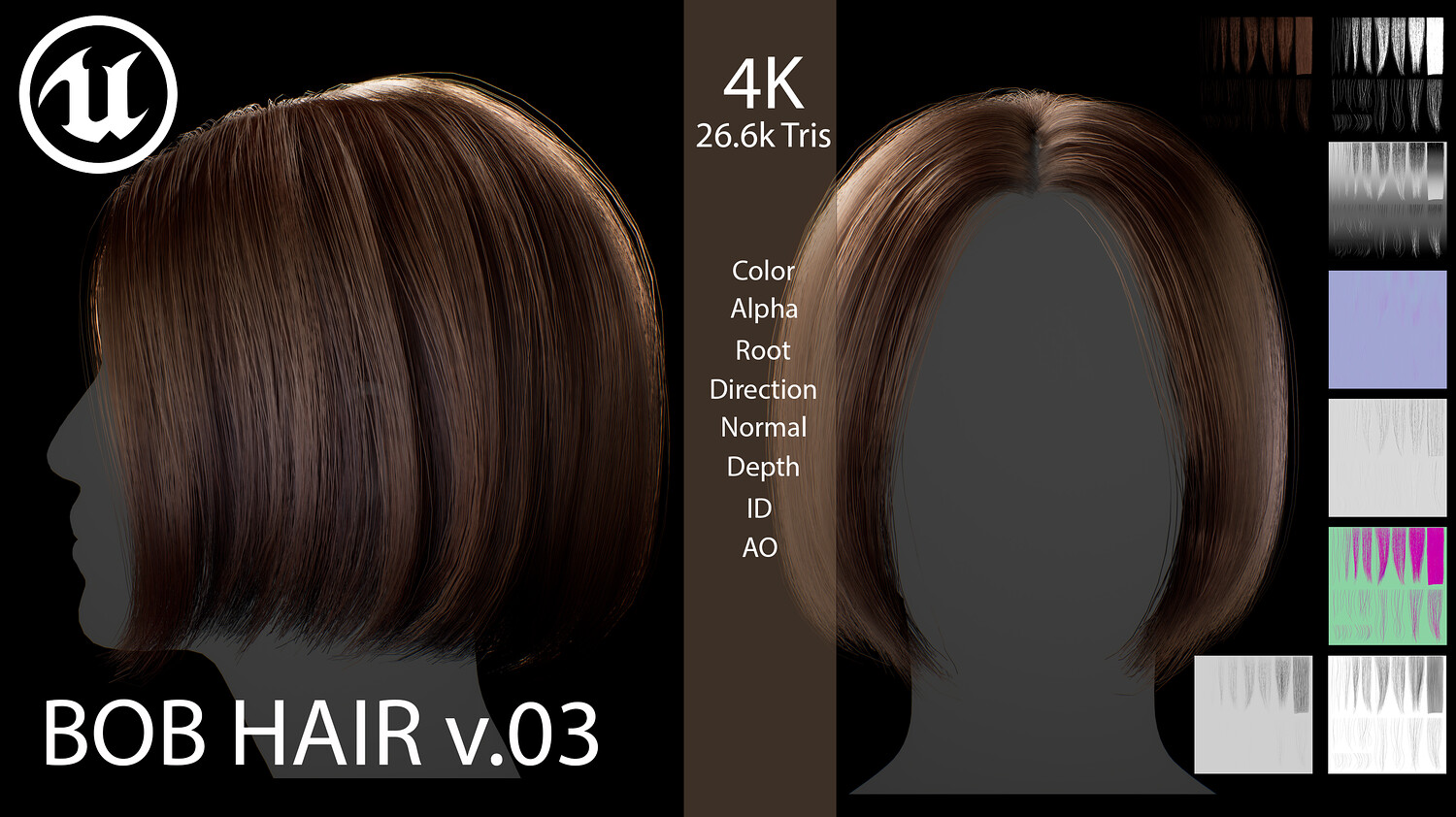 This elegant real-time female Bob v03 hairstyle is designed for use in games, cinematics, and real-time applications. Hair textures created with XGen (textures were made and baked using xGen and Arnold) and optimized for Unreal Engine 4-5, this asset delivers both performance and high visual quality.