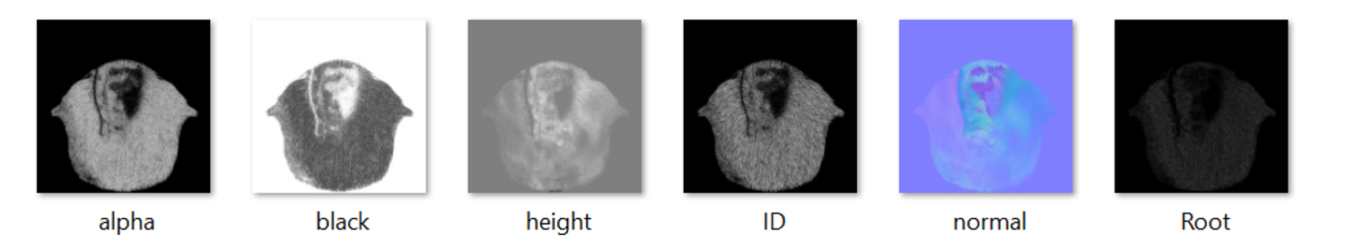 PBR cards: Hair albedo (8 Different PNG + TGA file) AO Normal ID Depth Directional Roots Tips Alpha Color map (if you want to make your own hairstyle)