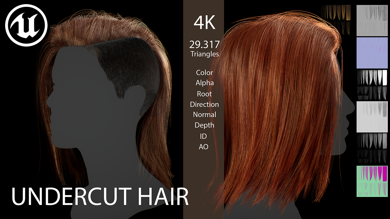 The pack includes: - Hair - .fbx - Hair - .obj - Hair - .ma - Haircap - .fbx - Textures: 4k, TGA (8 diffuse maps), PNG (8 maps) - Haircap textures PNG: Alpha, Root, ID, Flow, Depth, Normal - UE 5.2 Scene No eyebrows and eyelashes. No head maneken