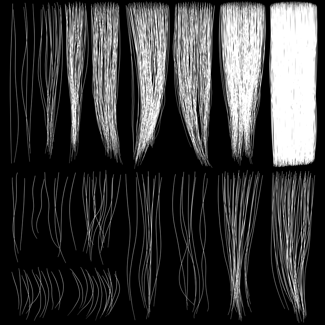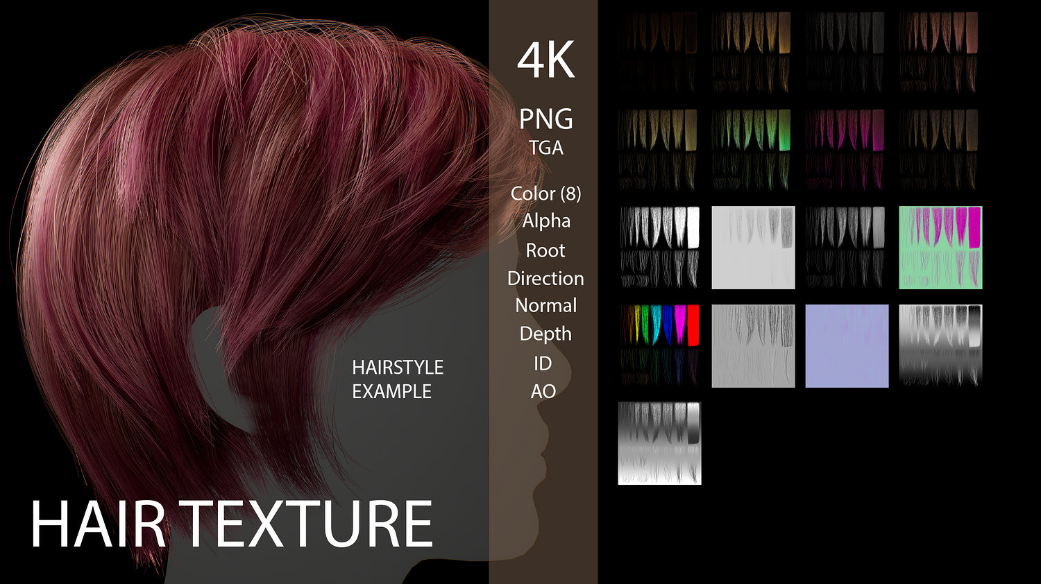The pack includes: - Textures: 4k, TGA file, 8 different color maps, PNG (8 maps) PBR cards: Hair albedo (8 PNG + TGA file) AO Normal ID Depth Directional Roots Tips Alpha Color map (Easy to place haircards)