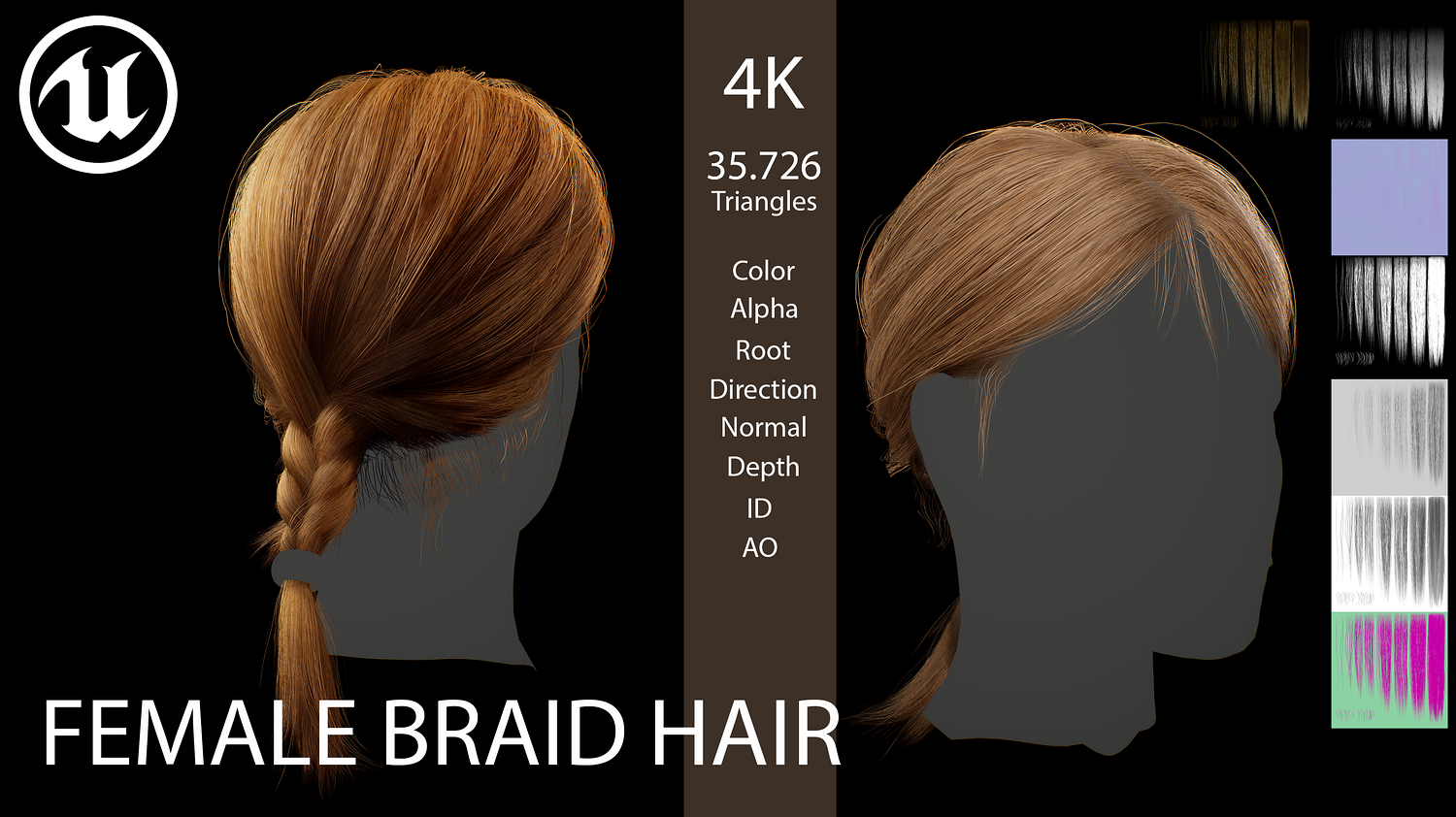 The pack includes: - Hair and Maneken - .fbx - Hair and Maneken - .obj - Hair and Maneken - .ma - Textures: 4k, TGA (4 diffuse maps), PNG (8 maps) - Marmoset toolbag 4 scene - UE 5.2 Scene No eyebrows and eyelashes.