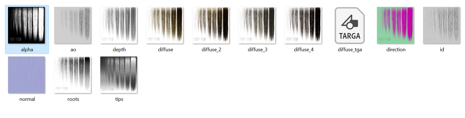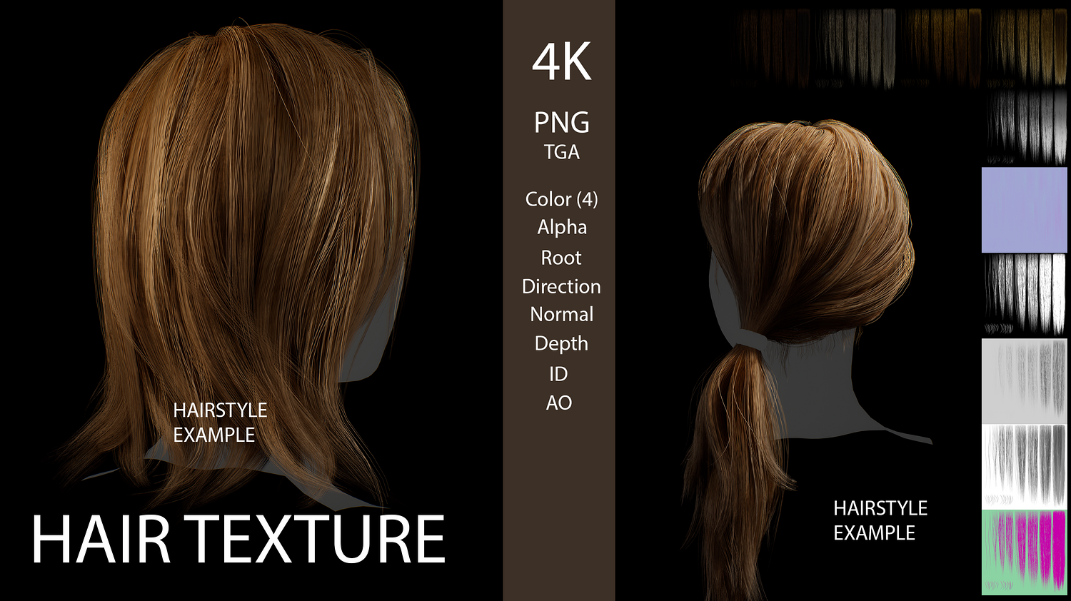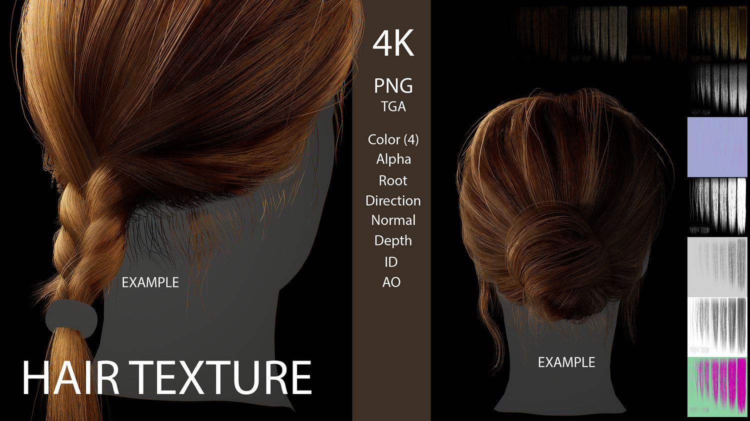 The pack includes: - Textures: 4k, TGA file, 4 different color maps, PNG (8 maps) PBR cards: Hair albedo (4 PNG + TGA file) AO Normal ID Depth Directional Roots Tips Alpha