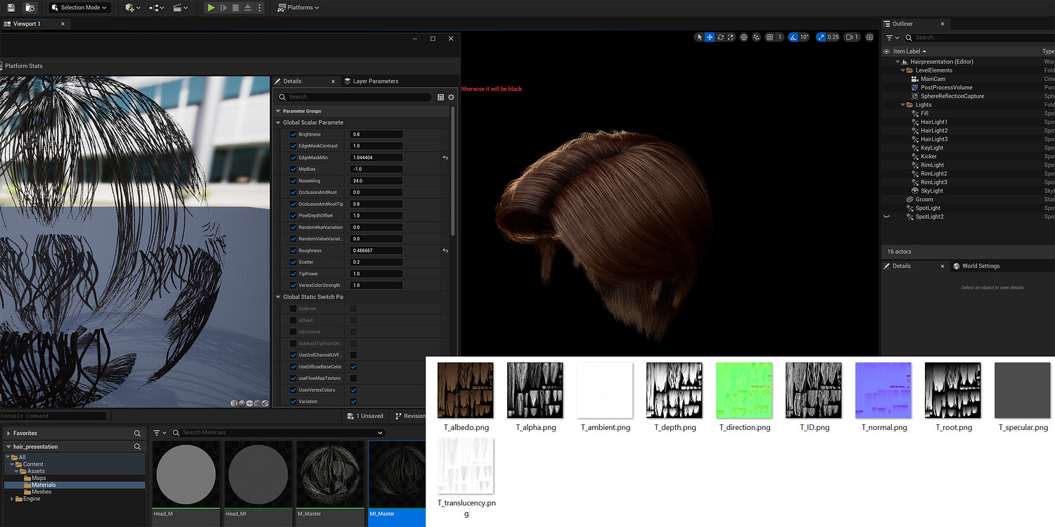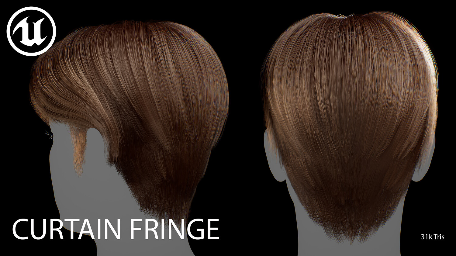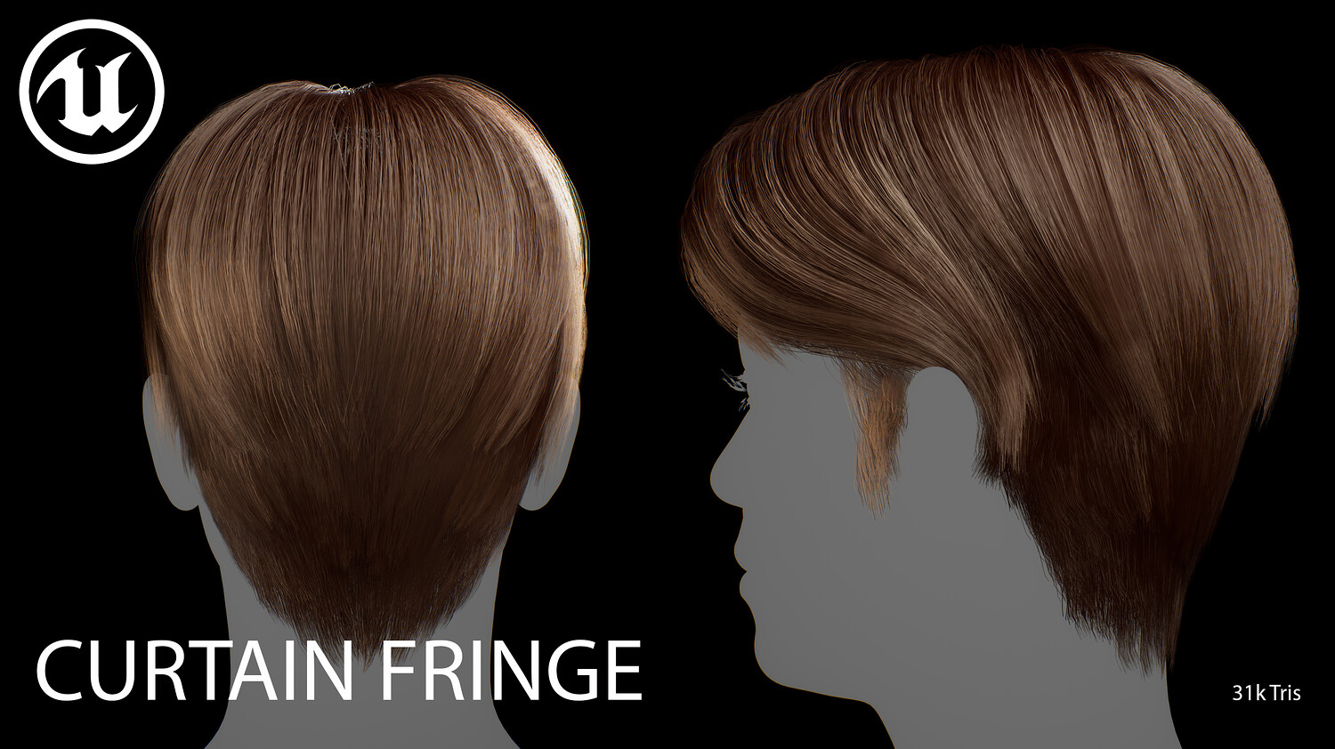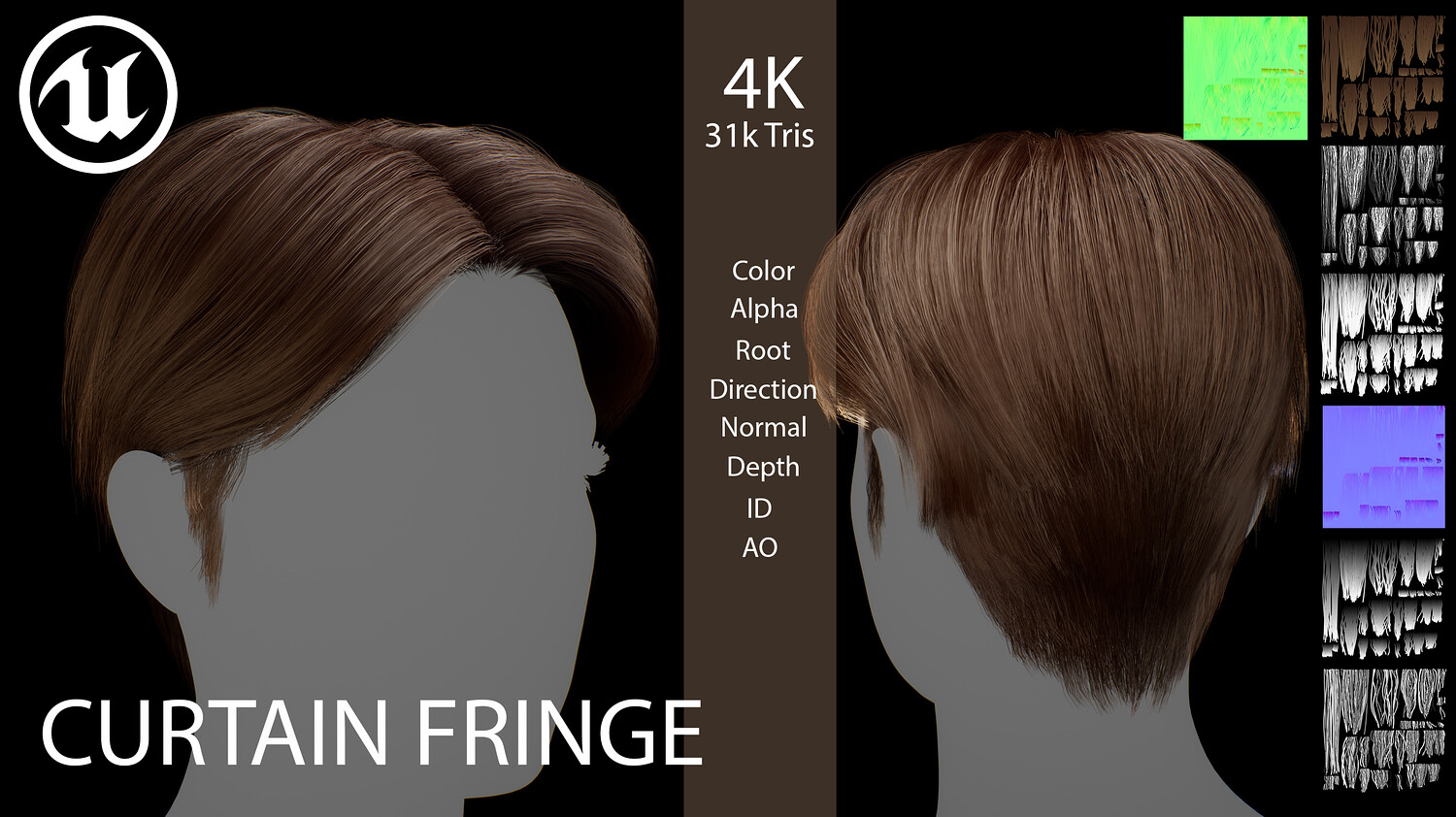 This real-time Curtain Fringe hairstyle is designed for use in games, cinematics, and real-time applications. Hair textures created with Fibershop and optimized for Unreal Engine 4-5, this asset delivers both performance and high visual quality.