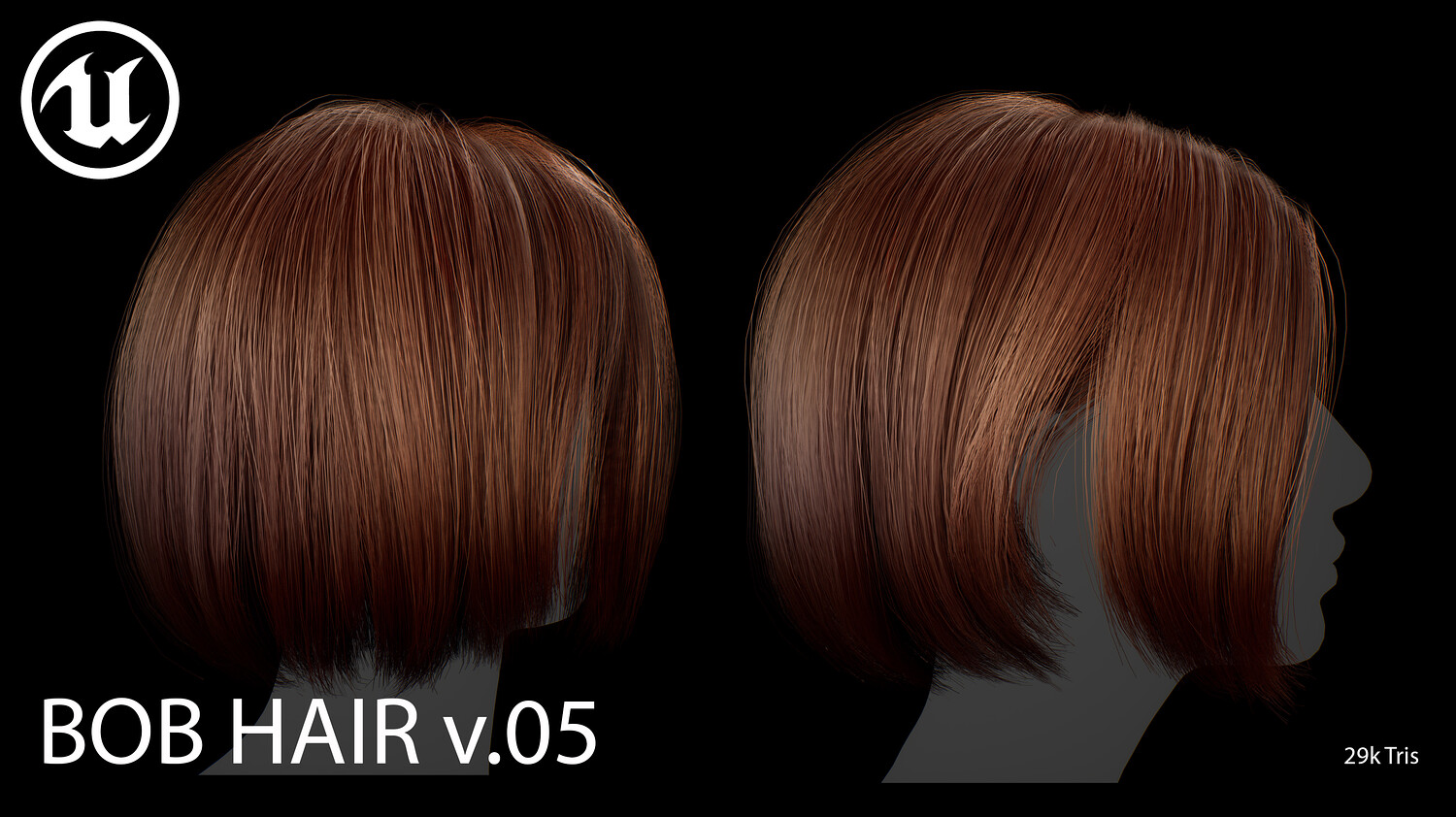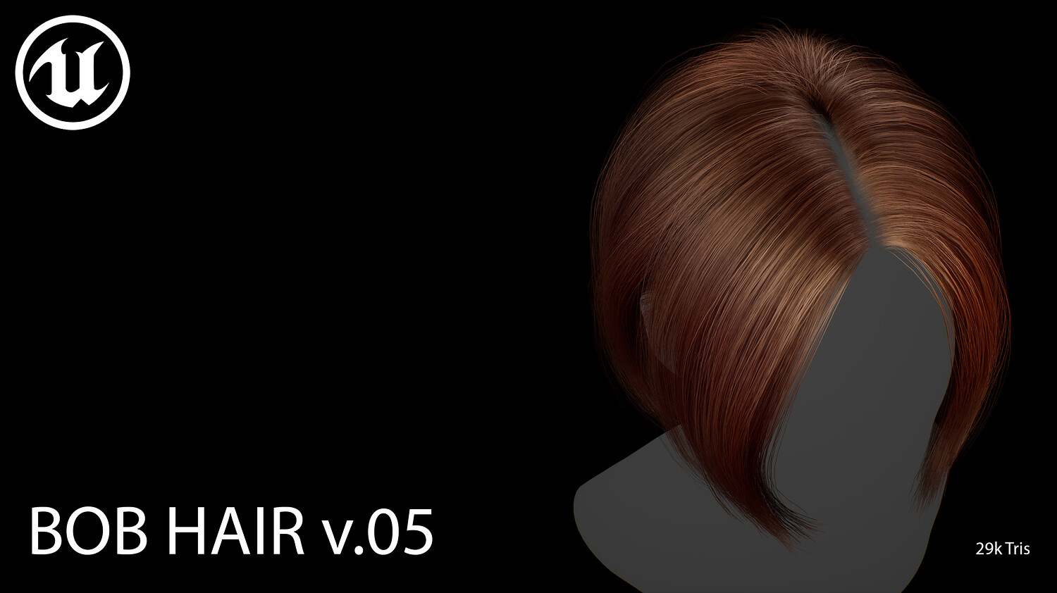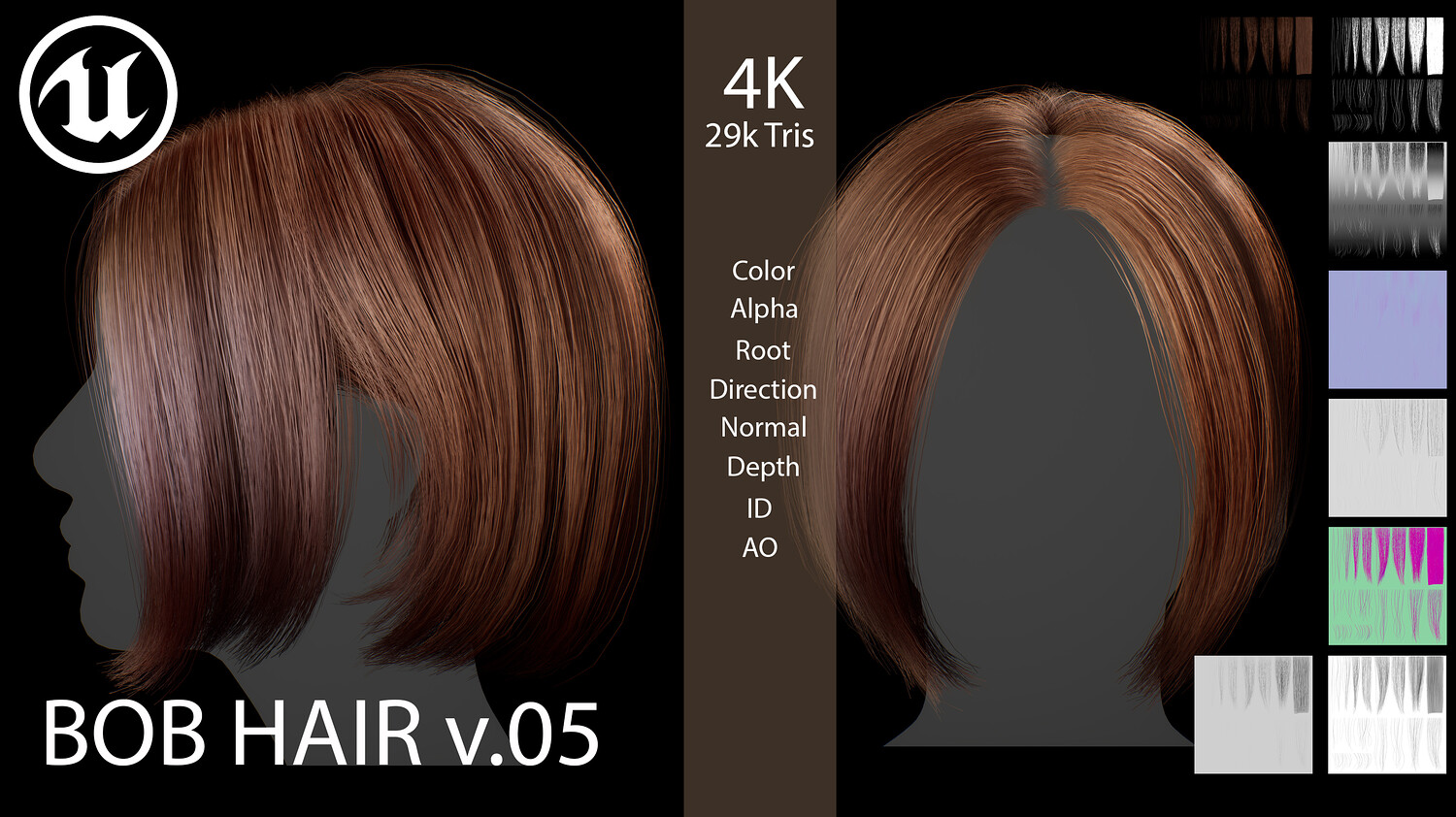 This elegant real-time female Bob v05 hairstyle is designed for use in games, cinematics, and real-time applications. Hair textures created with XGen (textures were made and baked using xGen and Arnold) and optimized for Unreal Engine 4-5, this asset delivers both performance and high visual quality.