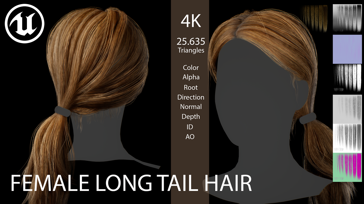 PBR cards: Hair albedo (4 PNG + TGA file) AO Normal ID Depth Directional Roots Tips Alpha
