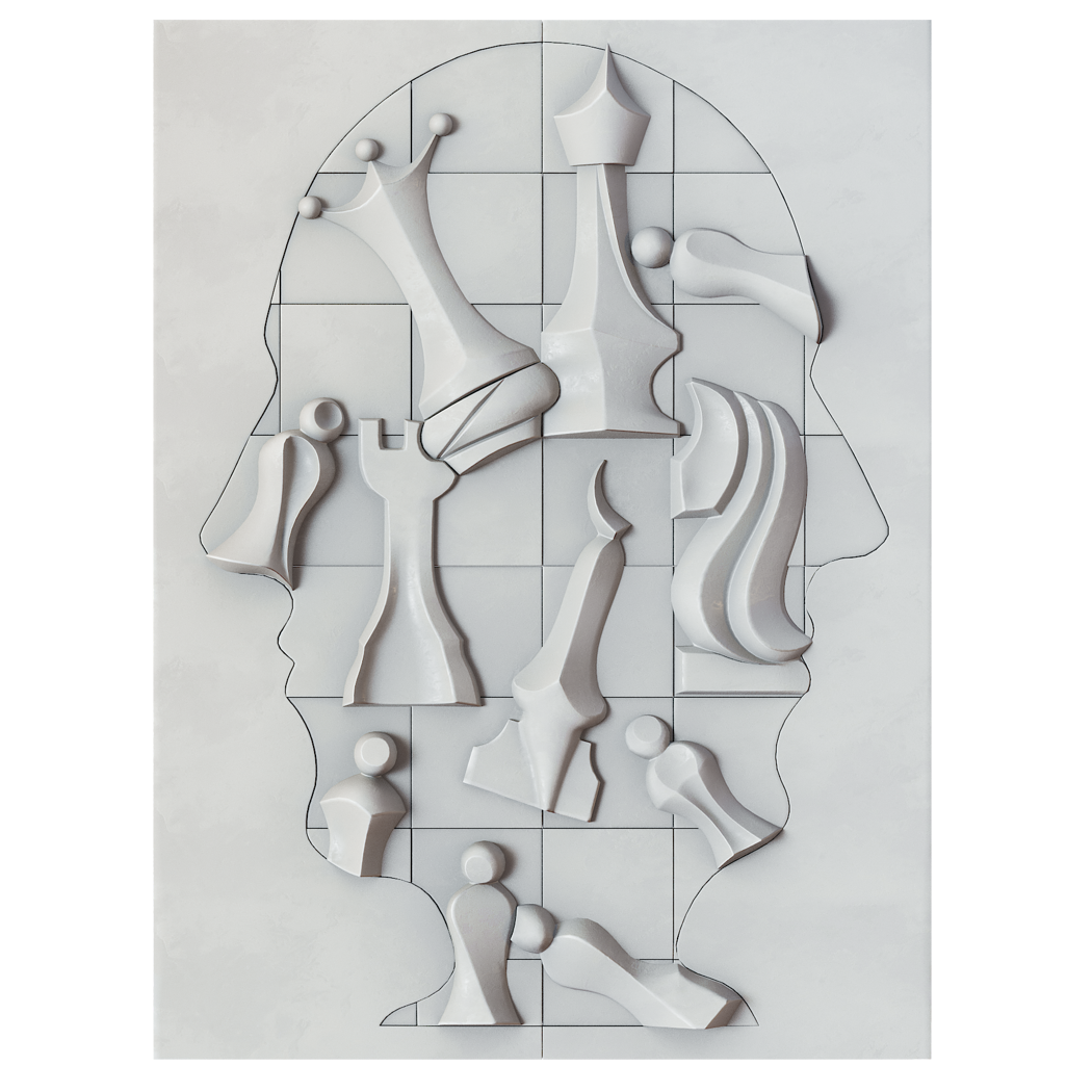 Abstract chess-inspired wall art panel designed as a sculptural relief composition of stylized chess pieces.