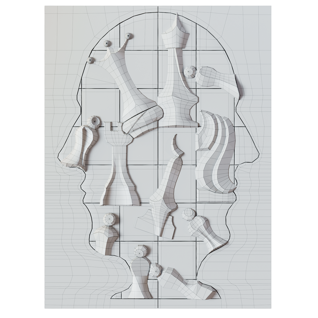 This model blends geometric abstraction with recognizable chess forms, making it a strong visual element for modern interiors, game rooms, and conceptual spaces.