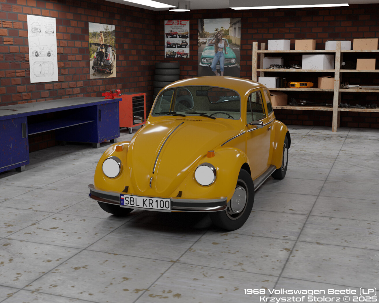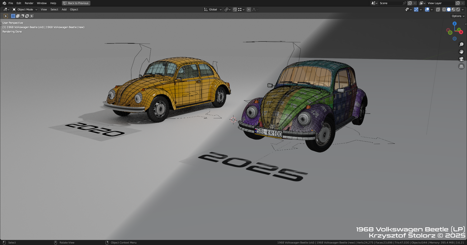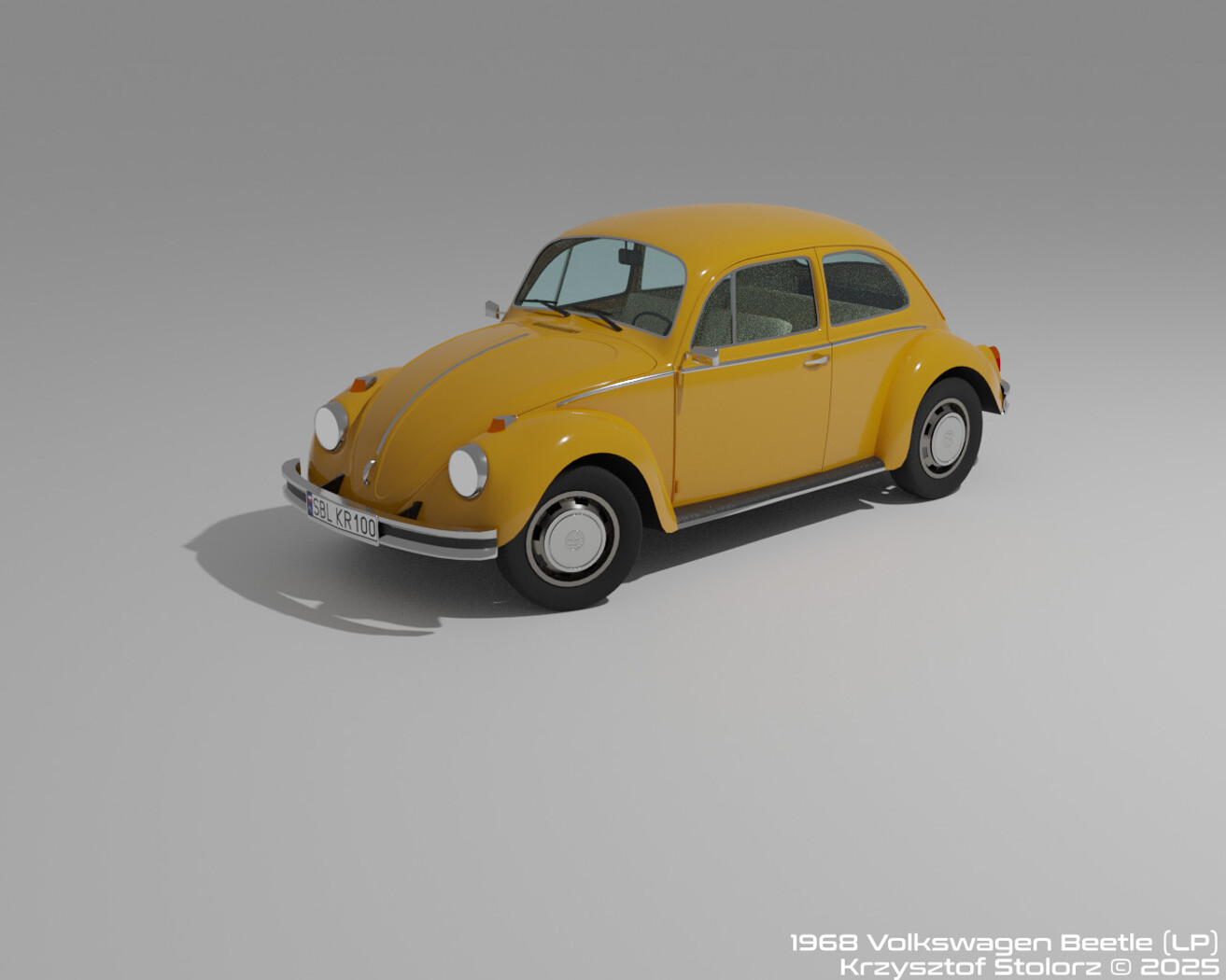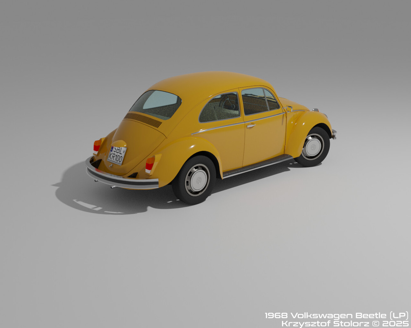A low-poly model of Volkswagen Beetle. The old one ( from July 13th 2020) created in Blender 2.82 texture created in Inkscape . The new one (from May 16th 2025) created in Blender 3.6 and textured in Substance 3D Painter.