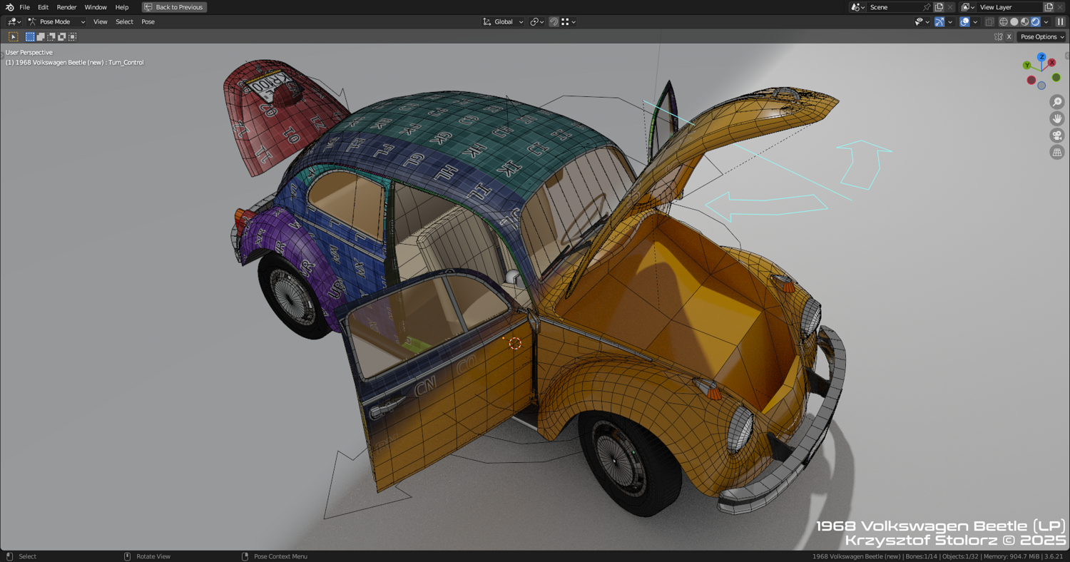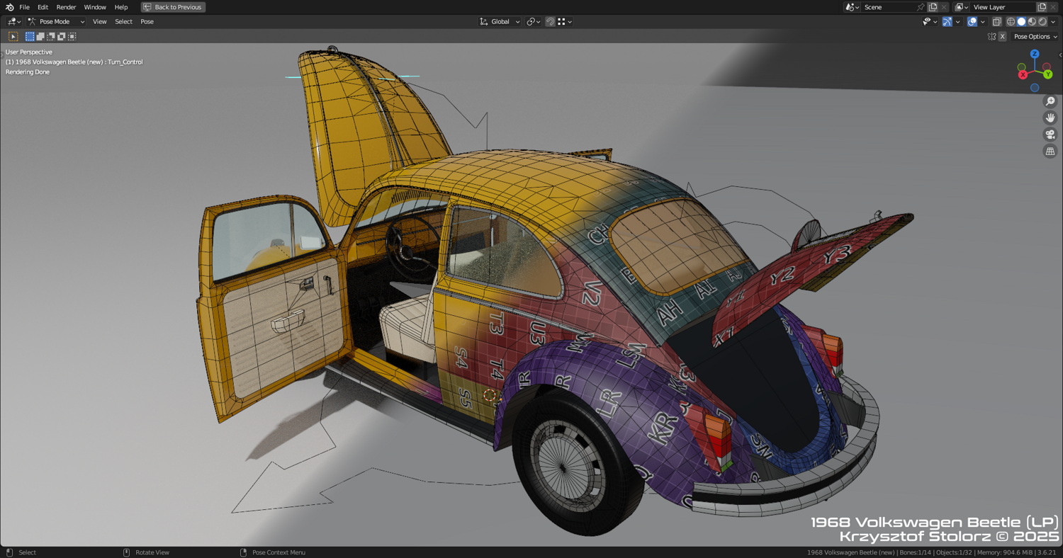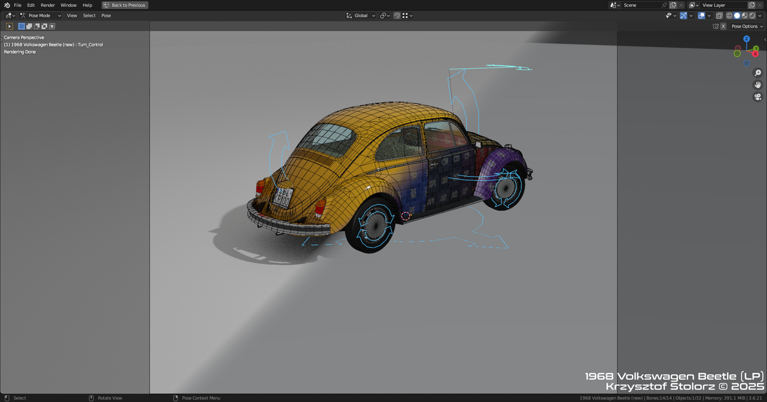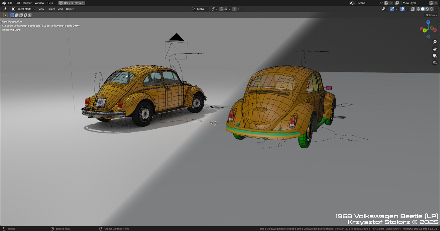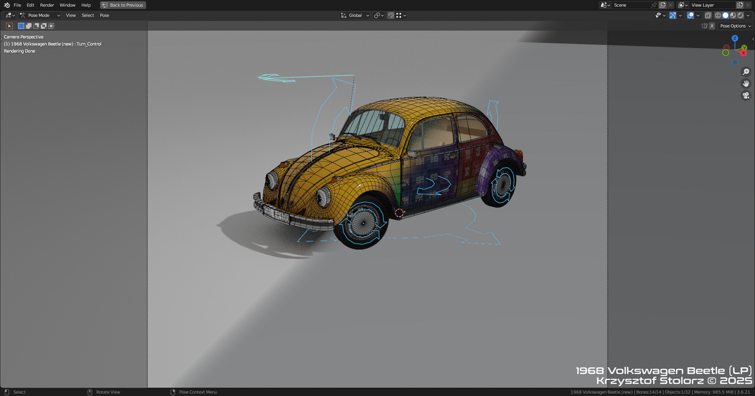 A low-poly model of Volkswagen Beetle. The old one ( from July 13th 2020) created in Blender 2.82 texture created in Inkscape . The new one (from May 16th 2025) created in Blender 3.6 and textured in Substance 3D Painter.
