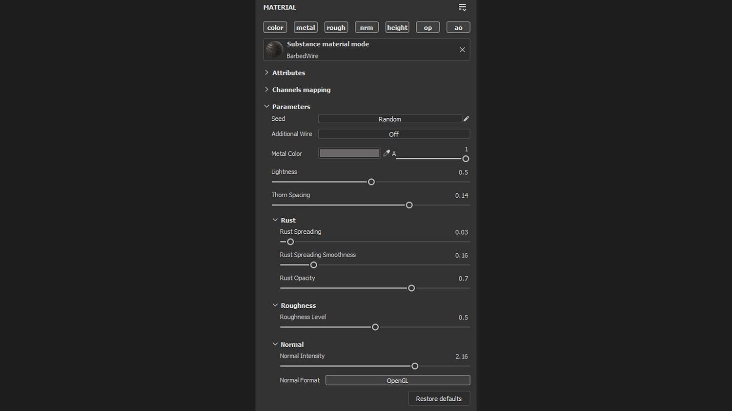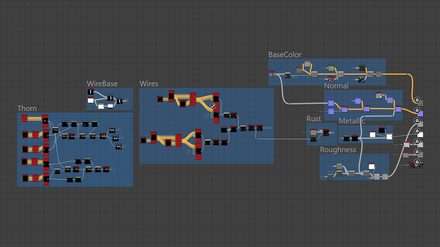Seamless barbed wire material was created in Substance Designer 14.1.2