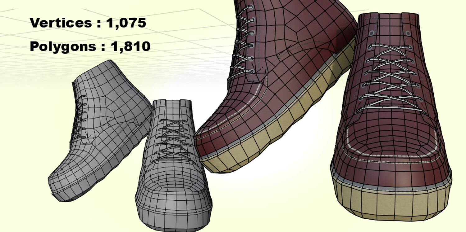 🧩 Model Specifications Vertices: 1,075 Polygons (Triangles): 1,810 Counts are for one shoe only.