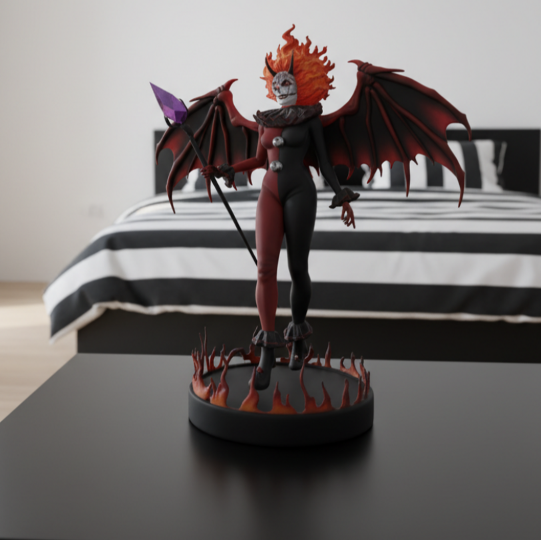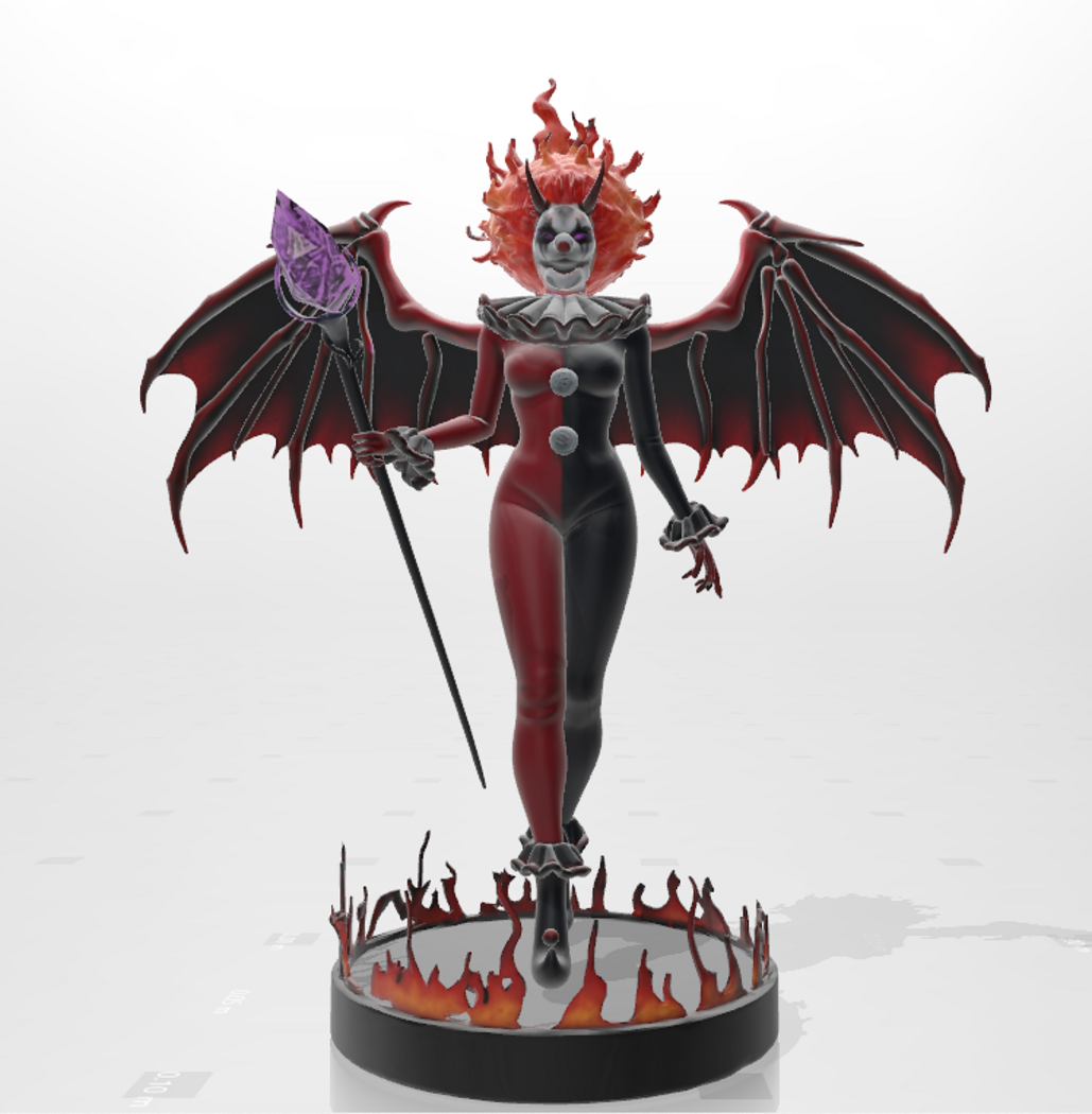 The Dark Mistress of Fear is one of my exclusive creations. A Dark evil that forms a strong red aura of fear around itself and freezes the blood in the veins of its opponents. Her hair is glowing, her wings are ghostly, her outfit is original, and her main weapon is shiny and likable with a shiny magic crystal of a seductive purple color. I designed her as the Mistress of the Seven Evils, which consists of six more evil clowns who each have their own specific powers and designs, but her power and cruelty surpasses all of their powers combined.