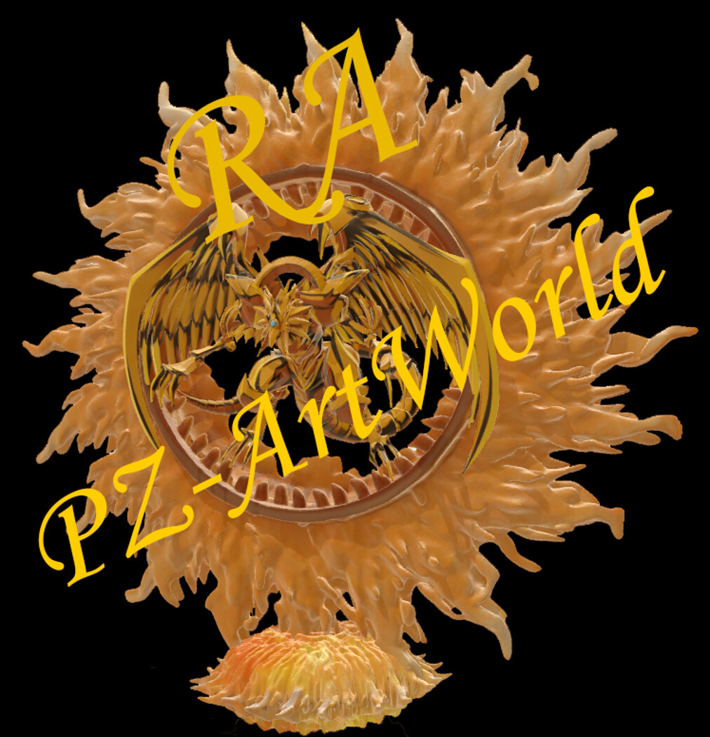 The iconic complex statue of the legendary Winged dragon of RA from the Anime Yugioh. The beast itself is done with incredible precision with strict attention to every detail. RA erupts in a large flaming vortex of light that forms around him in the shape of a sun, a unique and exclusive artistic approach to this anime character. the pedestal is also in flames and represents the element of the sun. The figure is even 50cm tall! One of the most complexly made figures for this anime. The most original way to represent an Egyptian divine creature. every detail is precisely modeled with an emphasis on the entire artistic composition of the entire sculpture and its special appearance. The figure has almost 4 million vertices!
