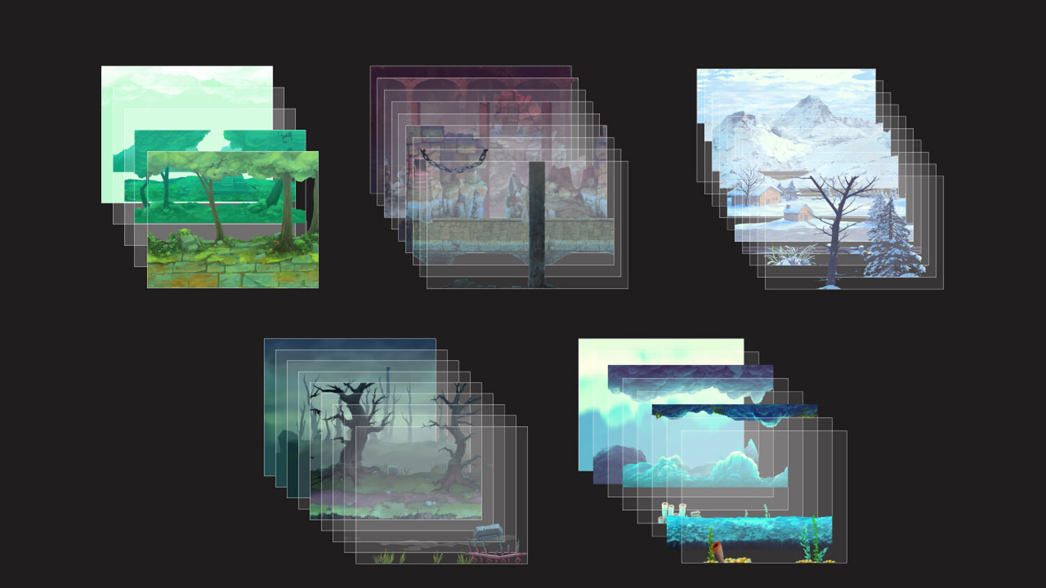 5 multi-layer, hand-painted parallax backgrounds where nature and human-made structures collide. This collection includes: