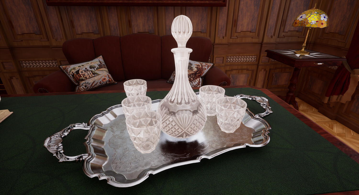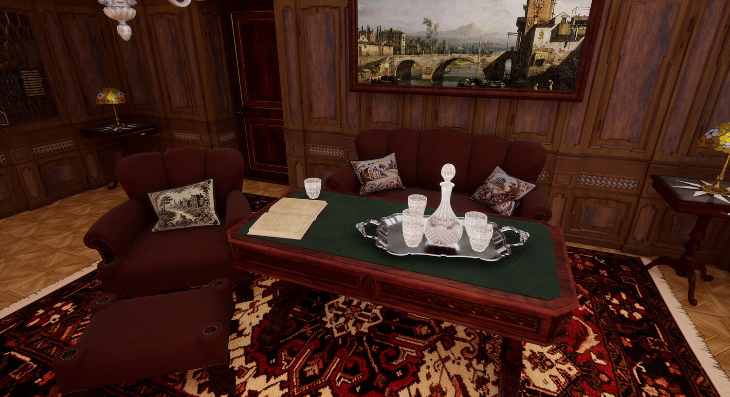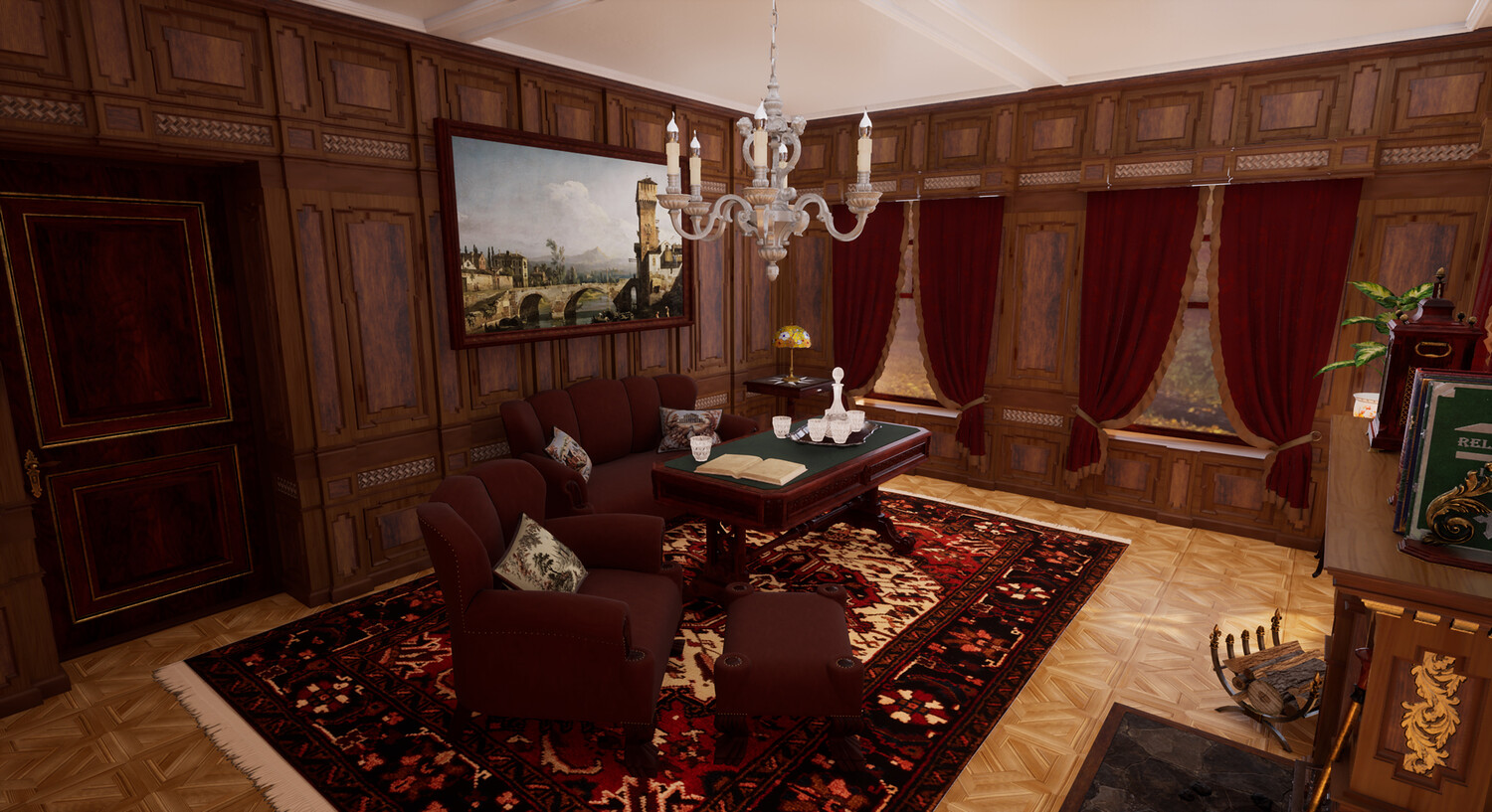 The room features a leather armchair with footrest, a matching Victorian sofa, and a central table adorned with an open book, a cut-glass whiskey set, and a partially filled glass—suggesting a moment of evening repose. Nearby stands a fireplace with a luxurious antique mantel clock, providing both architectural presence and historical charm.