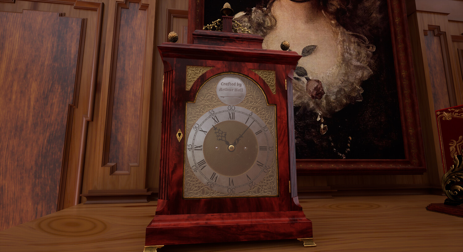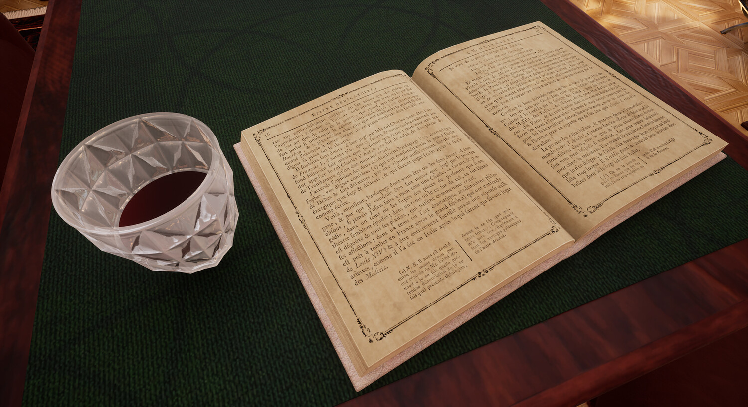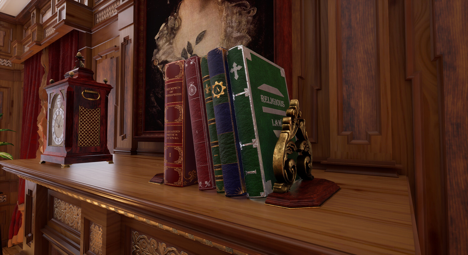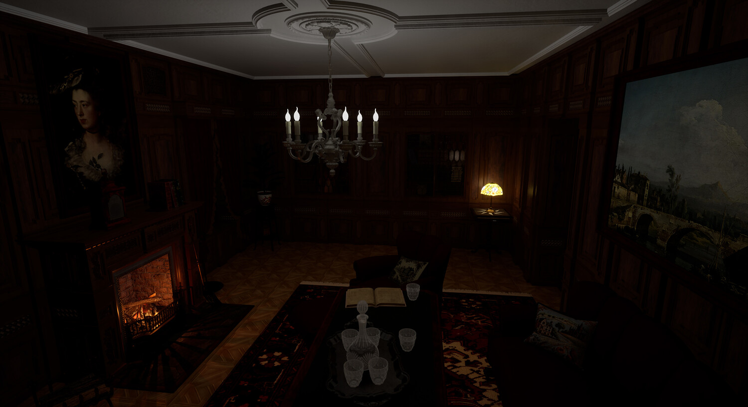 The room features a leather armchair with footrest, a matching Victorian sofa, and a central table adorned with an open book, a cut-glass whiskey set, and a partially filled glass—suggesting a moment of evening repose. Nearby stands a fireplace with a luxurious antique mantel clock, providing both architectural presence and historical charm.