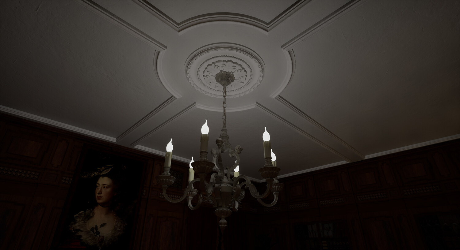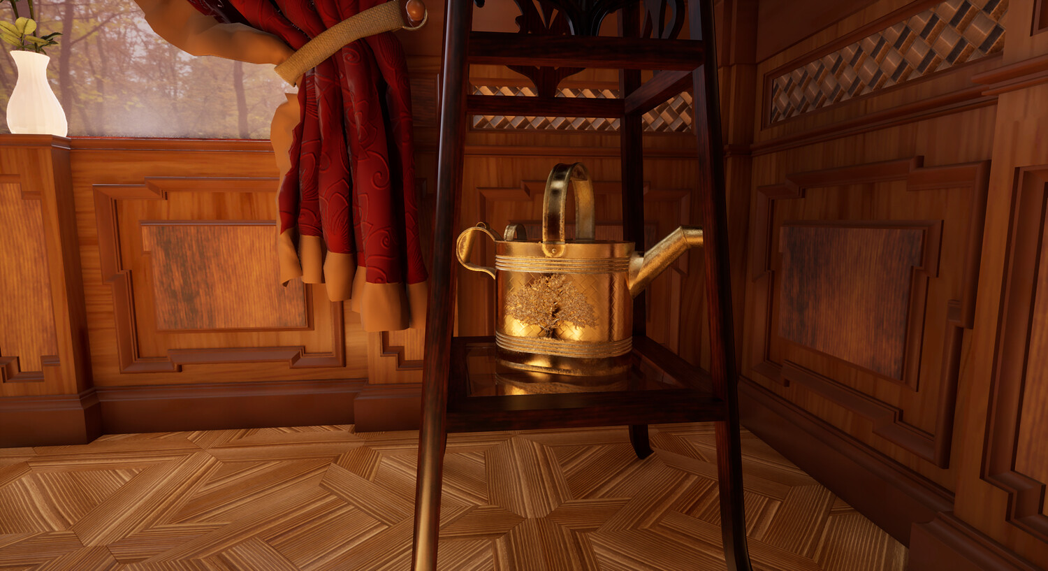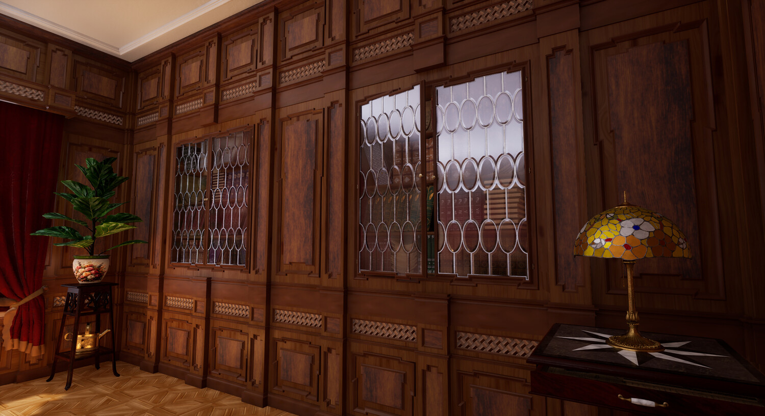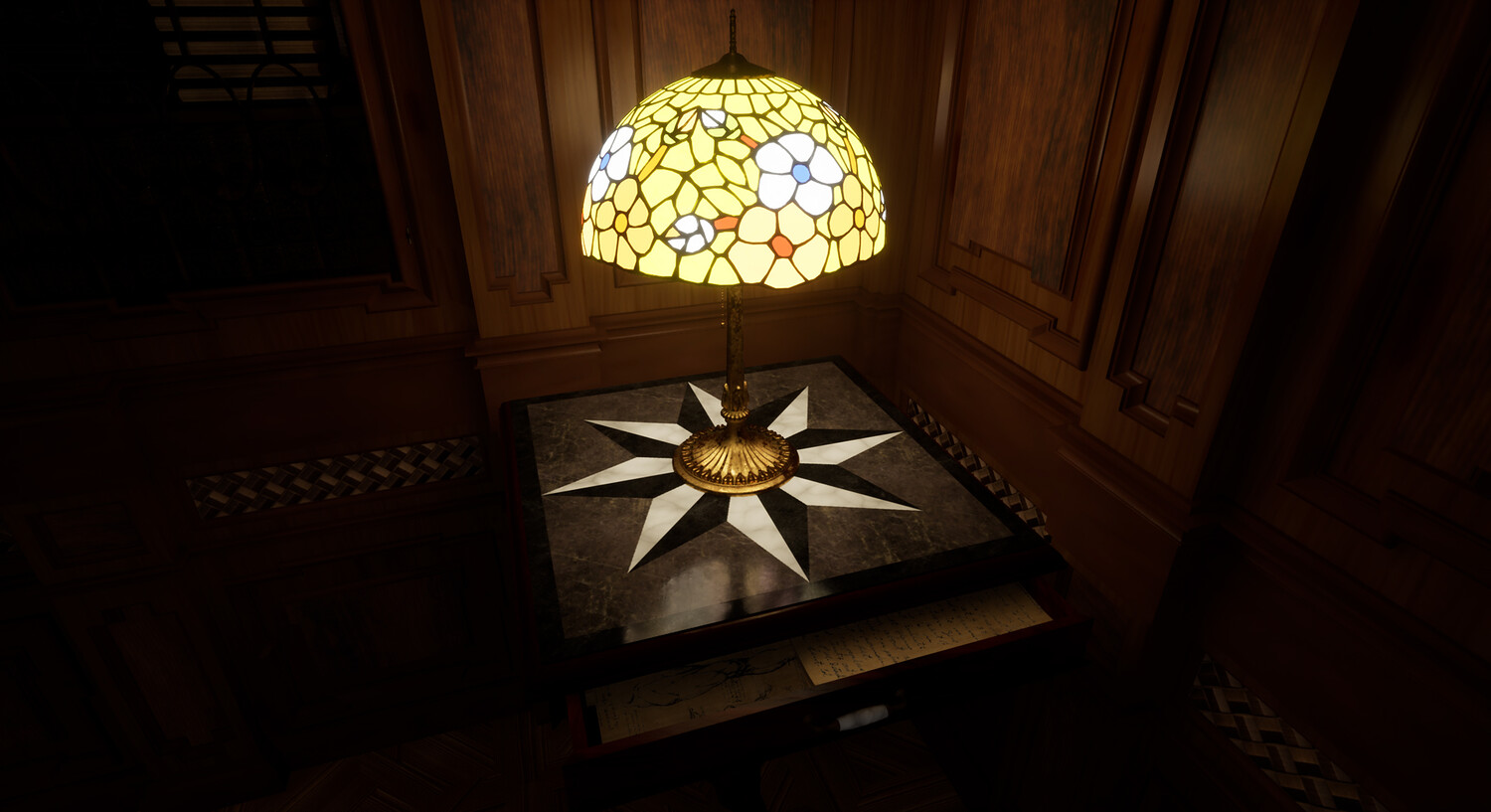 Completing the atmosphere is a side table featuring a black-and-white marble star inlay, topped with a glowing stained-glass lamp composed of floral-patterned glass panels. Together, these elements offer a perfect snapshot of Victorian comfort and cultivated taste—ideal as a backdrop for narrative scenes, cinematic lighting, or period storytelling.