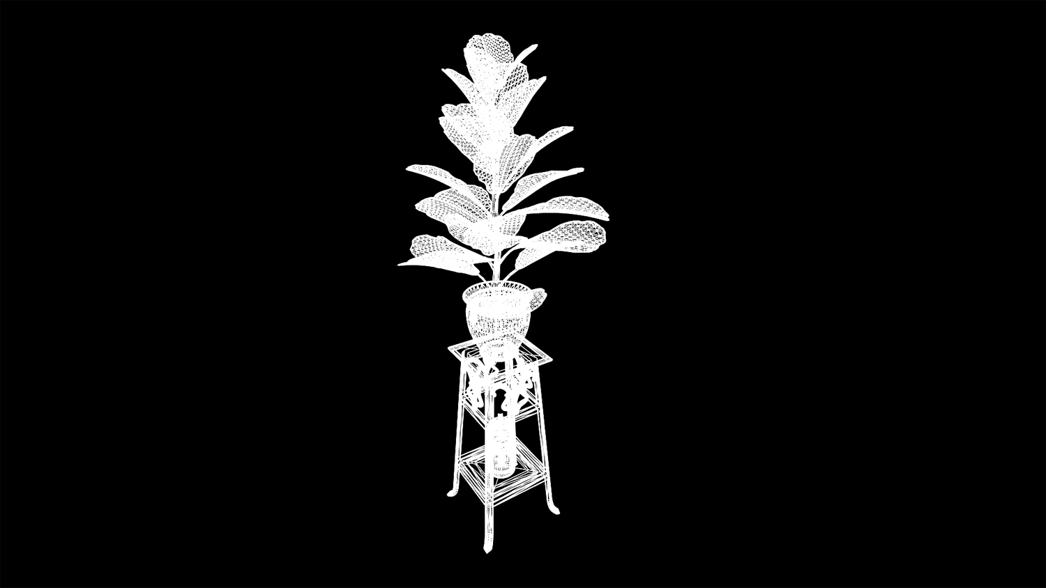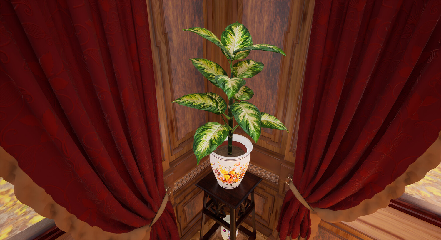 In the corners of the room, you'll find two lush houseplants: a Dieffenbachia and a Ficus, each placed in detailed ceramic planters with meadow-flower motifs. These touches of greenery soften the space and bring natural elegance.
