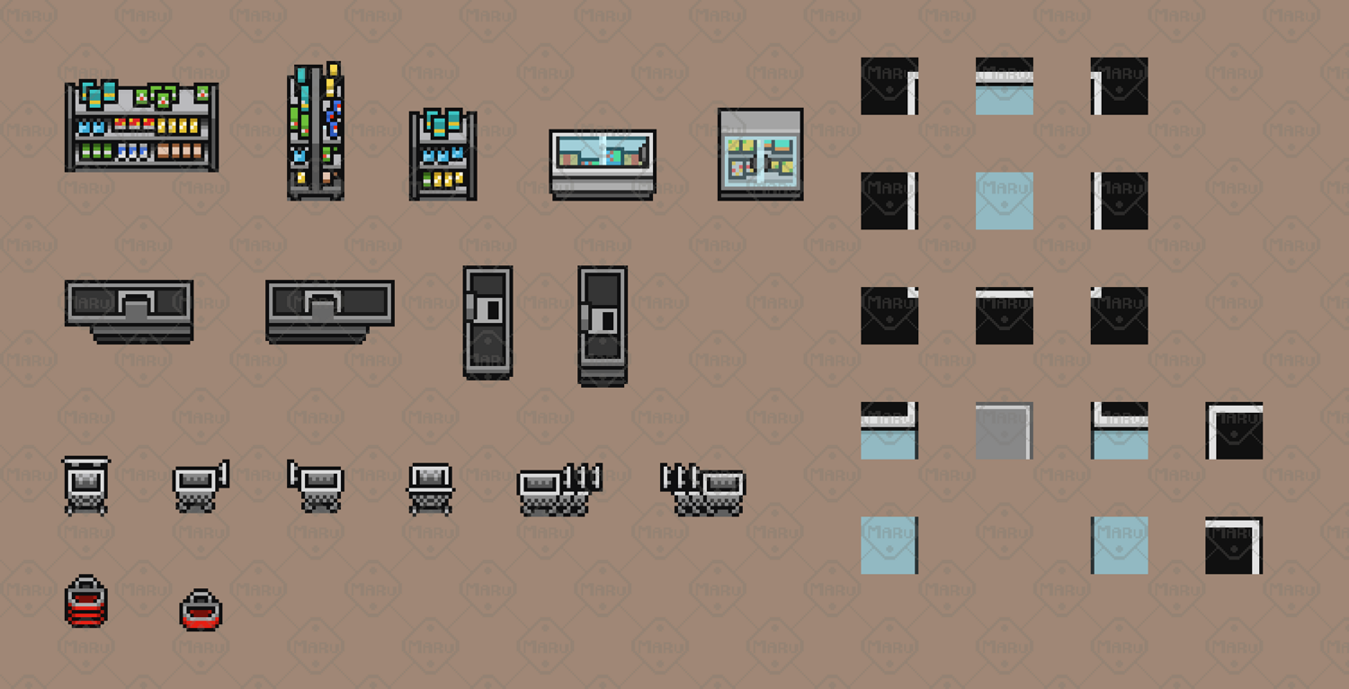 Features 16x16 top‑down pixel art Modular tiles for flexible store layouts Shelves, products, fridges, freezers, counters, registers Walls, floors, signage, decorative elements Clean, cohesive palette for professional results PNG format, ready to import Ideal for developers creating supermarkets, shops, retail interiors, or story‑driven modern scenes.