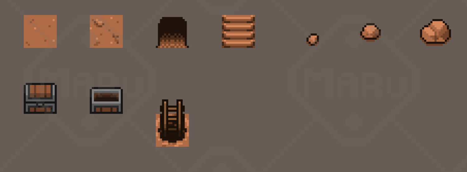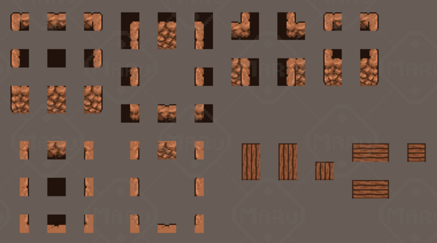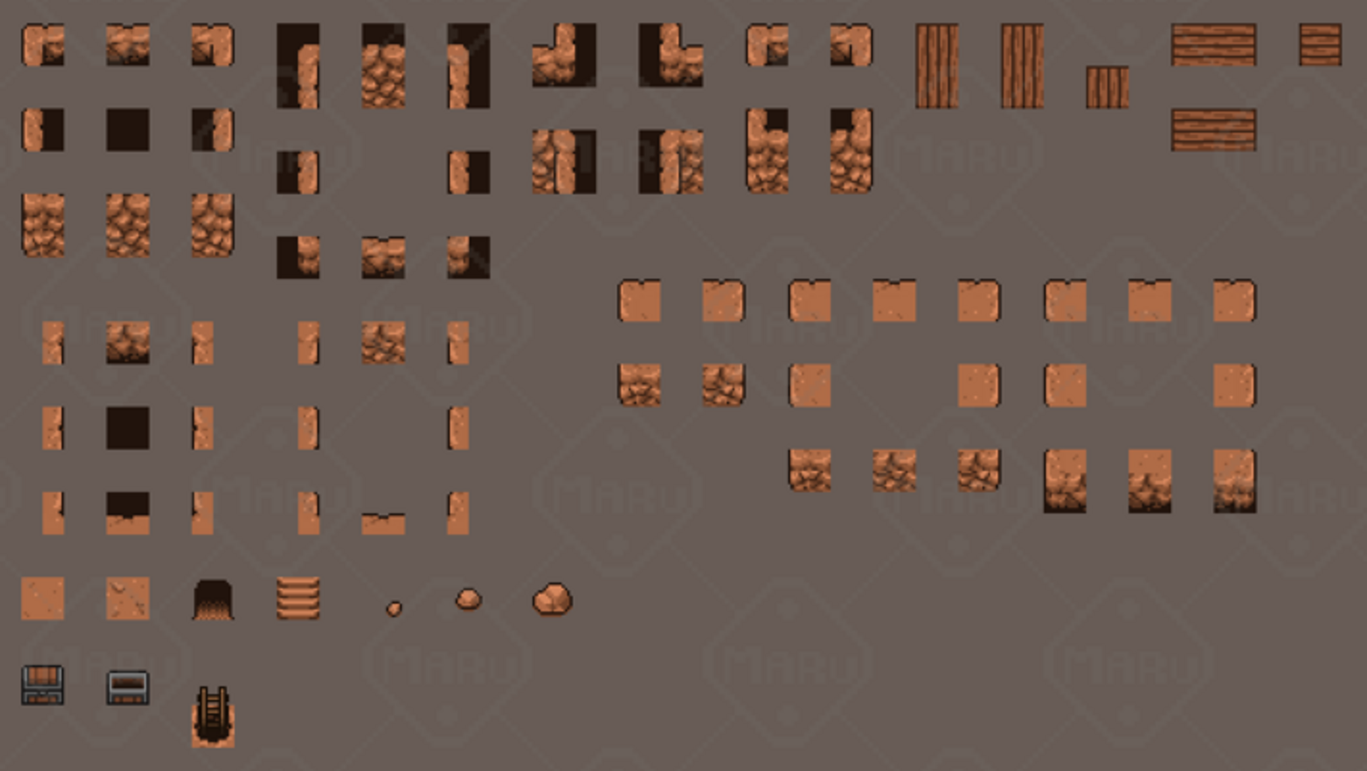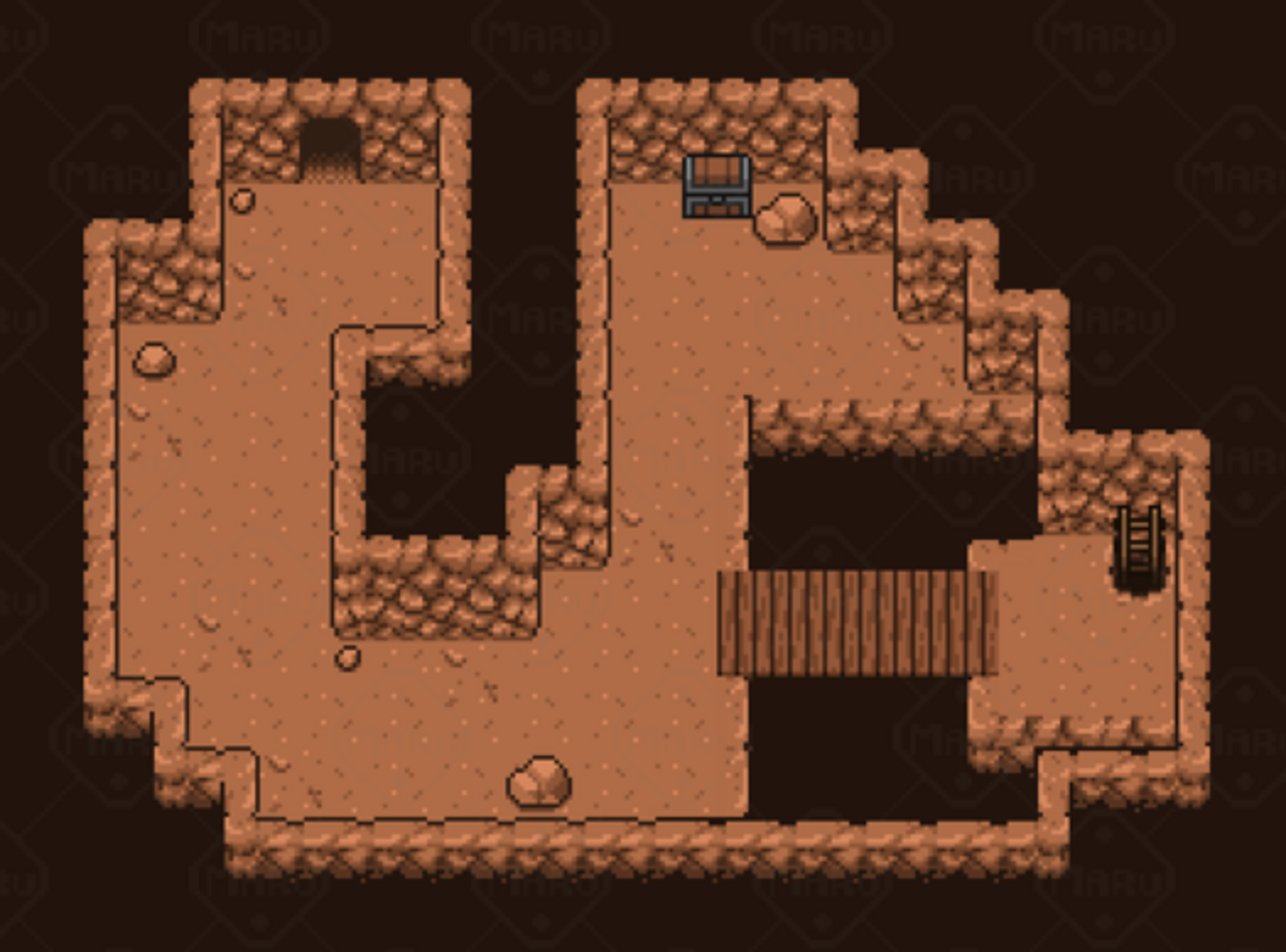 Inside the pack you will find cave walls in multiple directions, two terrain types, three rocks in different sizes, wooden planks for bridges in two directions, and a chest with open and closed versions. The tileset also includes a main cave entrance and an alternative entrance made of a pit with an internal ladder, perfect for hidden areas, mines, or secret passages.