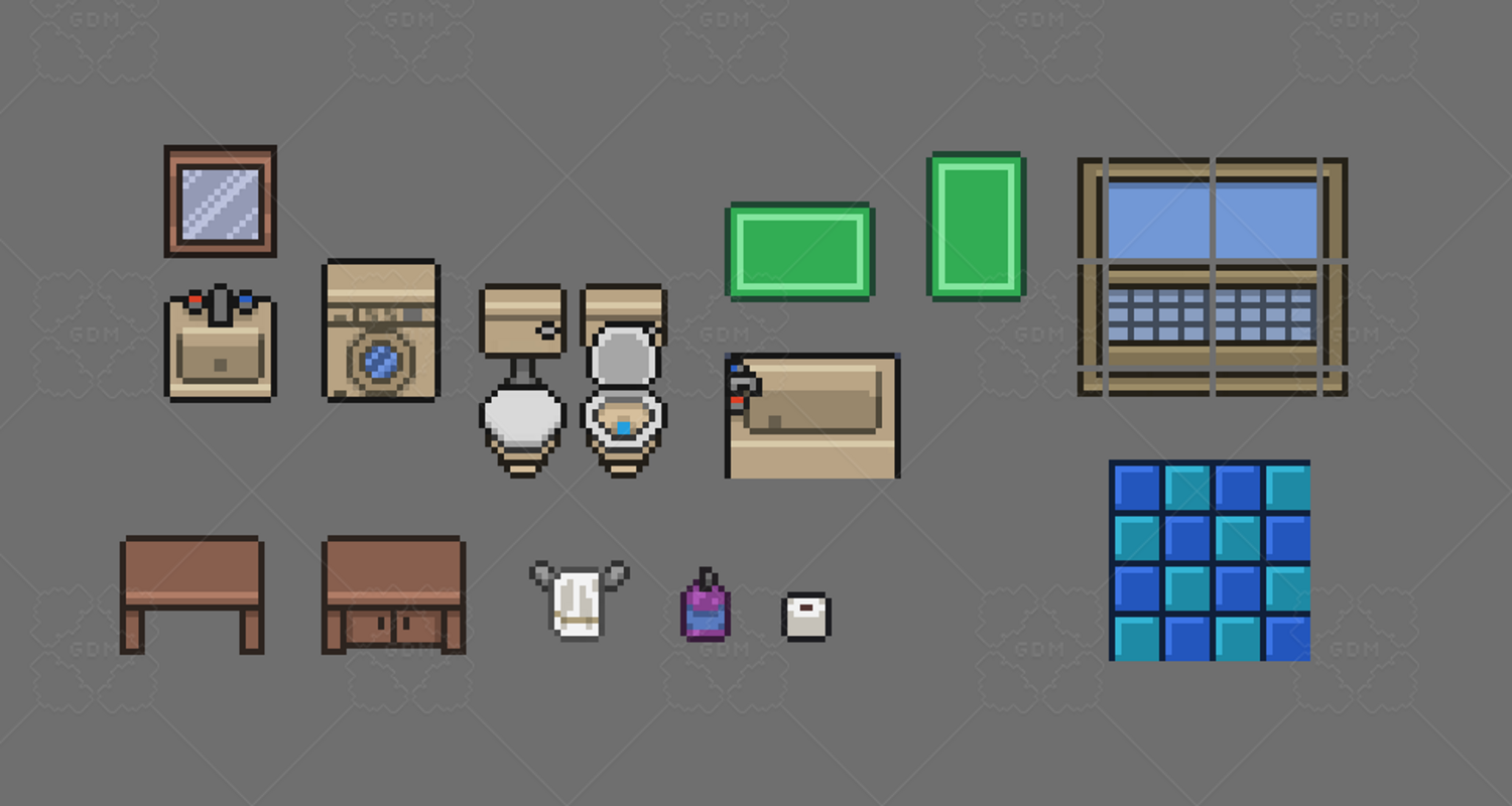 Features 16x16 top‑down pixel art Modular tiles for flexible room layouts Toilets, sinks, bathtubs, showers, mirrors, cabinets Walls, floors, and structural elements Clean, cohesive palette for professional results PNG format, ready to import Ideal for developers creating bathrooms, apartments, houses, hotels, or story‑driven indoor scenes.