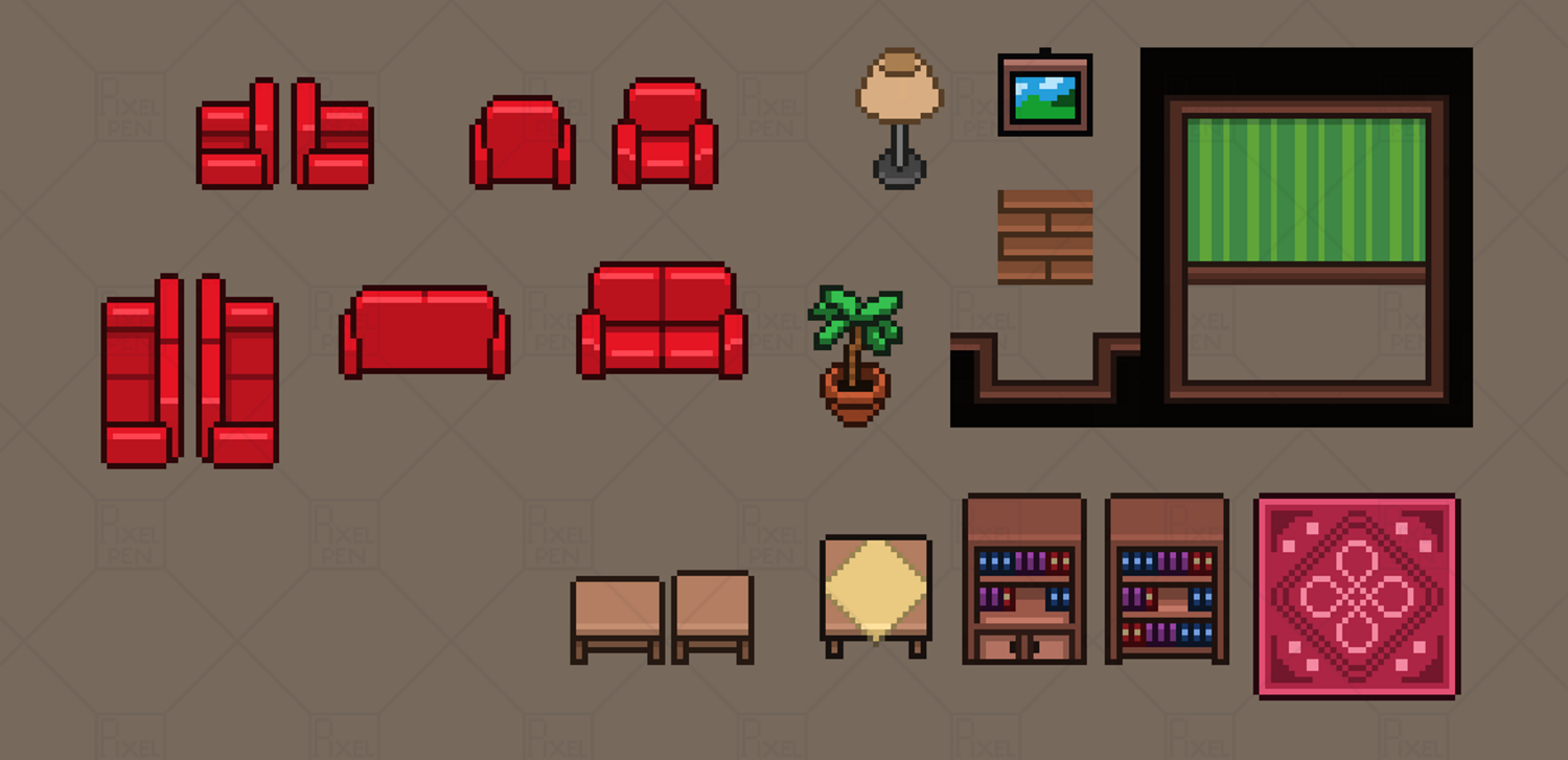 Features 16x16 top‑down pixel art Modular tiles for flexible room layouts Sofas, armchairs, coffee tables, rugs, shelves, decor Walls, floors, and structural elements Clean, cohesive palette for professional results PNG format, ready to import Ideal for developers creating living rooms, apartments, houses, hotels, or story‑driven indoor scenes.