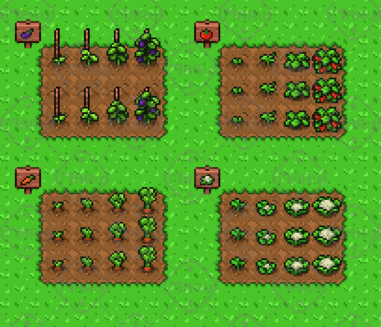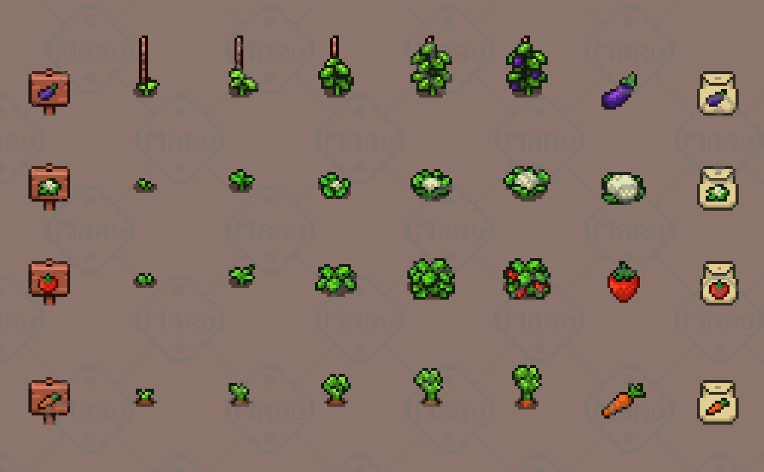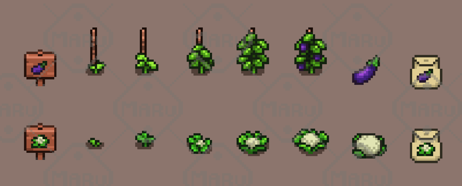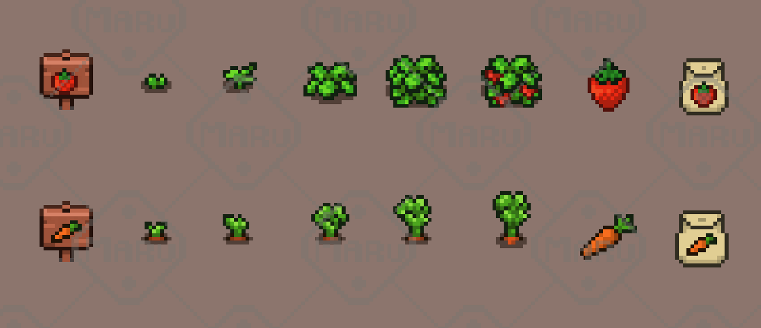 Includes 4 crop types: Carrot, Eggplant, Cauliflower, Strawberry Top-down crop sprites Matching item icons (inventory-ready) Wooden signs for crop identification Highlights Game-ready assets Consistent top-down perspective Clean and readable pixel art style Suitable for farming, RPG, and simulation games