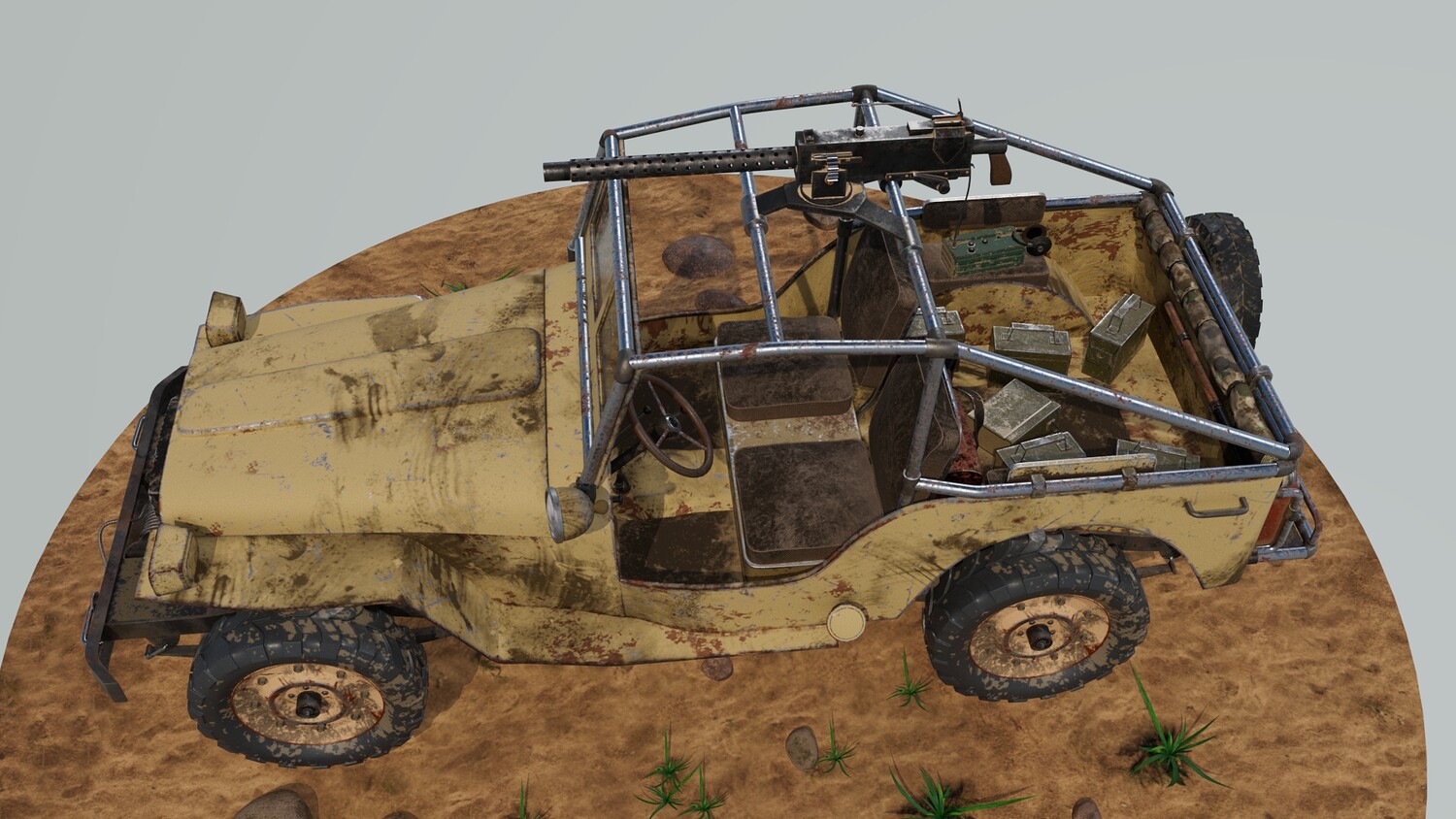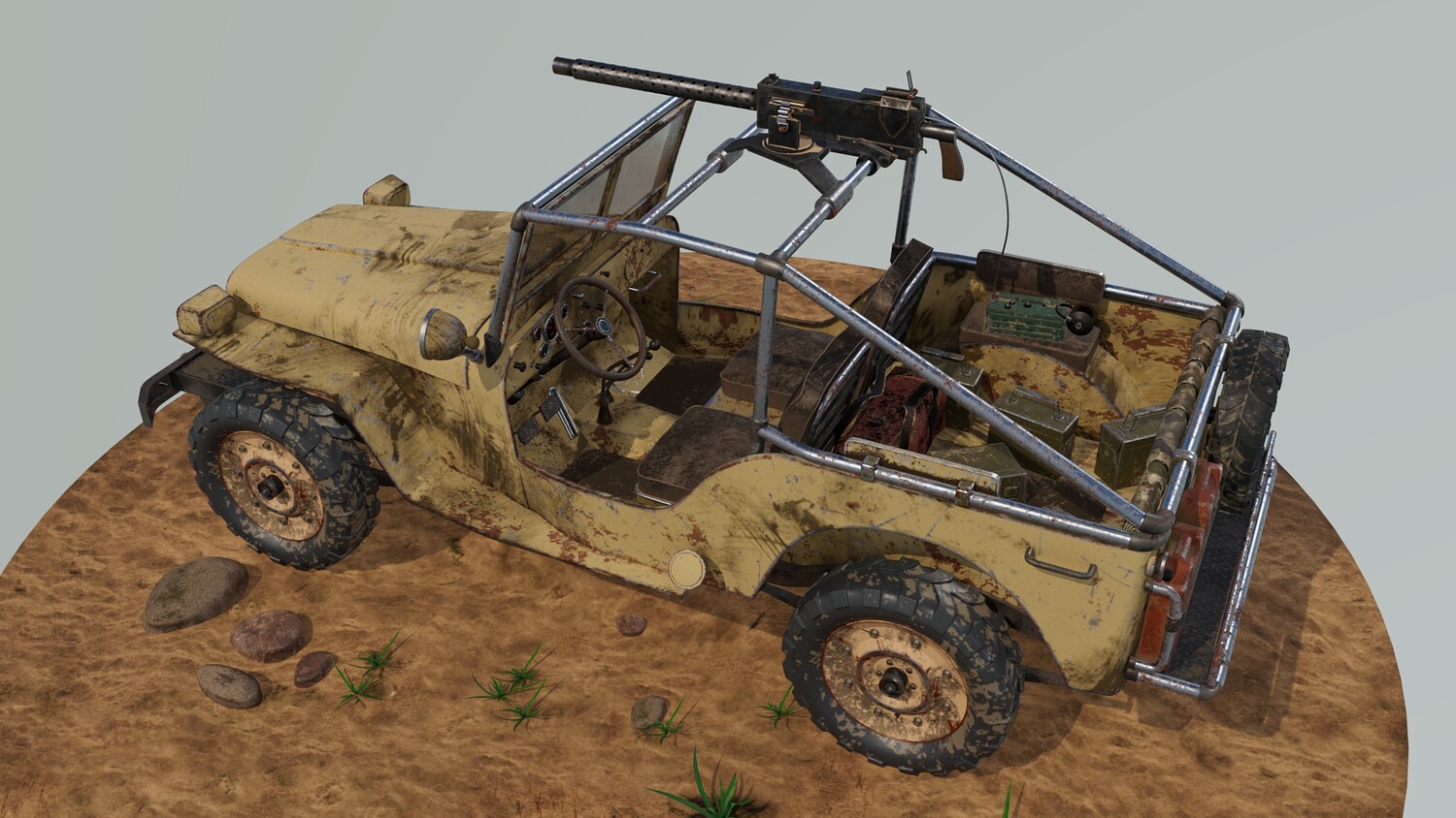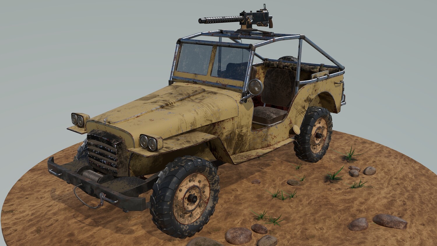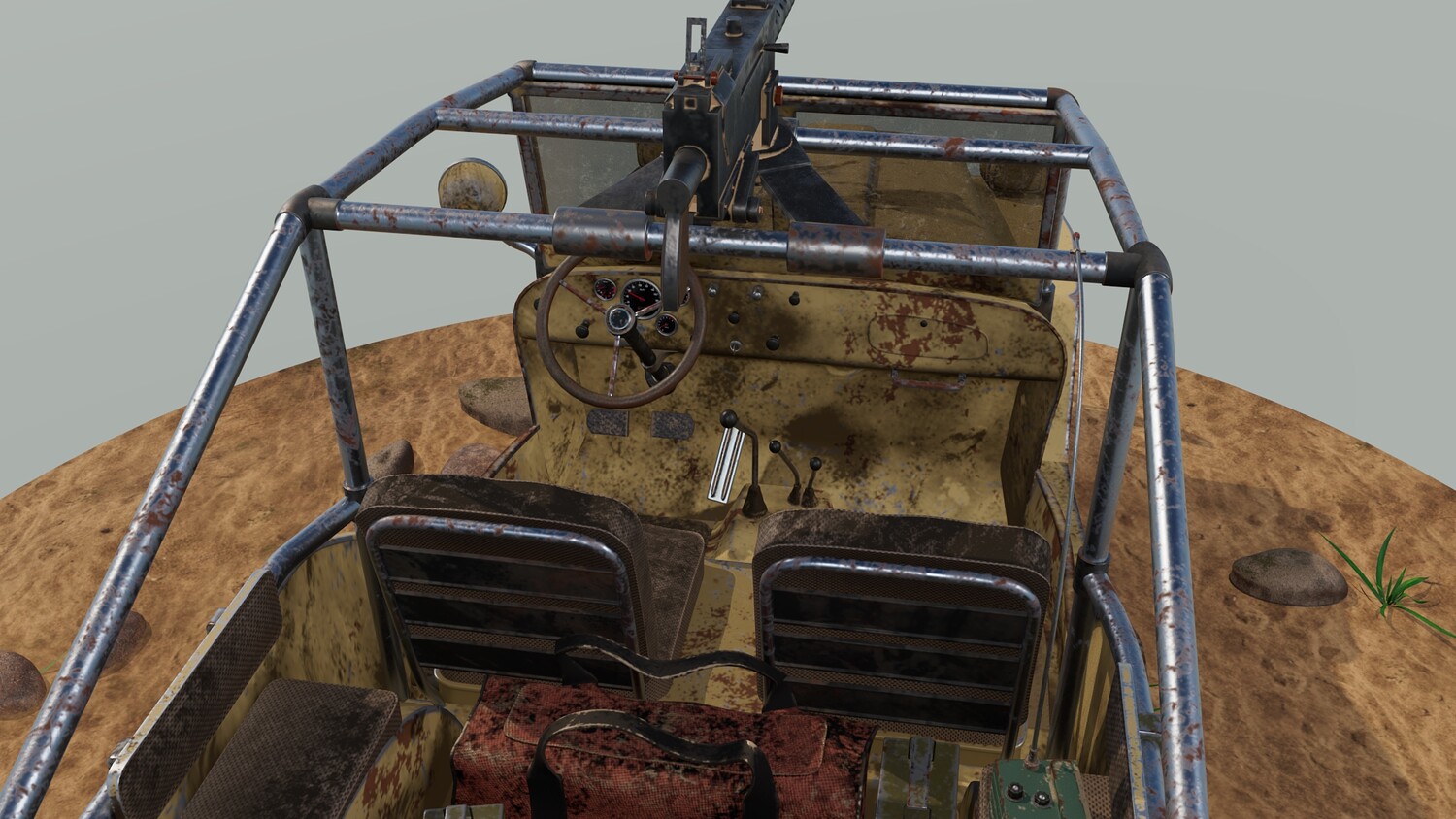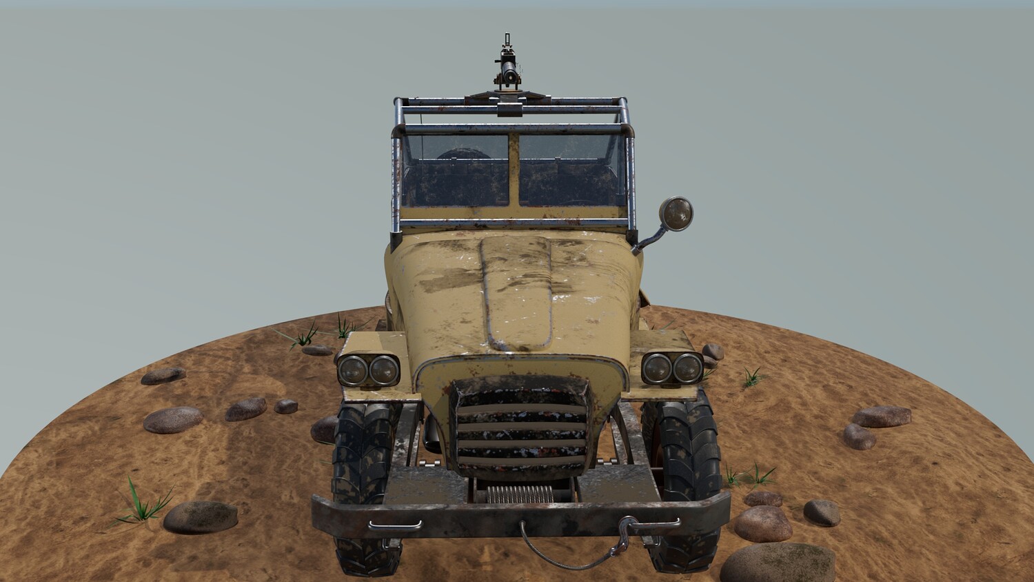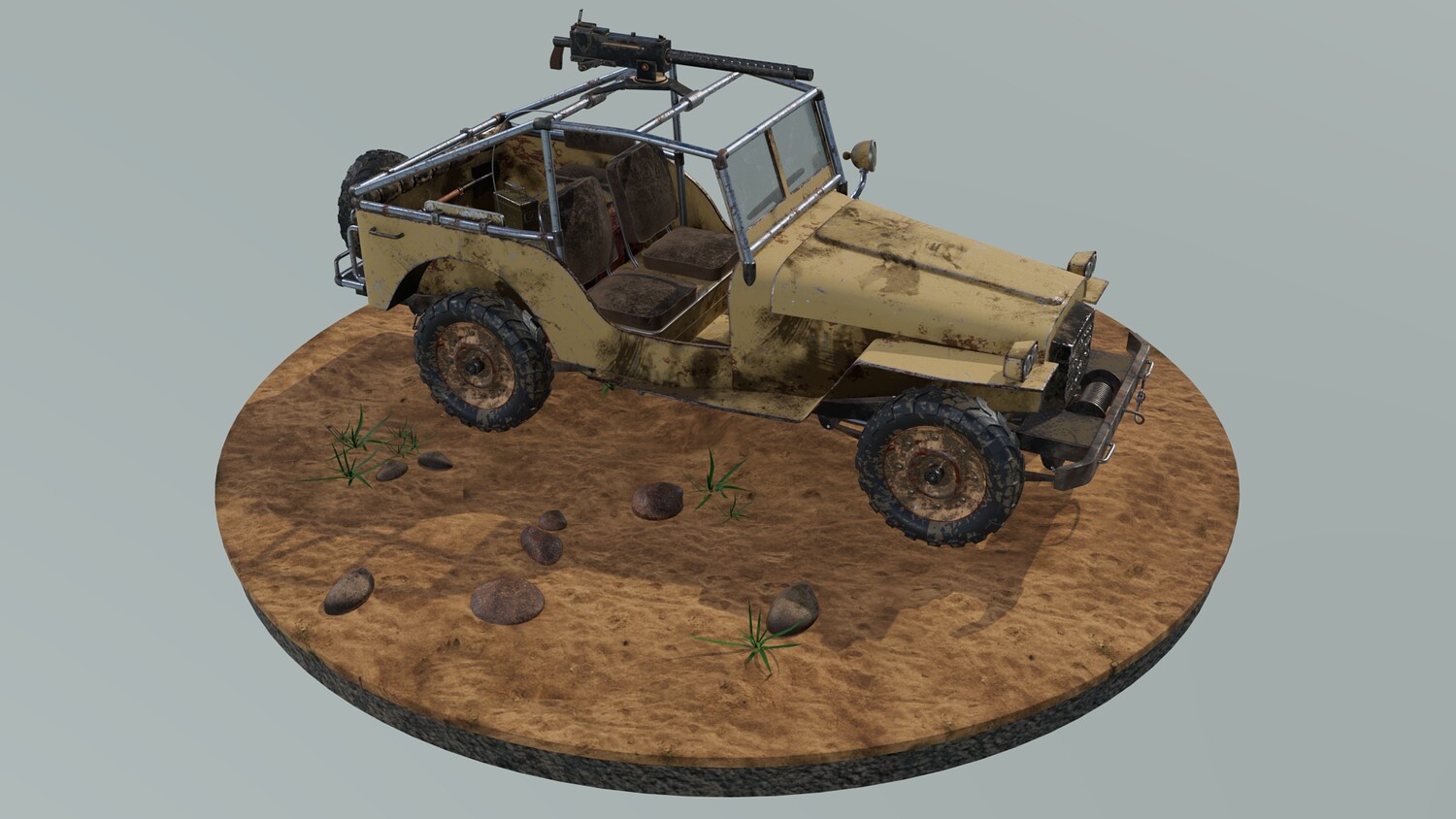 The Survivalist scene consists of a car model and a stand model. The models were created in the 3D editor Maya. Textures were created in Substance Painter. Render was used by Arnold. The car model is divided into 5 sets, which are assigned different materials. All textures are loaded in one folder.