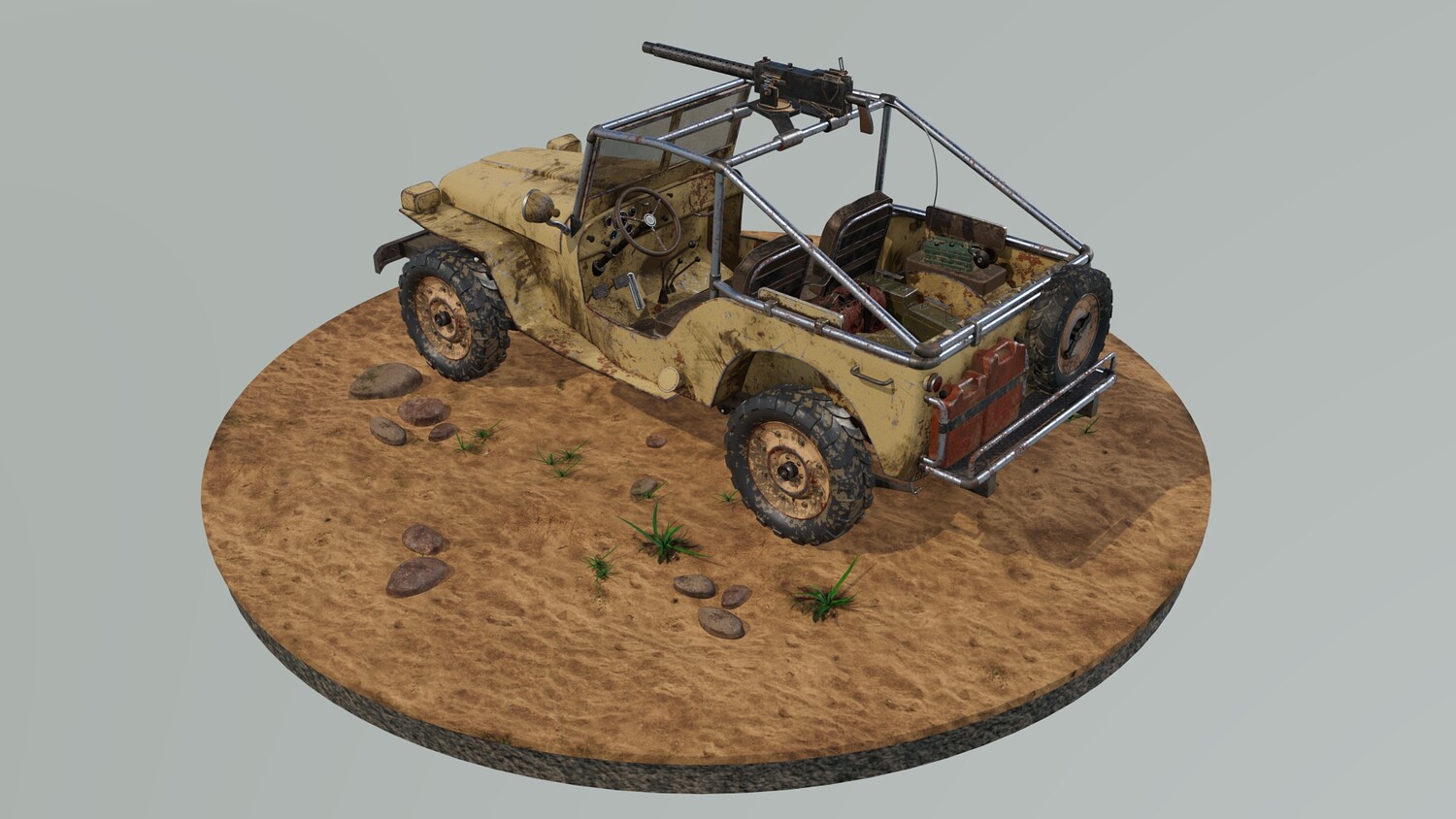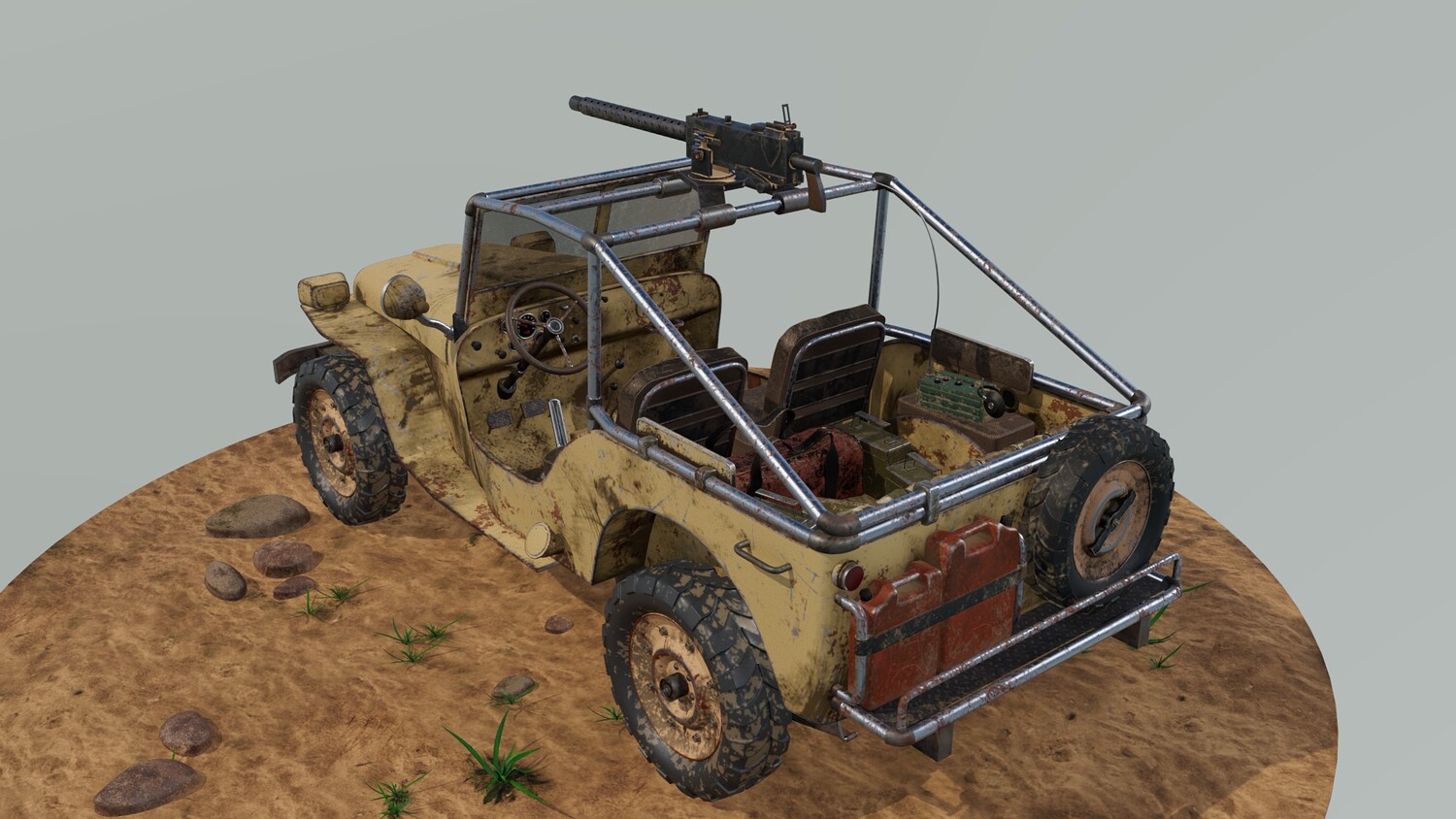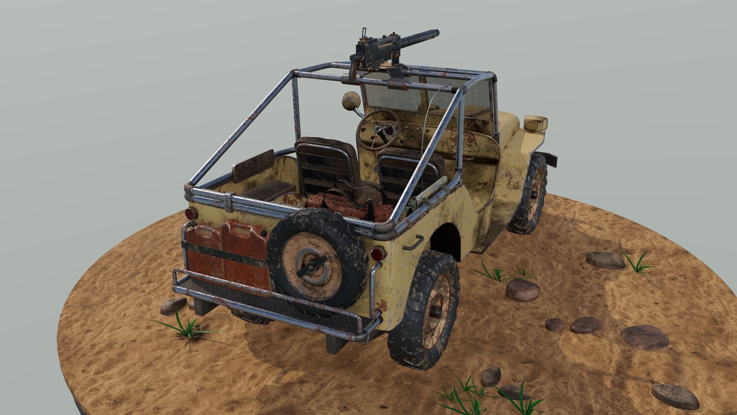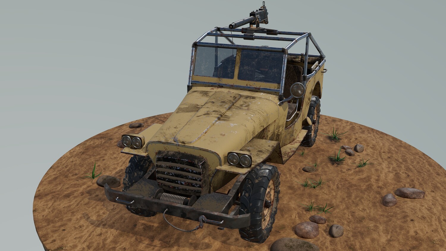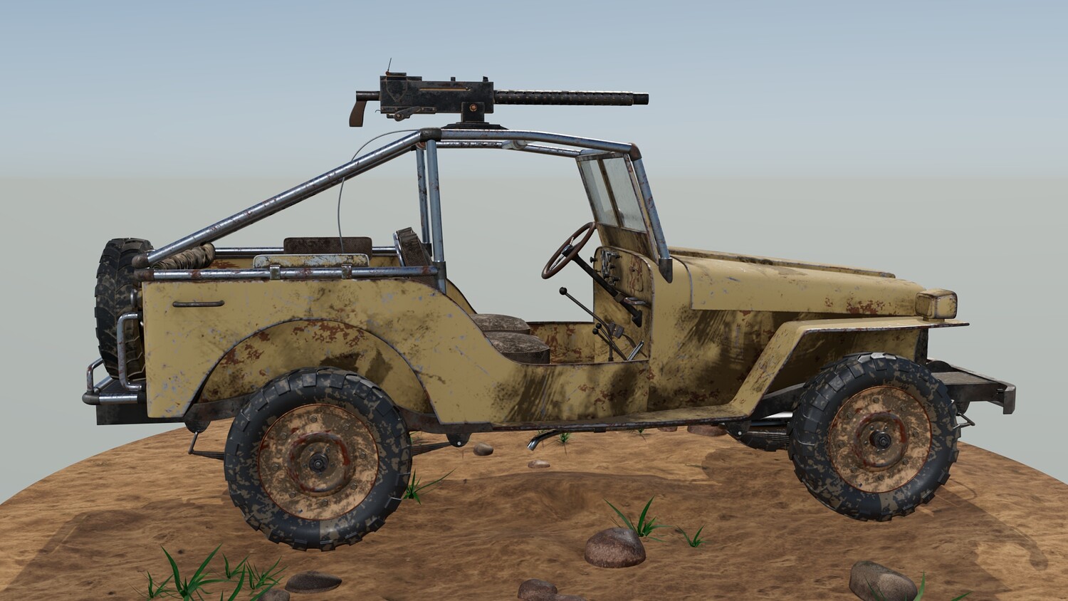 The Survivalist scene consists of a car model and a stand model. The models were created in the 3D editor Maya. Textures were created in Substance Painter. Render was used by Arnold. The car model is divided into 5 sets, which are assigned different materials. All textures are loaded in one folder.
