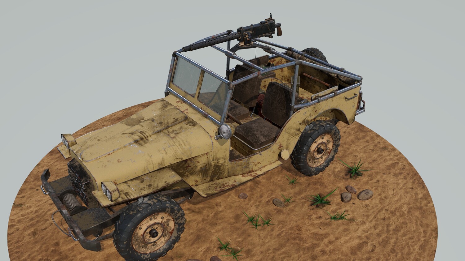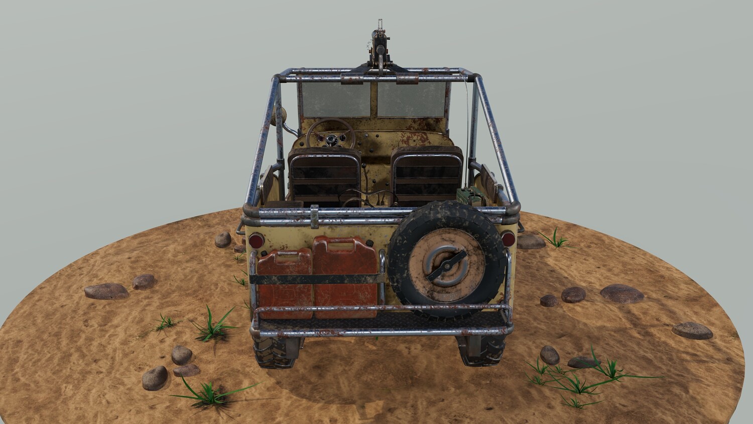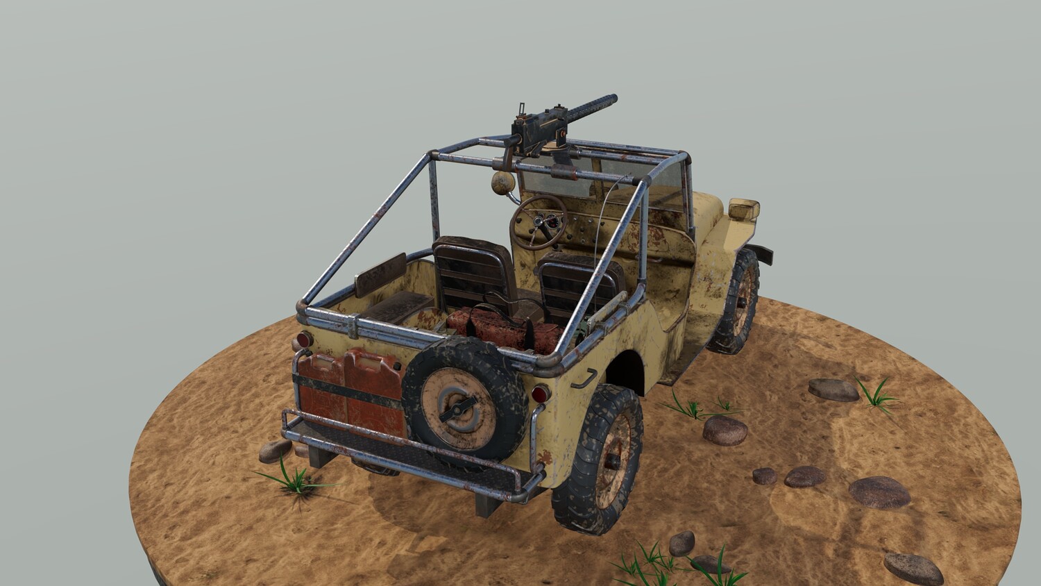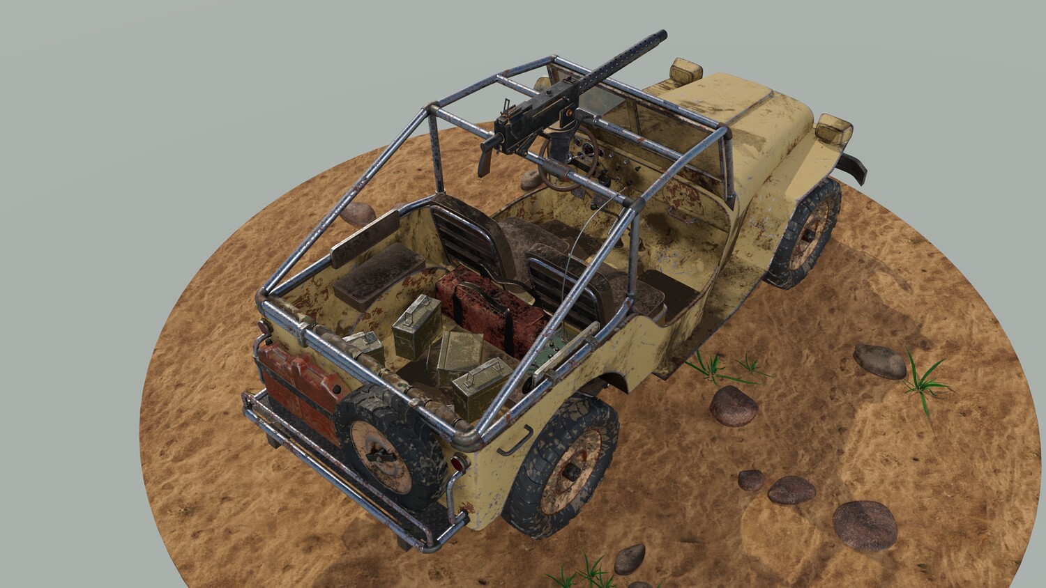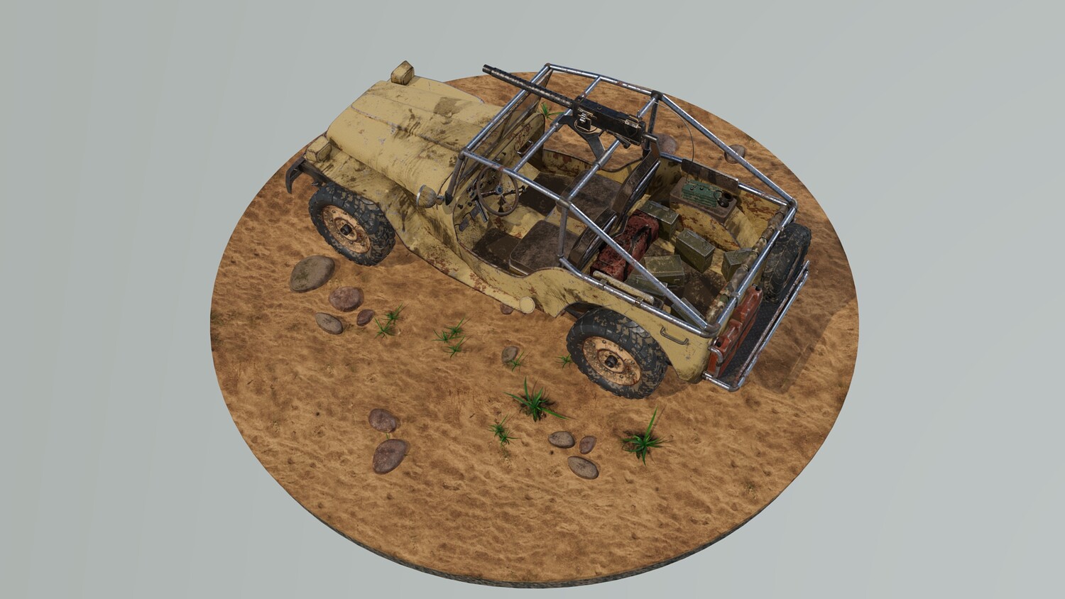 The Survivalist scene consists of a car model and a stand model. The models were created in the 3D editor Maya. Textures were created in Substance Painter. Render was used by Arnold. The car model is divided into 5 sets, which are assigned different materials. All textures are loaded in one folder.
